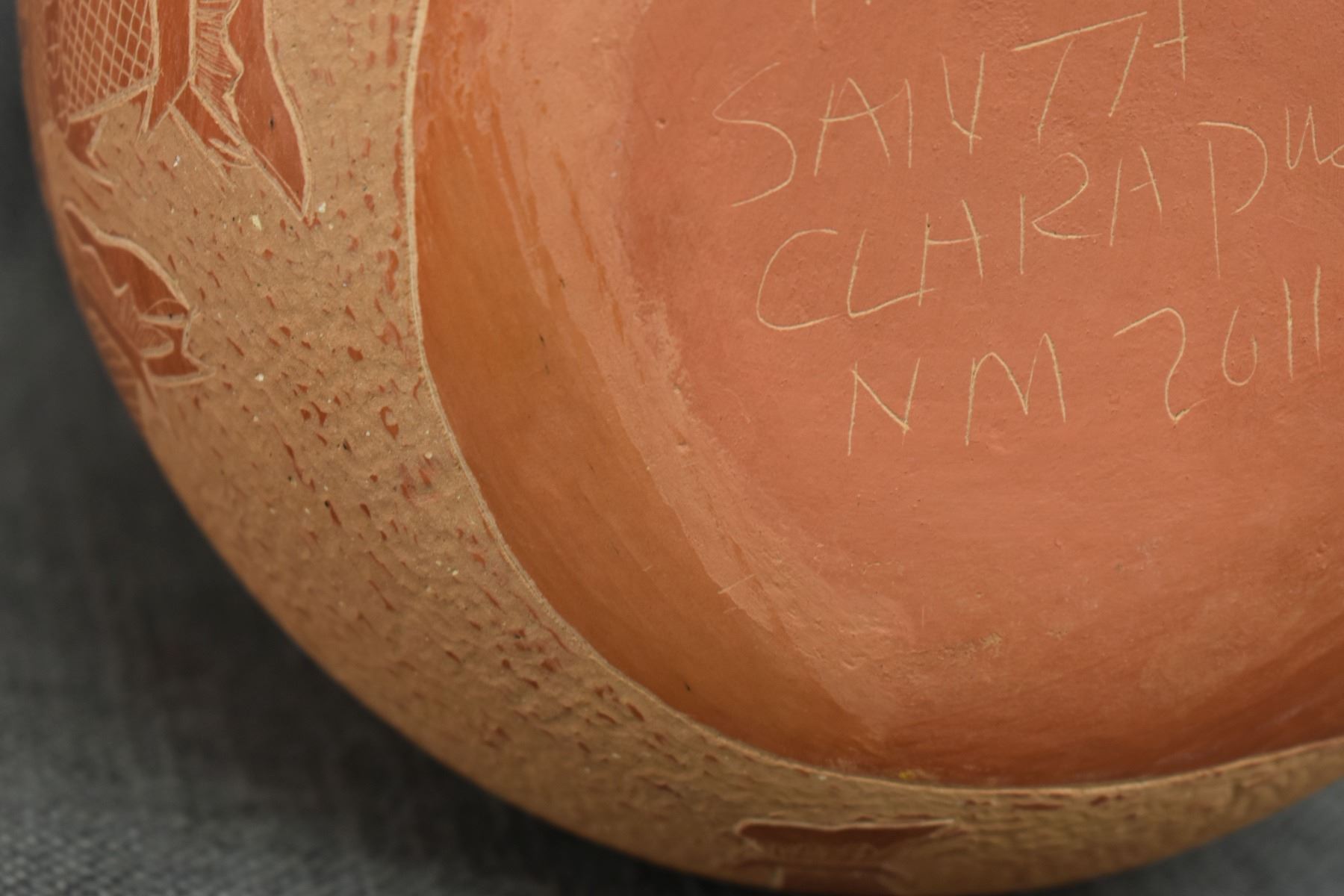 2011 Santa Clara hand coiled and sgraffito design depicting dancers signed Dan Tafoya. 8.5" x 7"