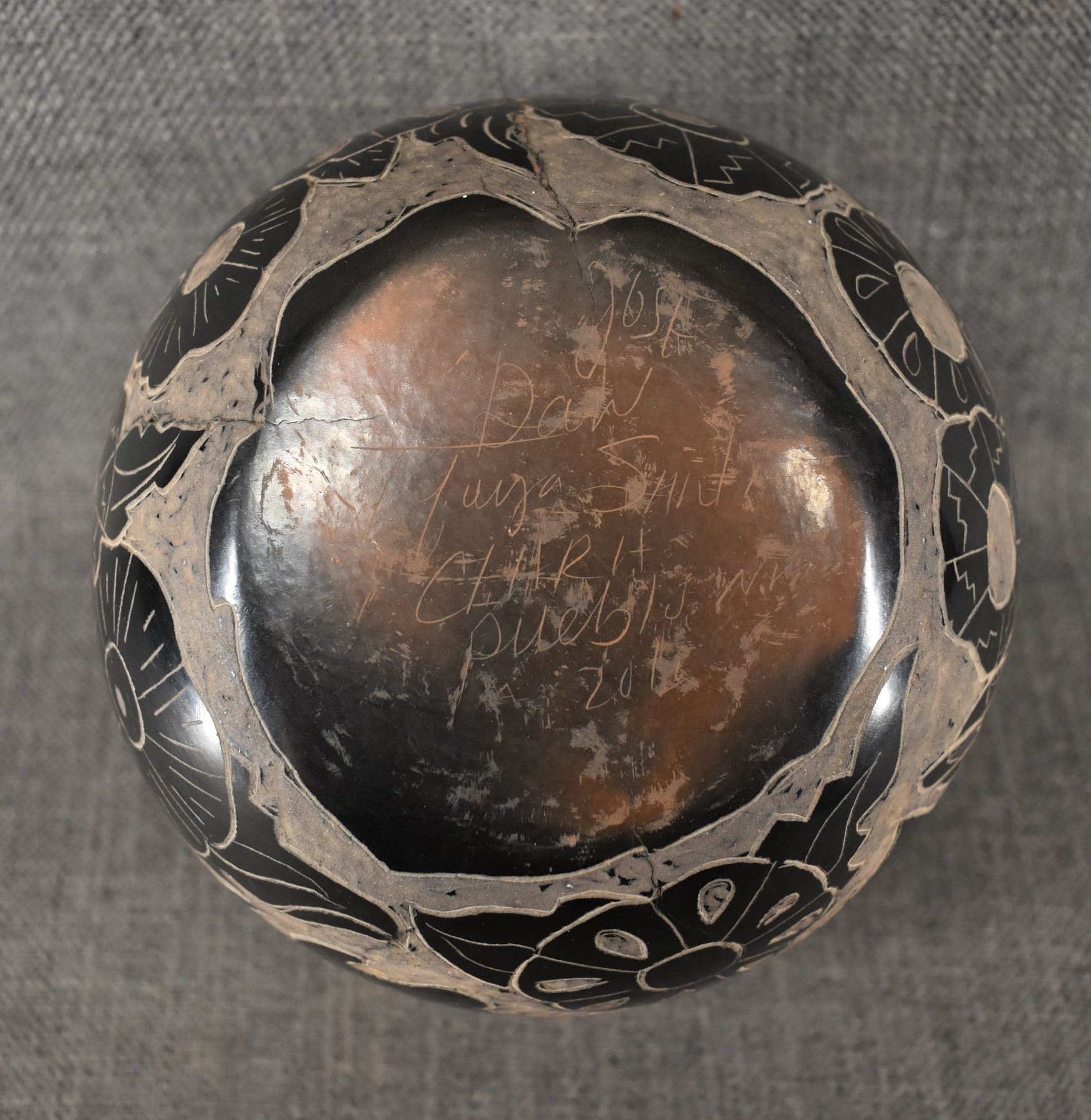 2011 Santa Clara, hand coiled with sgraffito hummingbird and floral design by Dan Tafoya, 6.75" x 6.5"