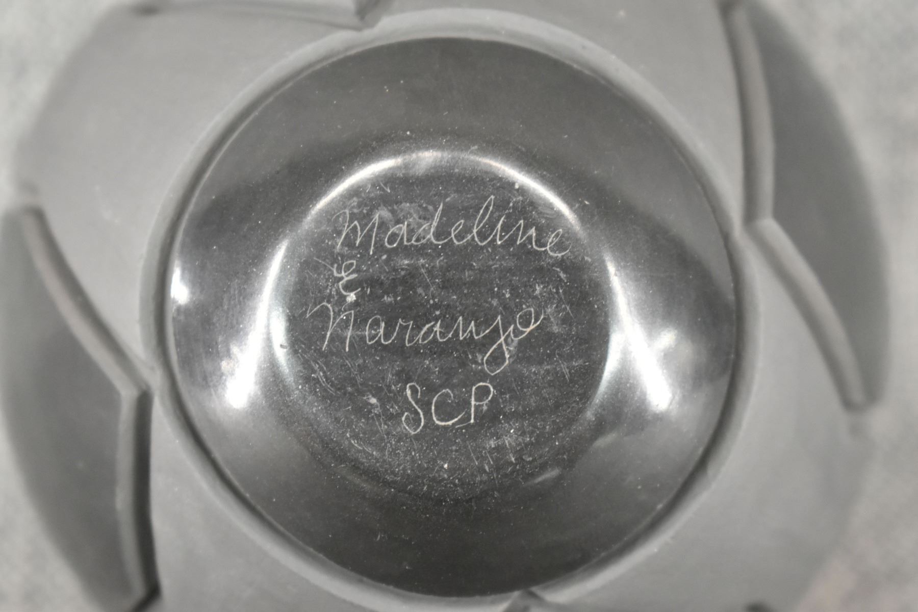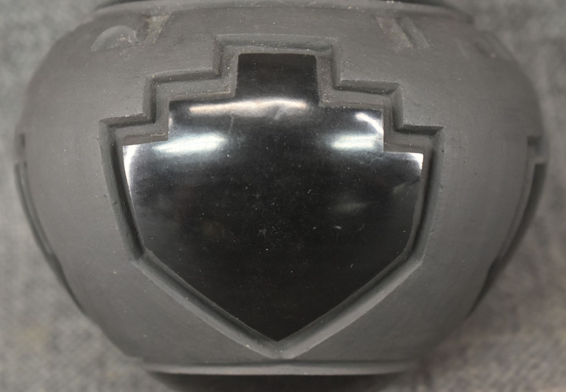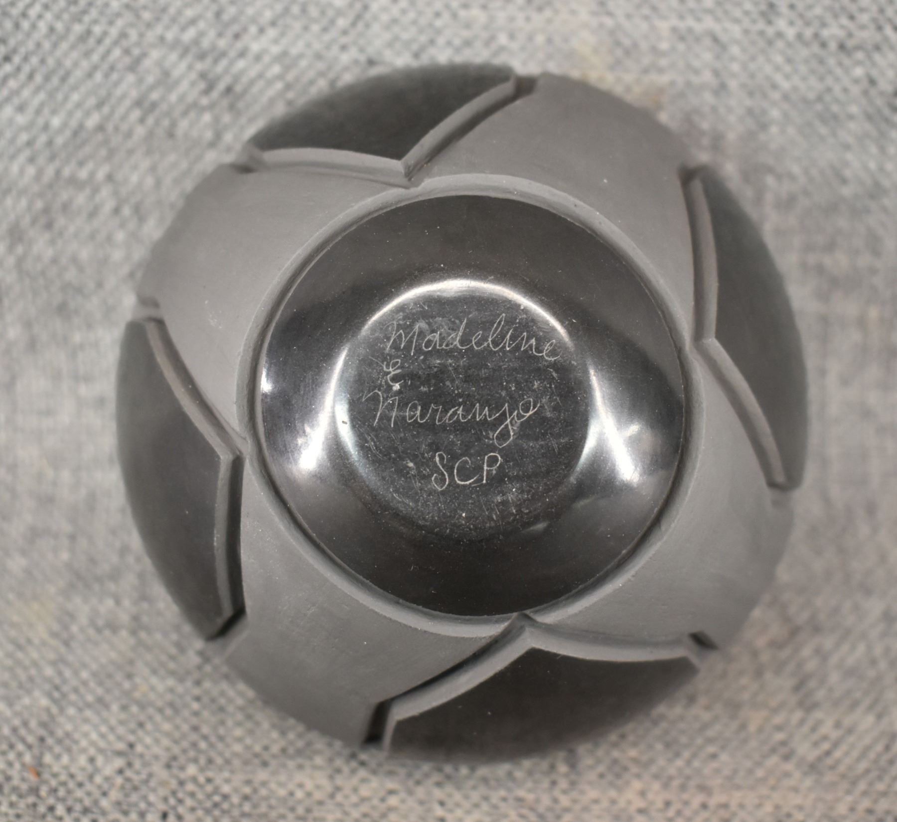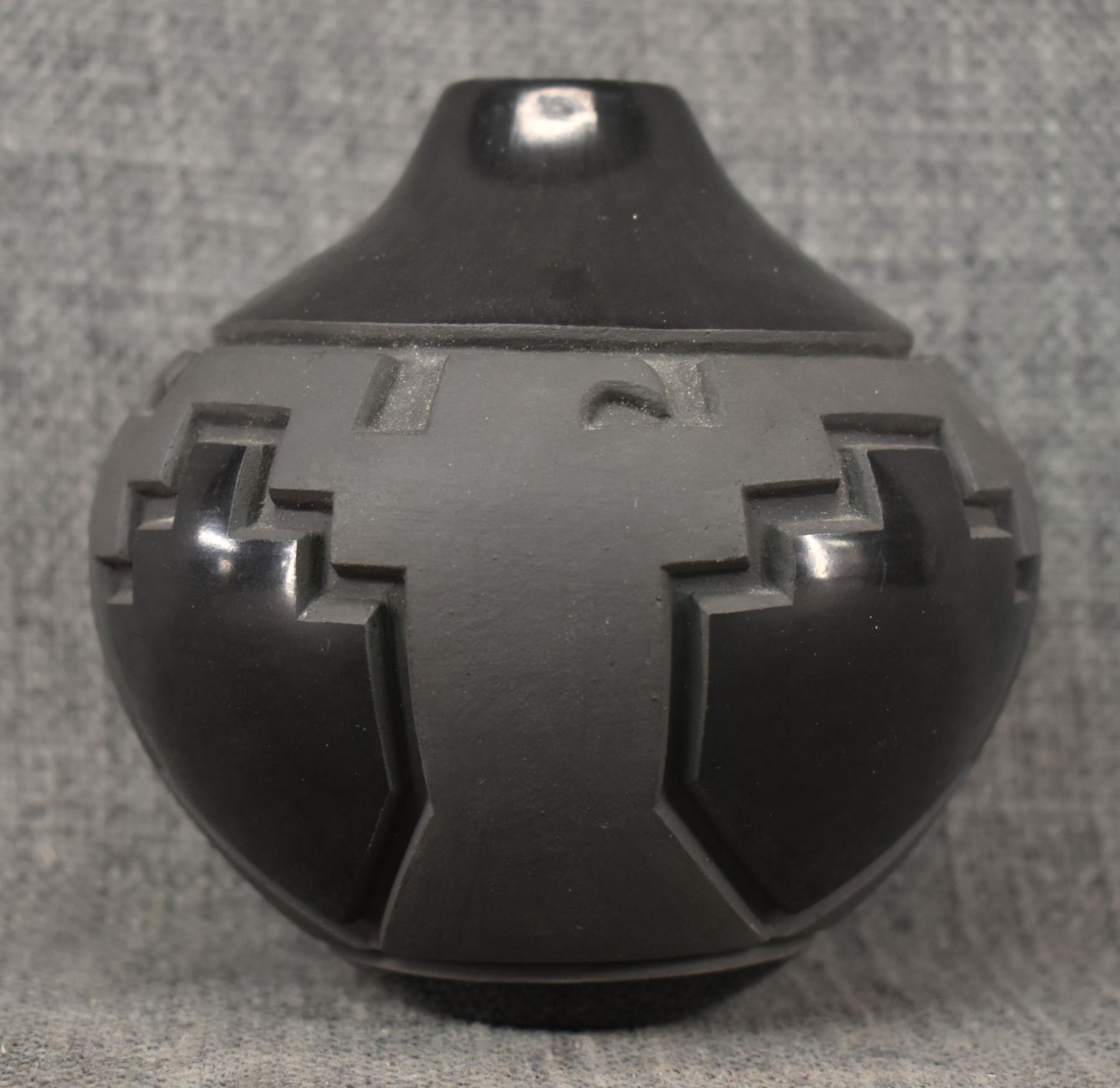 1980's Santa Clara. Hand coiled and carved design pottery jar signed Madelin Naranjo. 4.25" x 4"