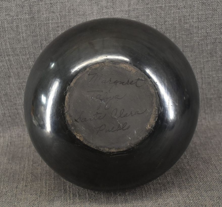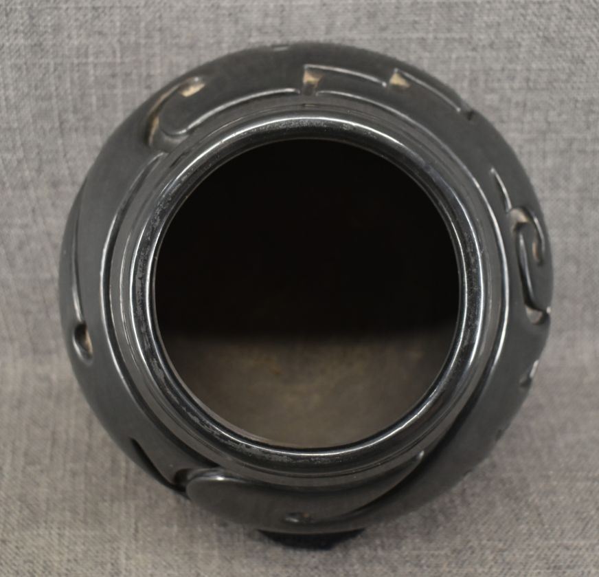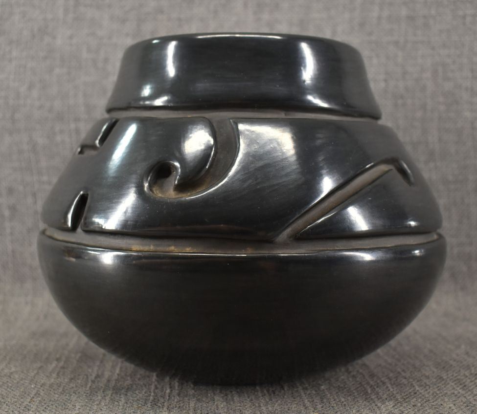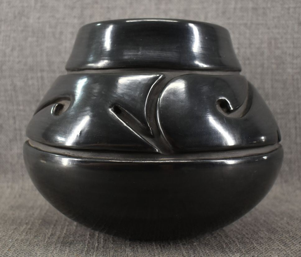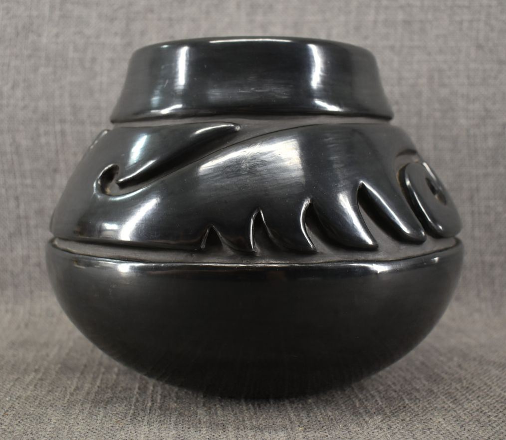 1970's Santa Clara. Hand coiled and carved design pottery vase. 7'' x 9''