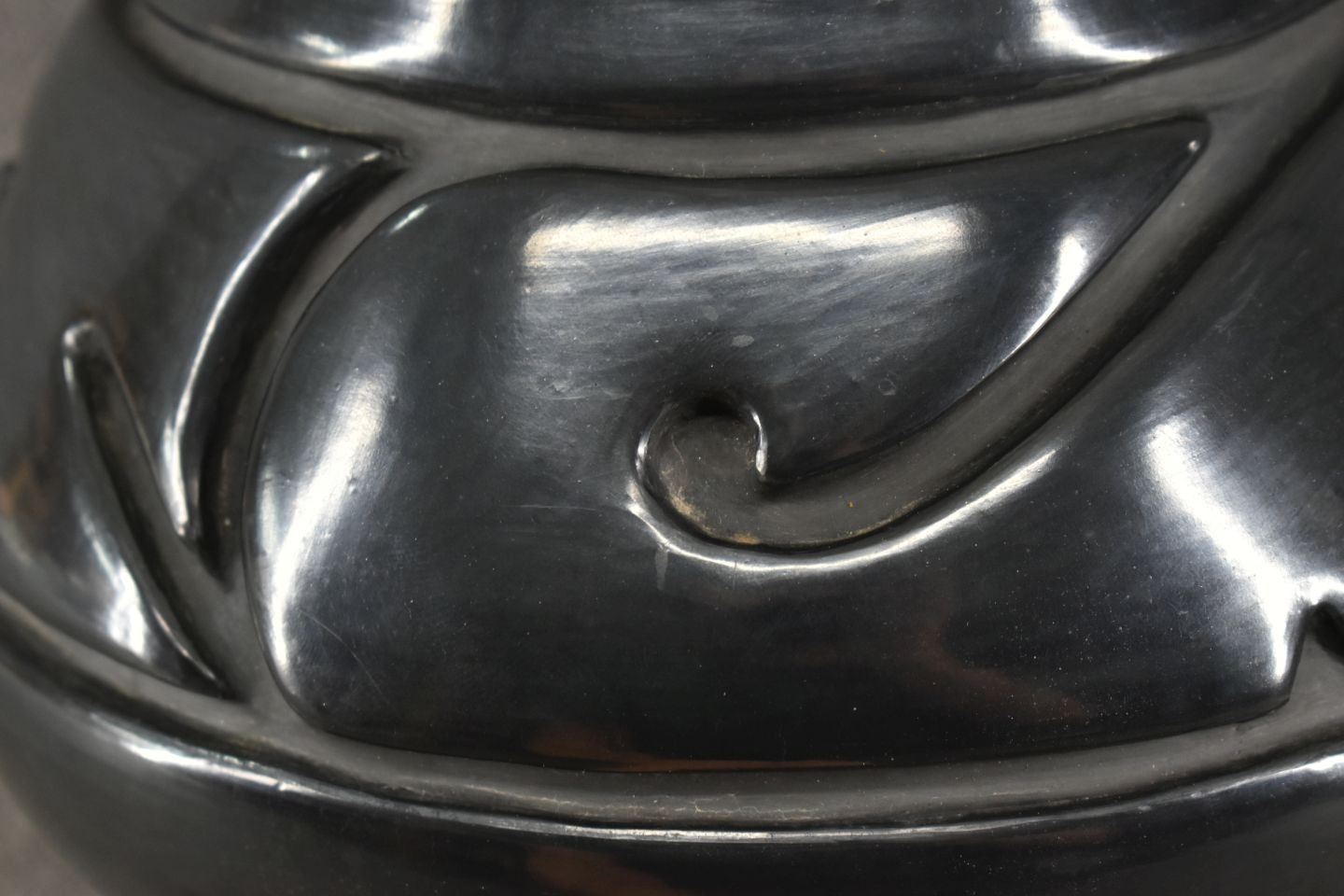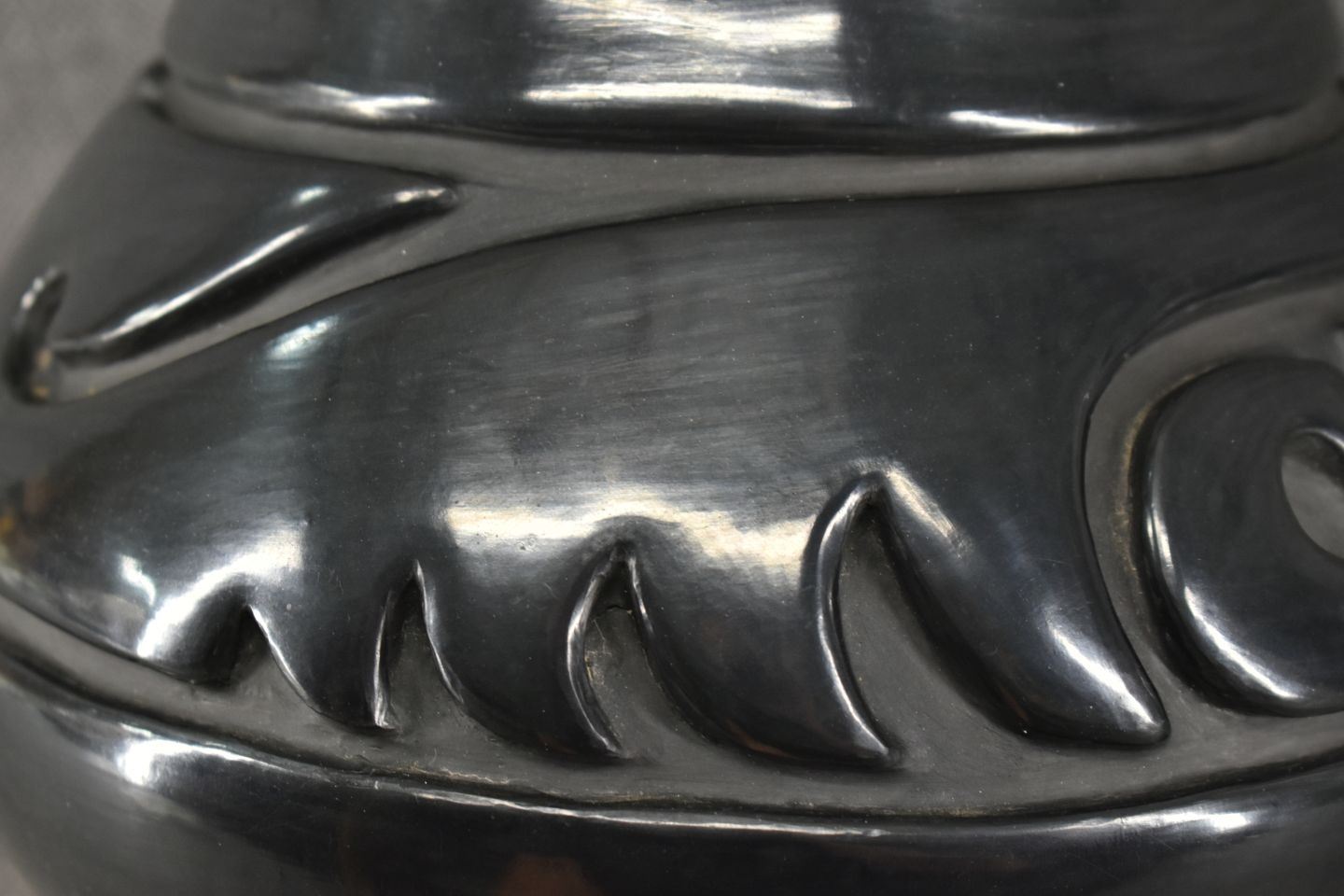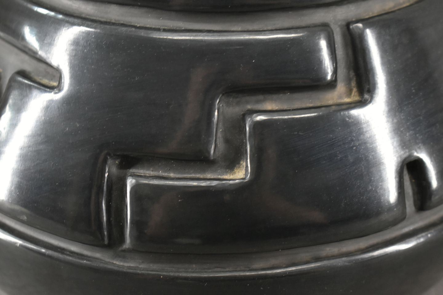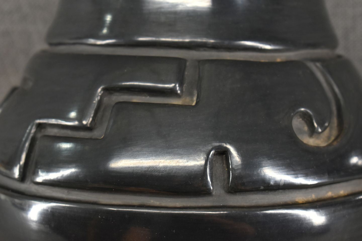 1970's Santa Clara. Hand coiled and carved design pottery vase. 7'' x 9''