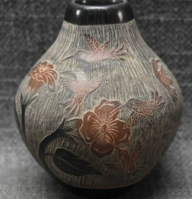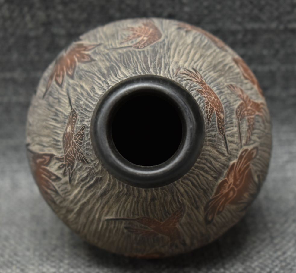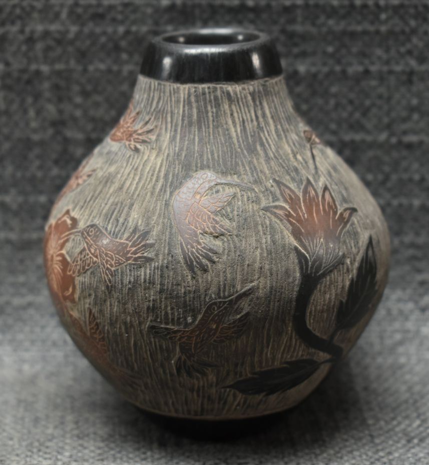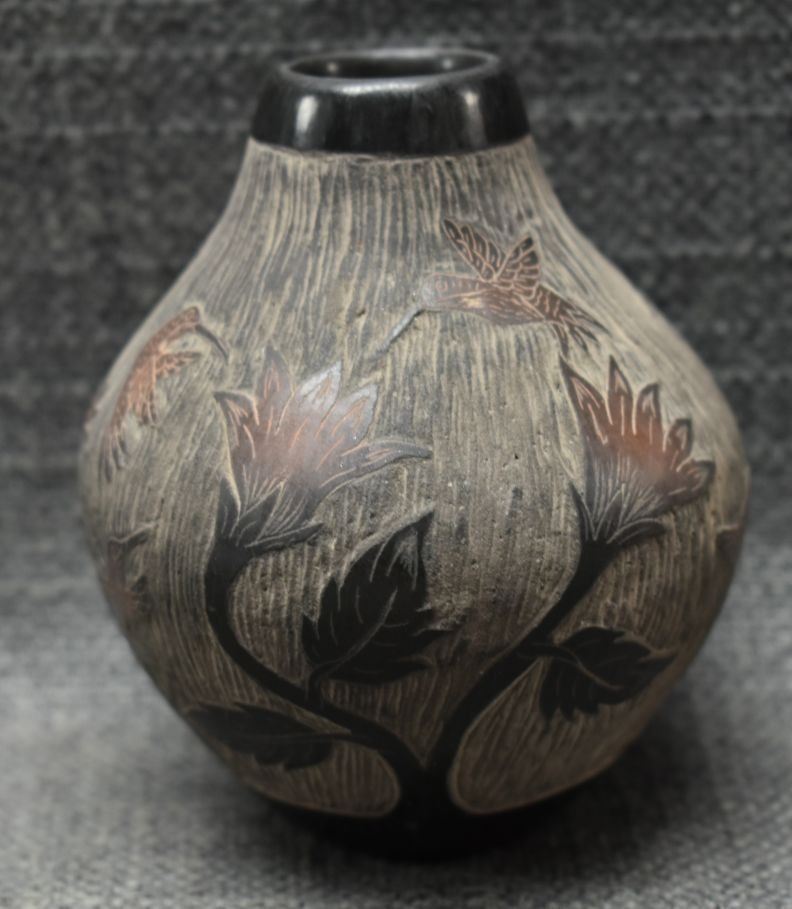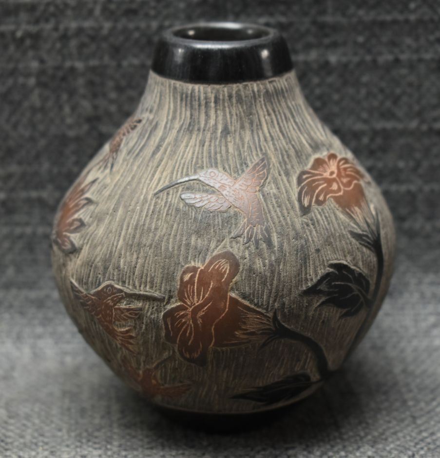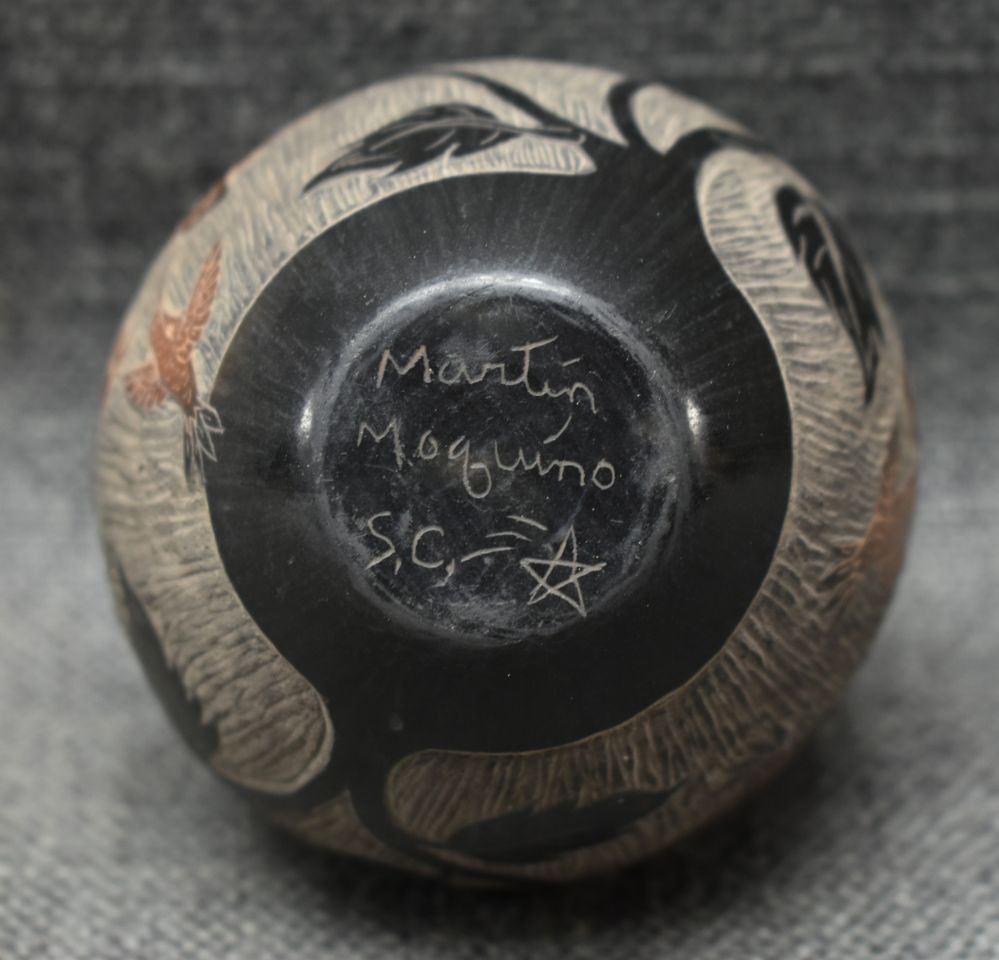 1990's Santa Clara, hand coiled with sgraffito humming bird design signed Martin Moquino 4" x 3"