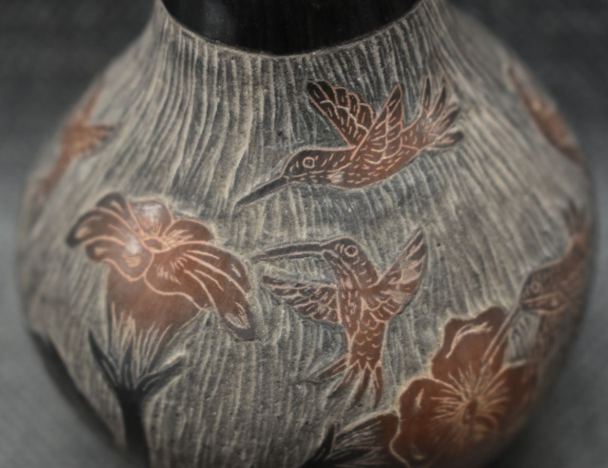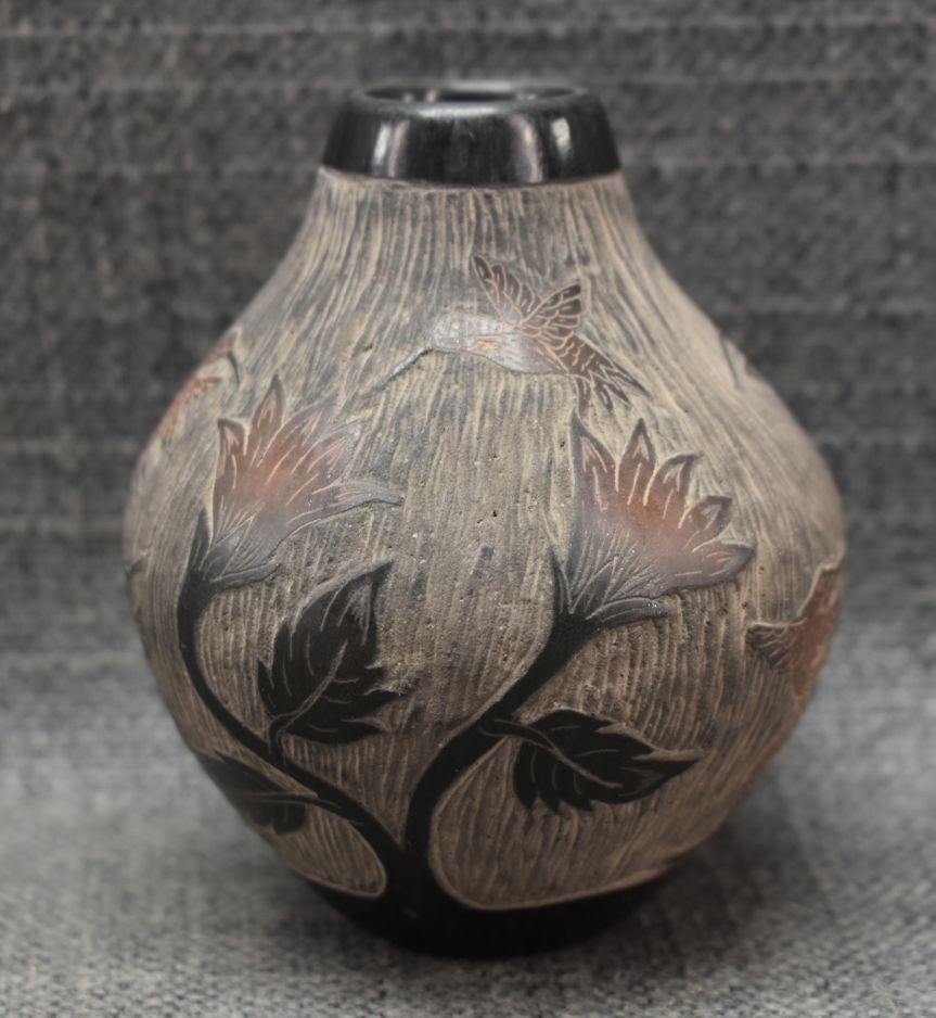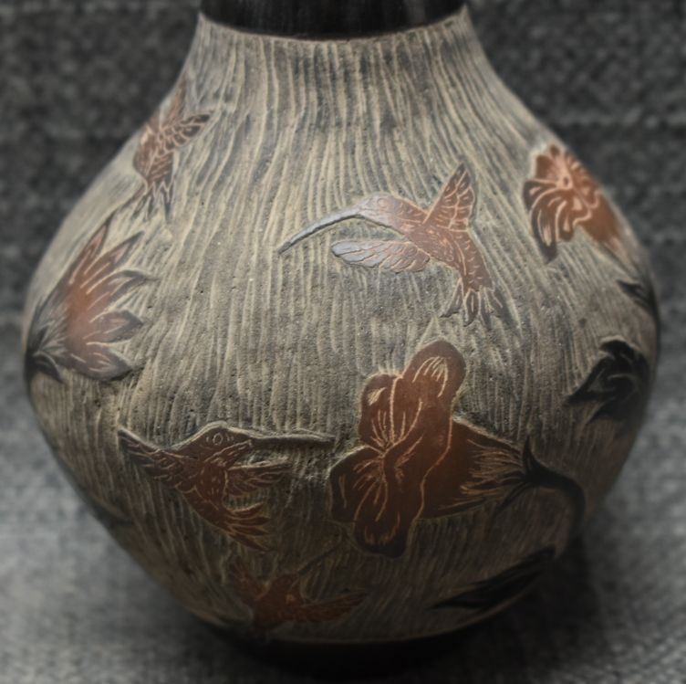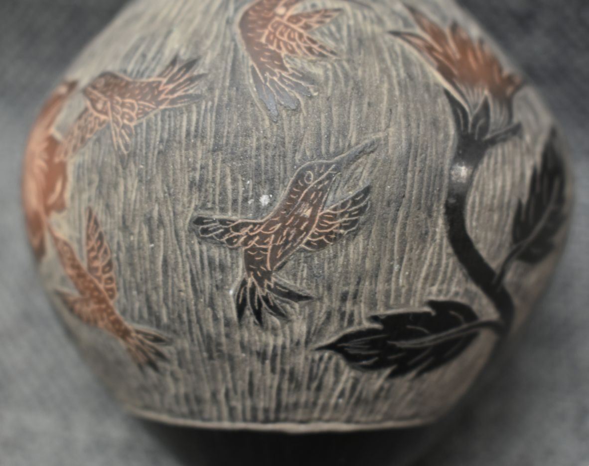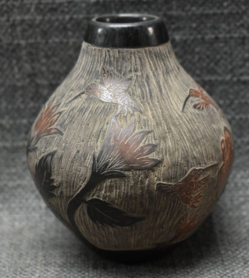 1990's Santa Clara, hand coiled with sgraffito humming bird design signed Martin Moquino 4" x 3"