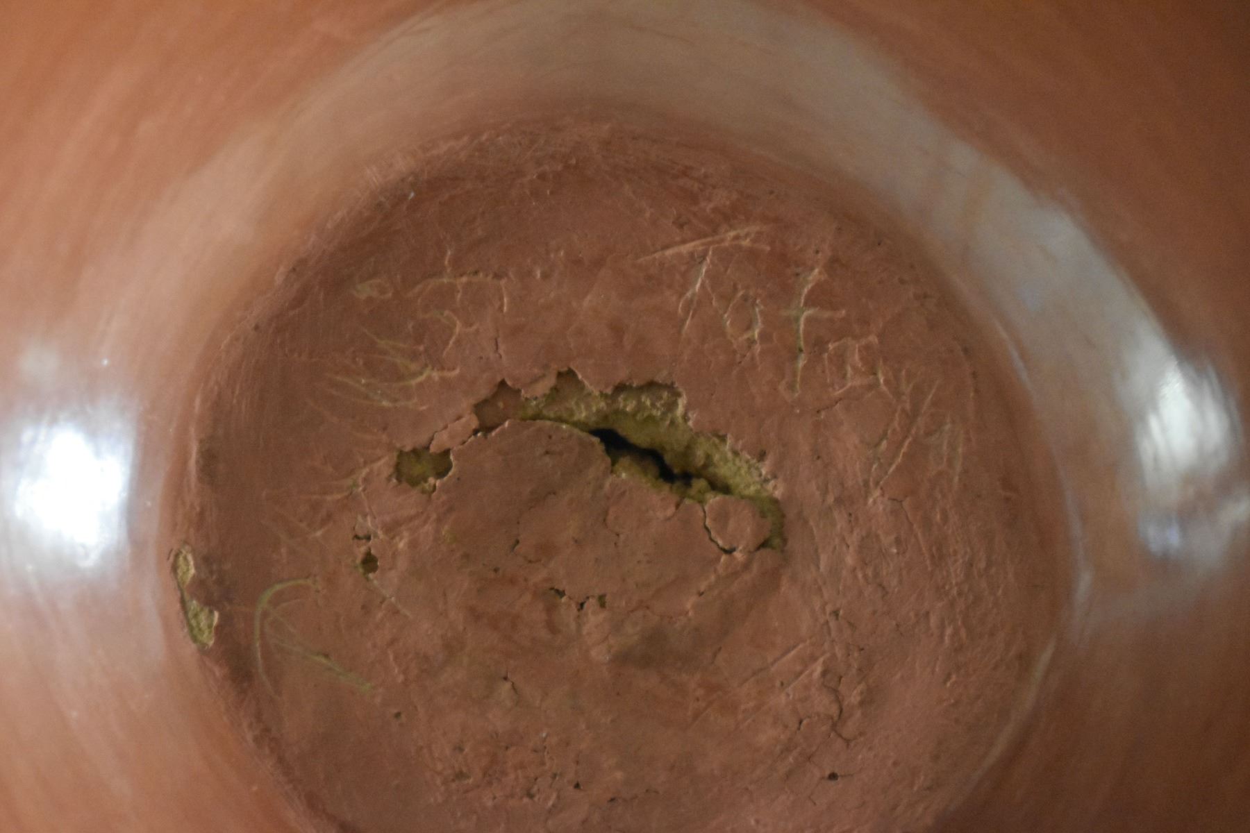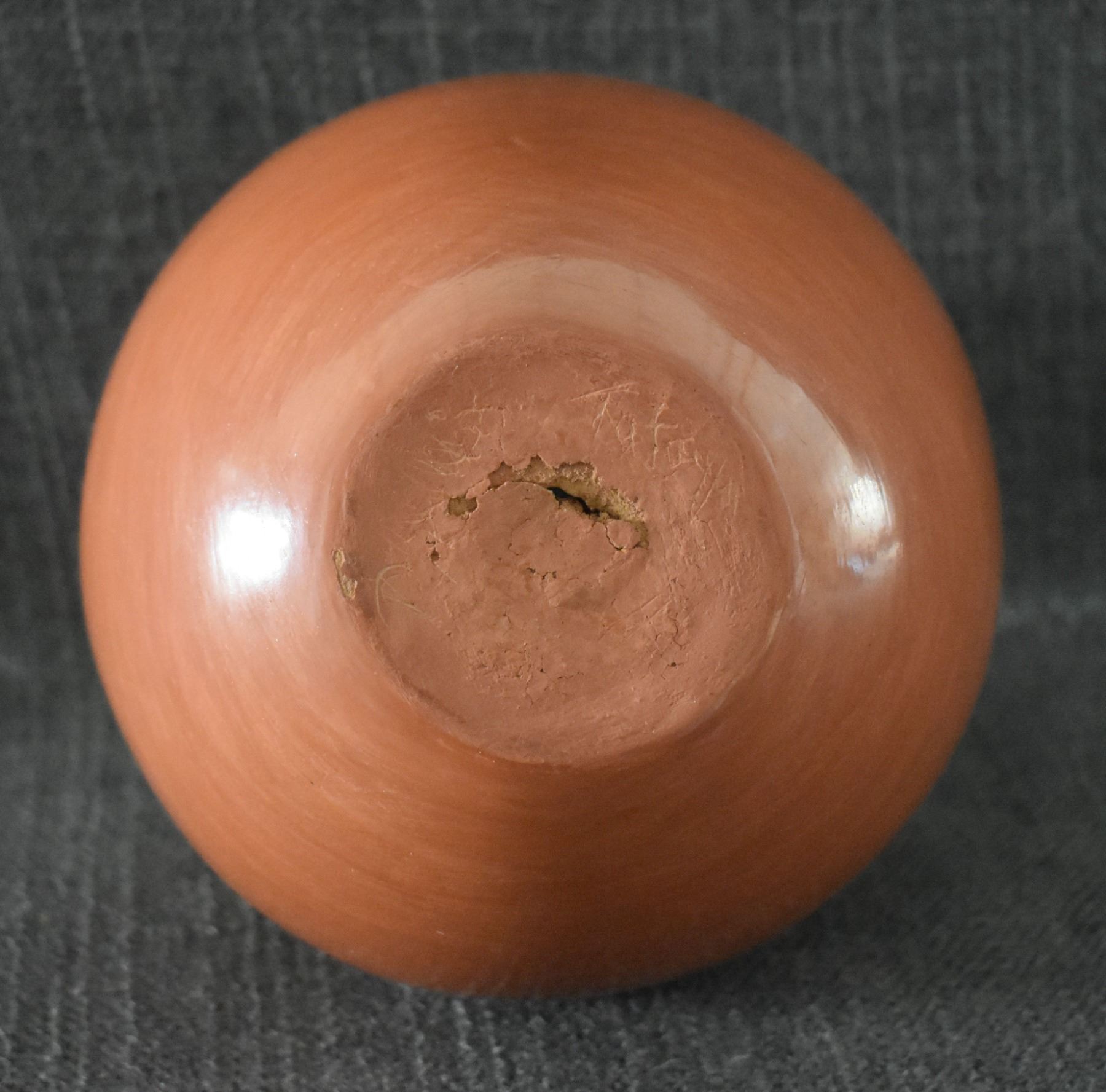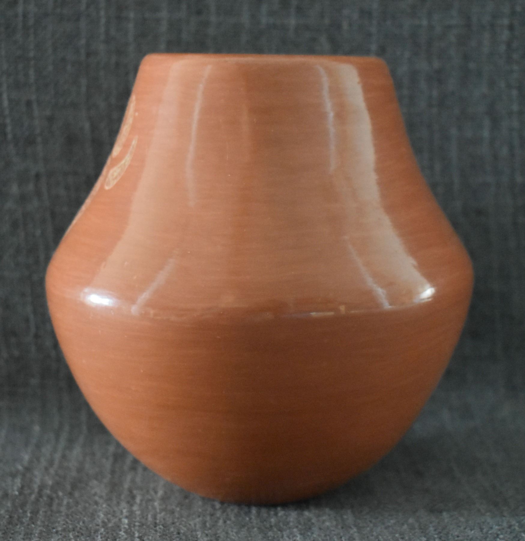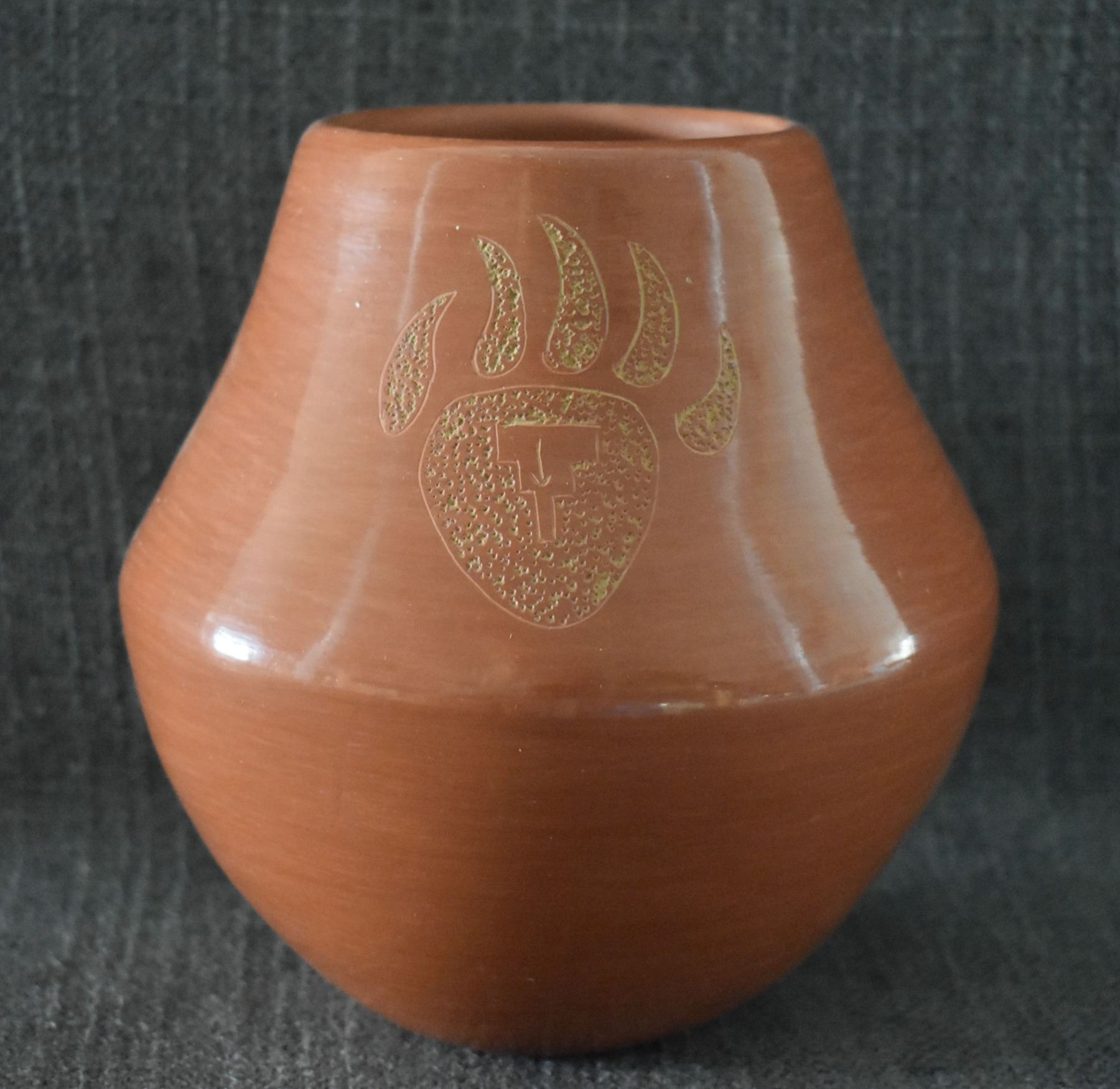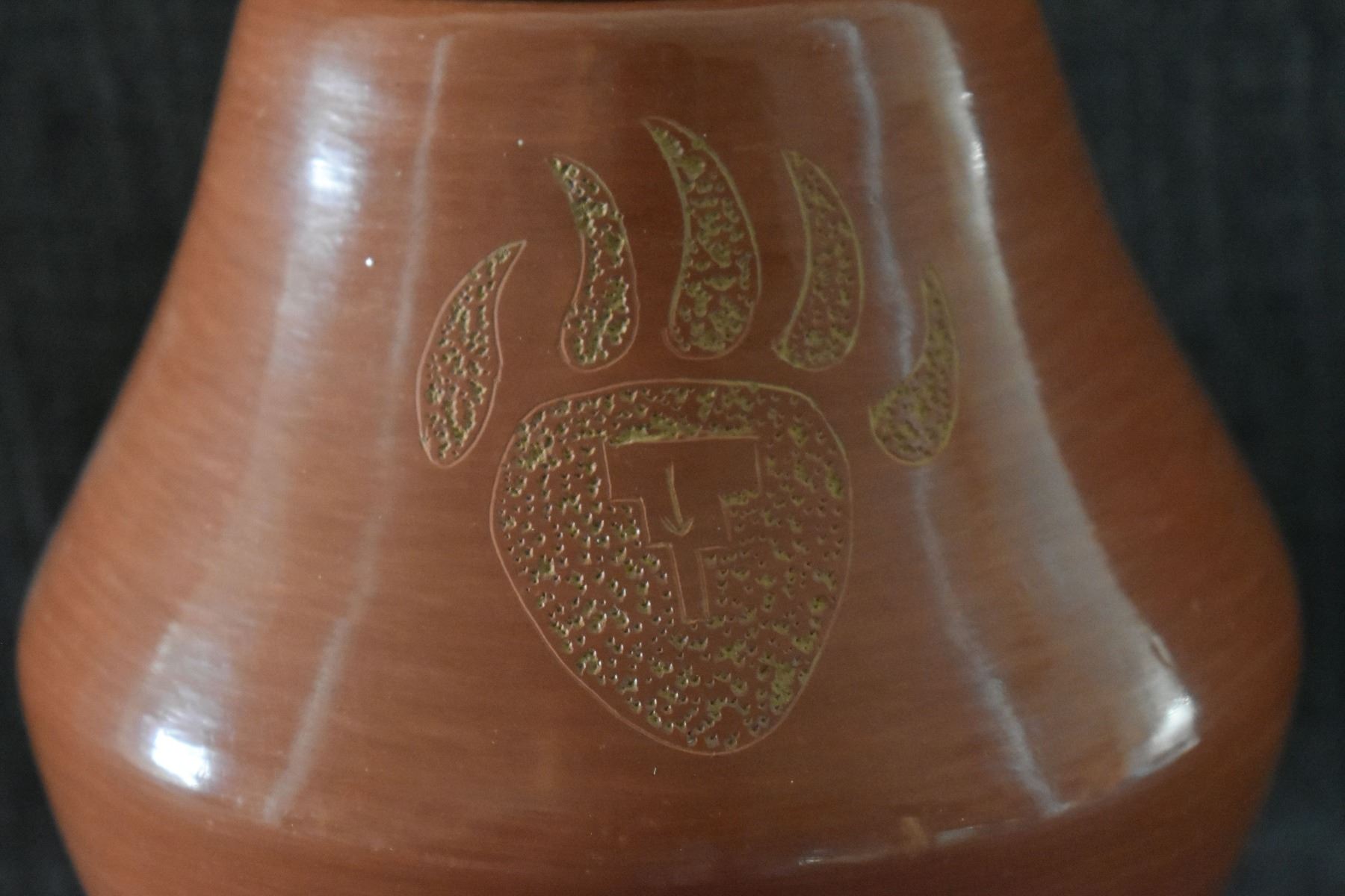 1980's Santa Clara, hand coiled with sgraffito bear paw design by Phyllis Tafoya, 6" x 5.5".