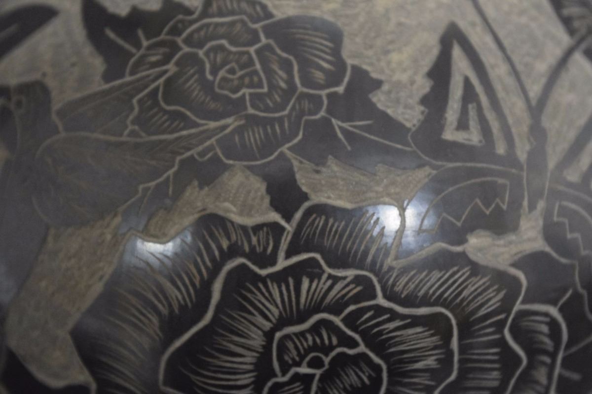 1980's busy sgraffito design depicting humming birds signed Gwen Tafoya. 6'' x 5''