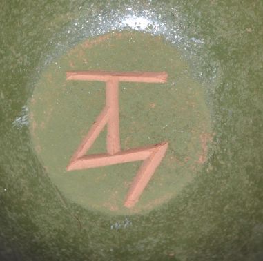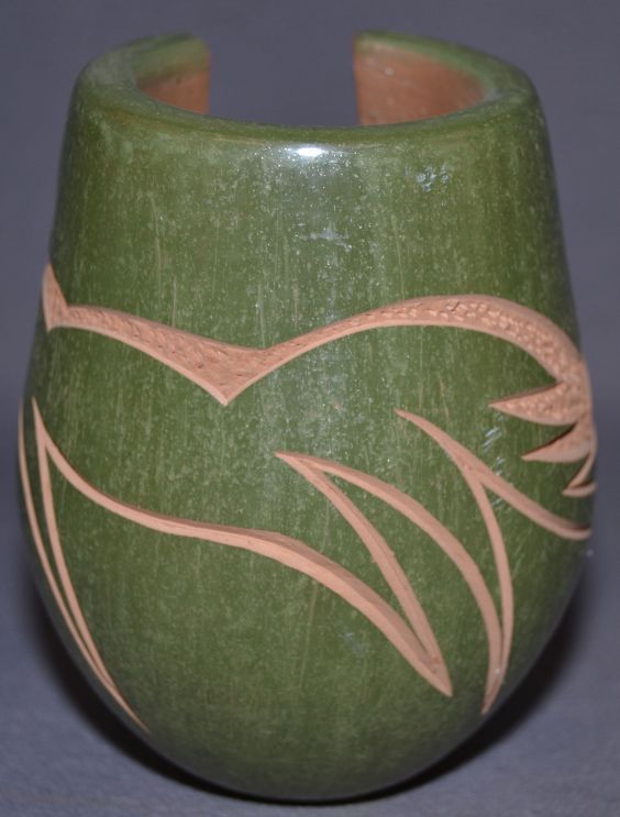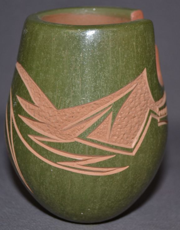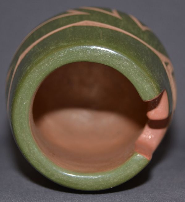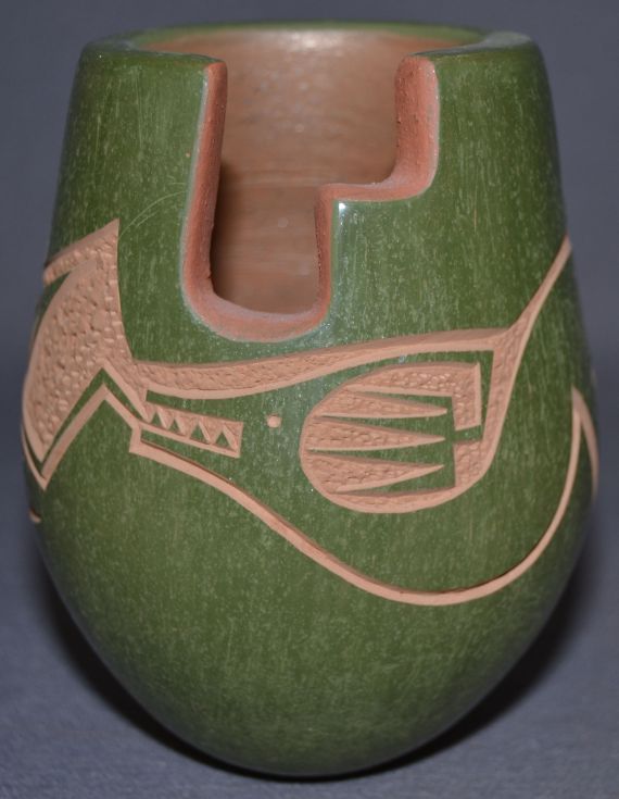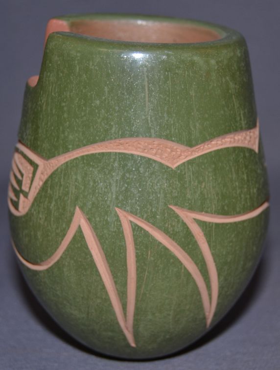 1970's sgraffito avanyu design on unusual green ware signed with Hallmark 4.5" x 3.5"