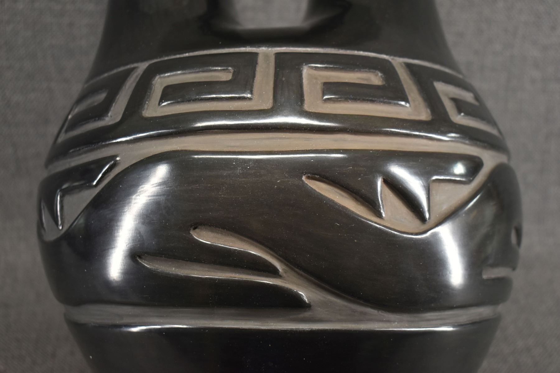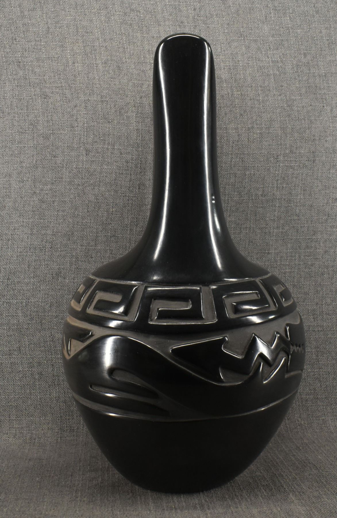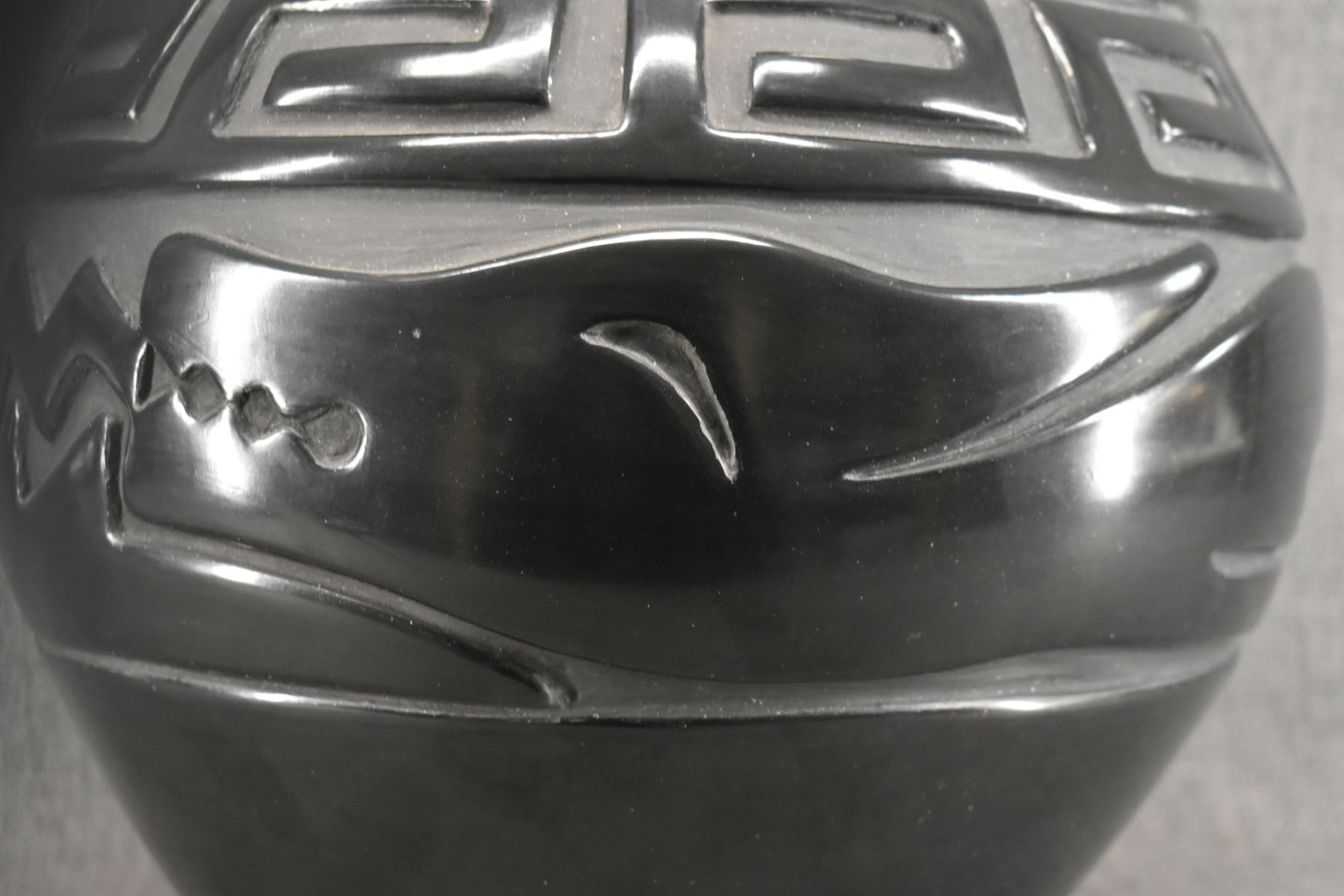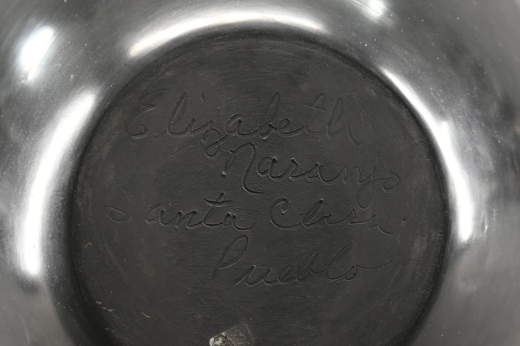 1980's hand coiled with carved design depicting avanyu signed Elizabeth Naranjo. 18" x 10"