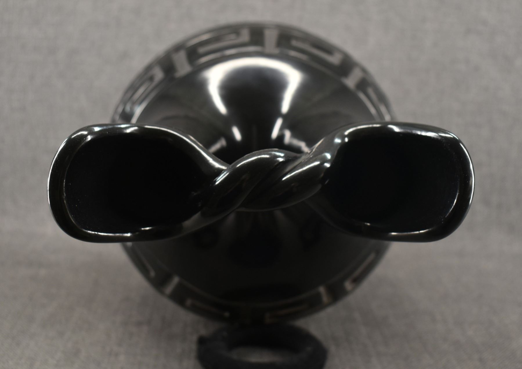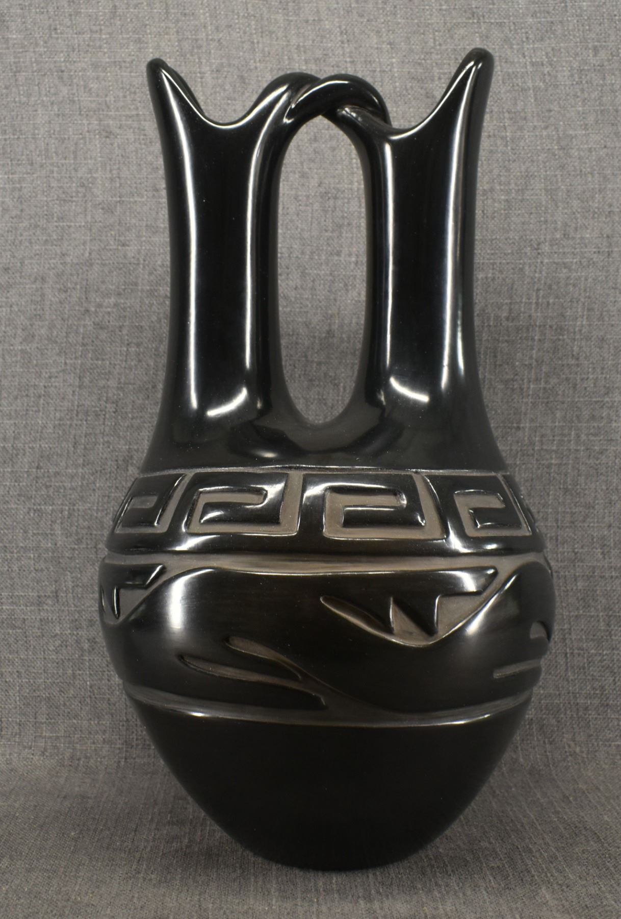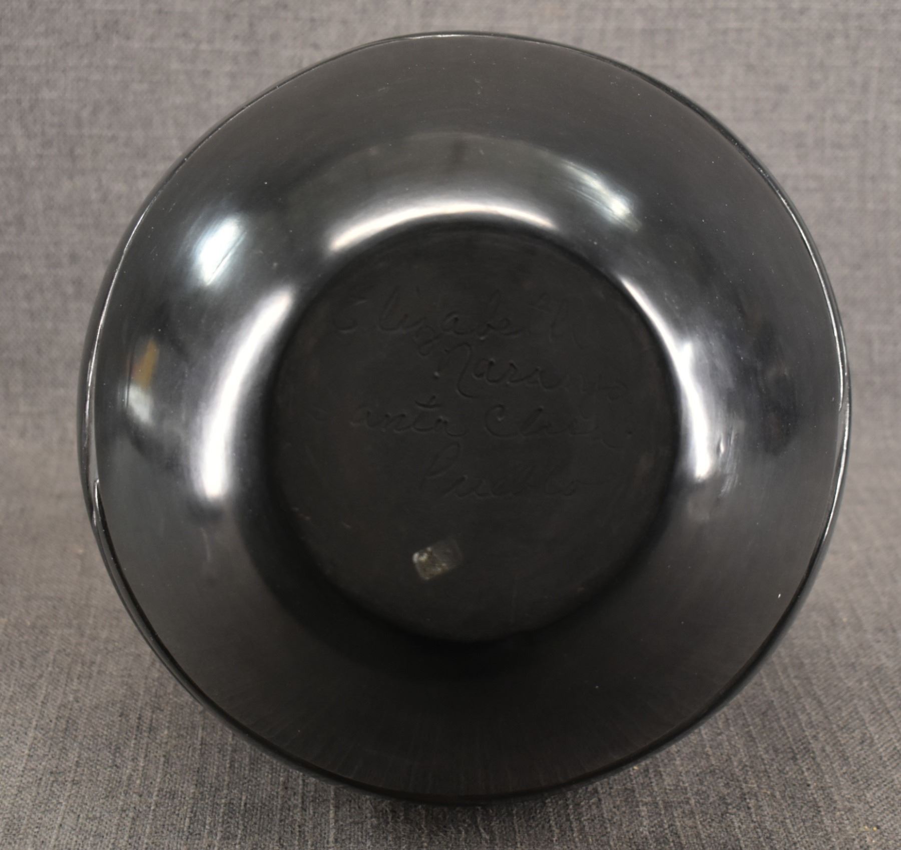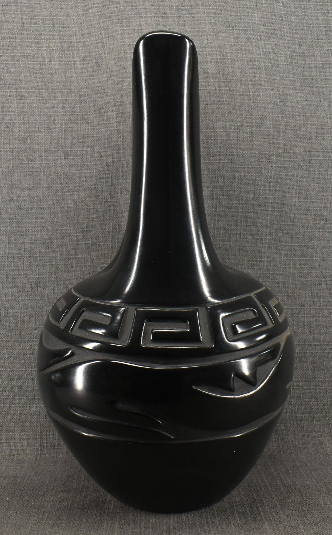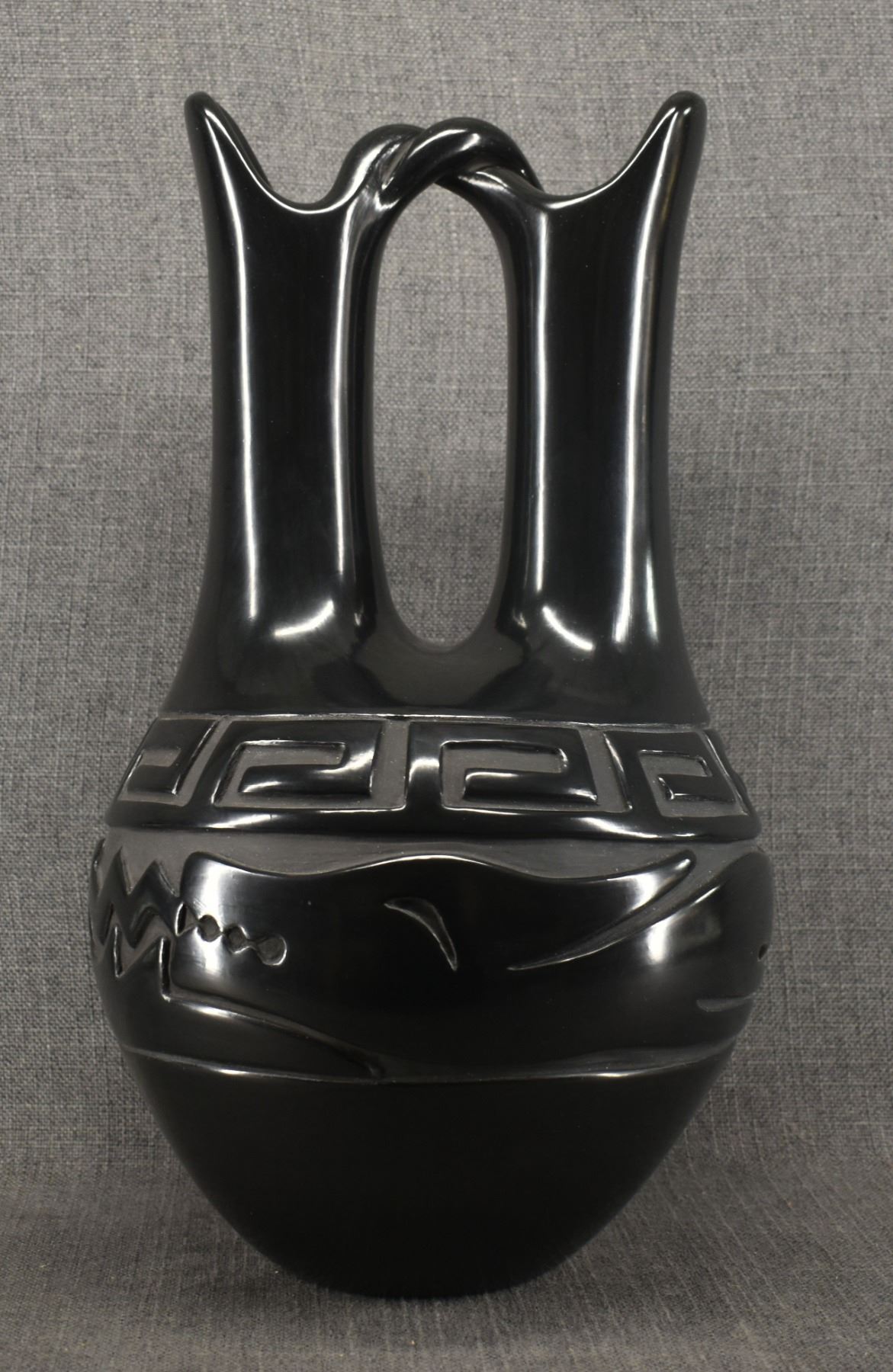 1980's hand coiled with carved design depicting avanyu signed Elizabeth Naranjo. 18" x 10"
