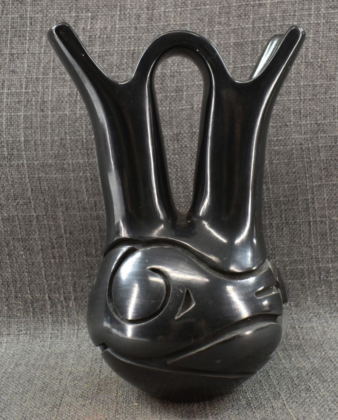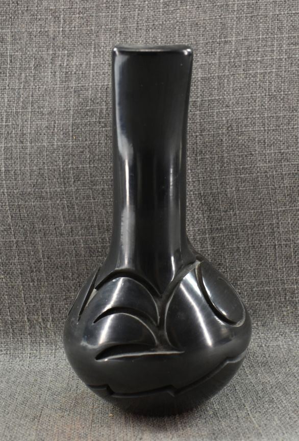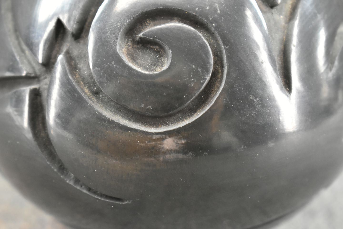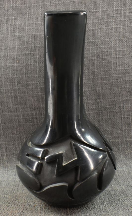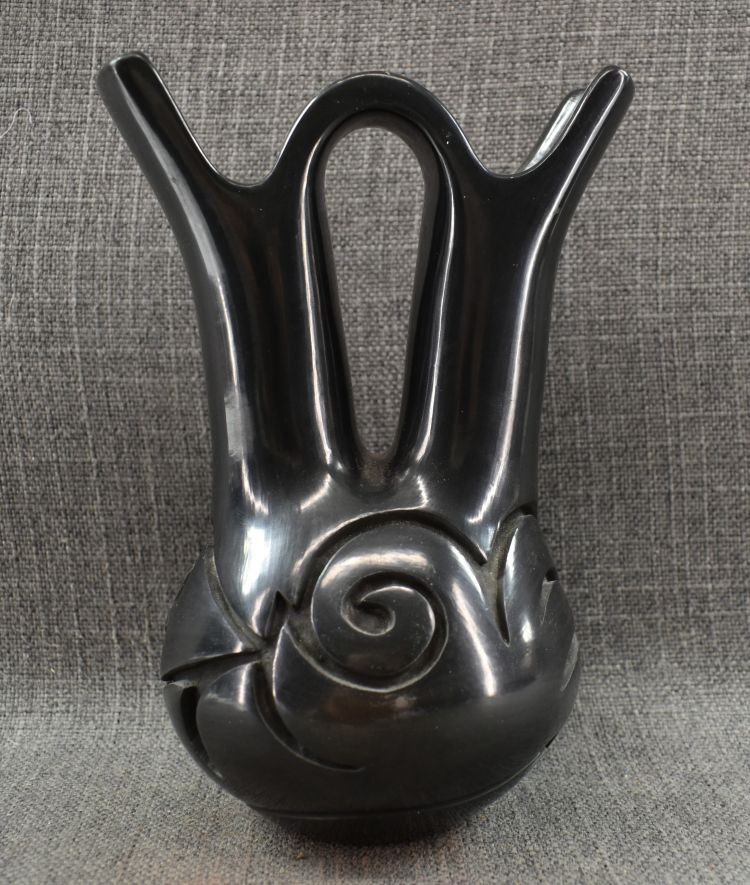 1980's Santa Clara. Hand coiled and carved design pottery wedding vase. Signed Sally Tafoya. 9'' x 5''