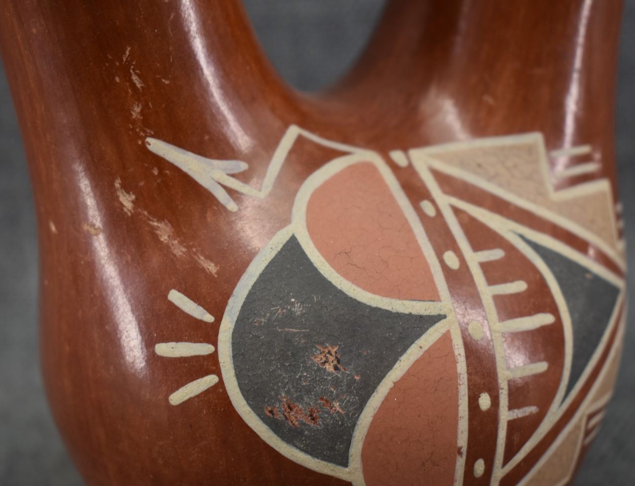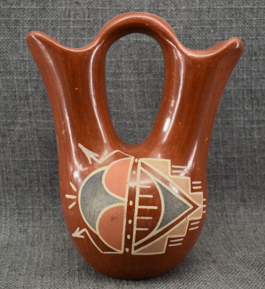 1930-40's Santa Clara, hand coiled with four color painted design 7.25" x 6" x 4"