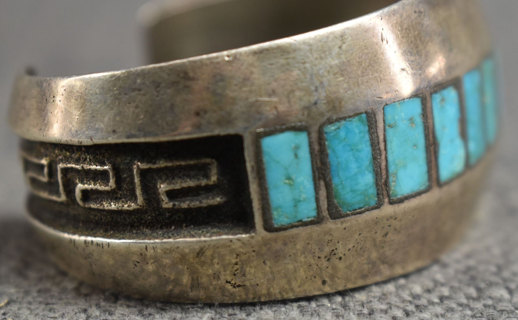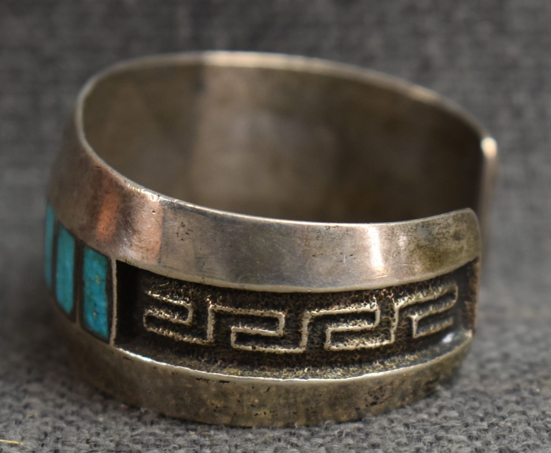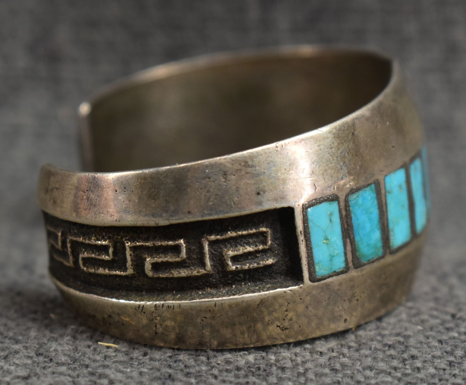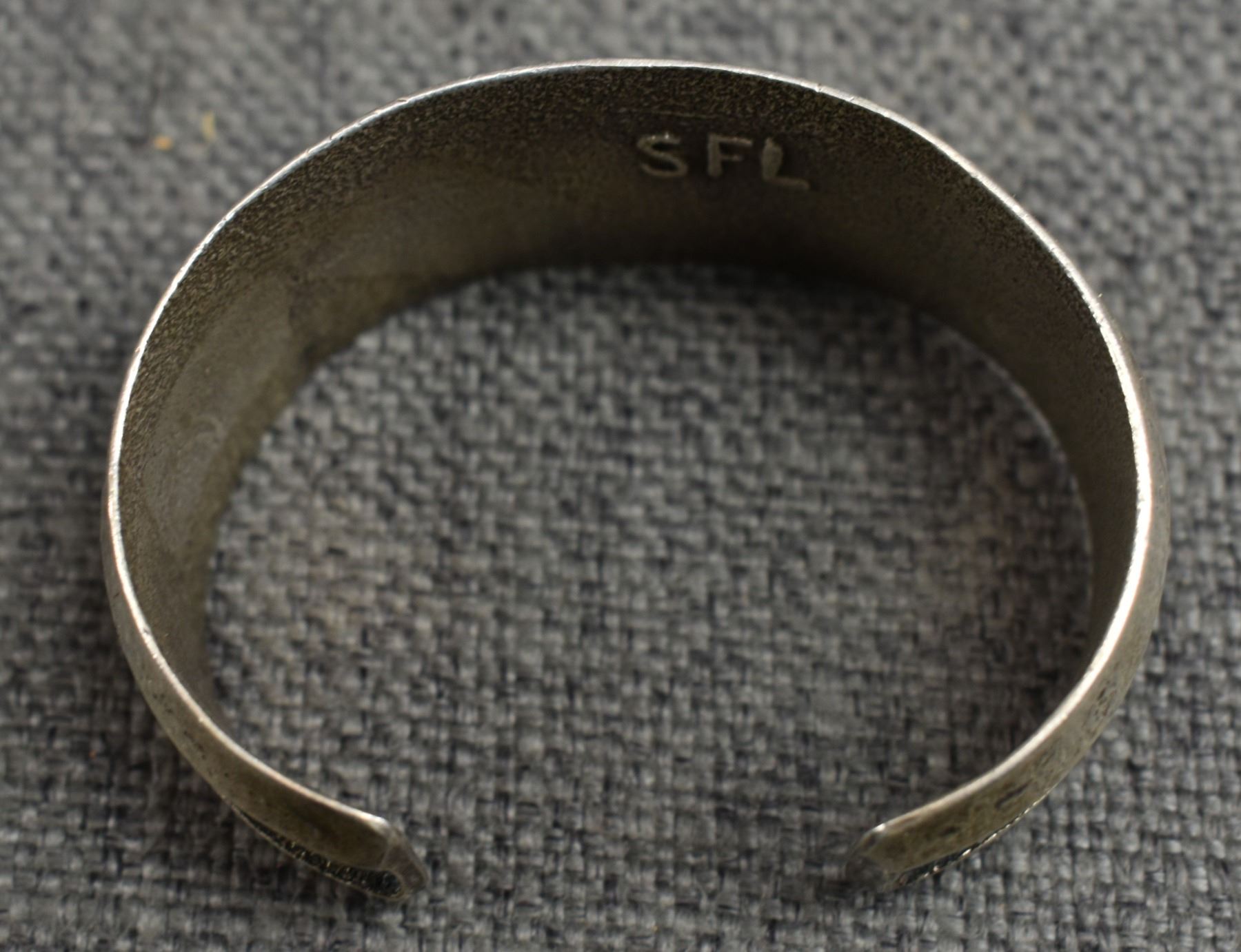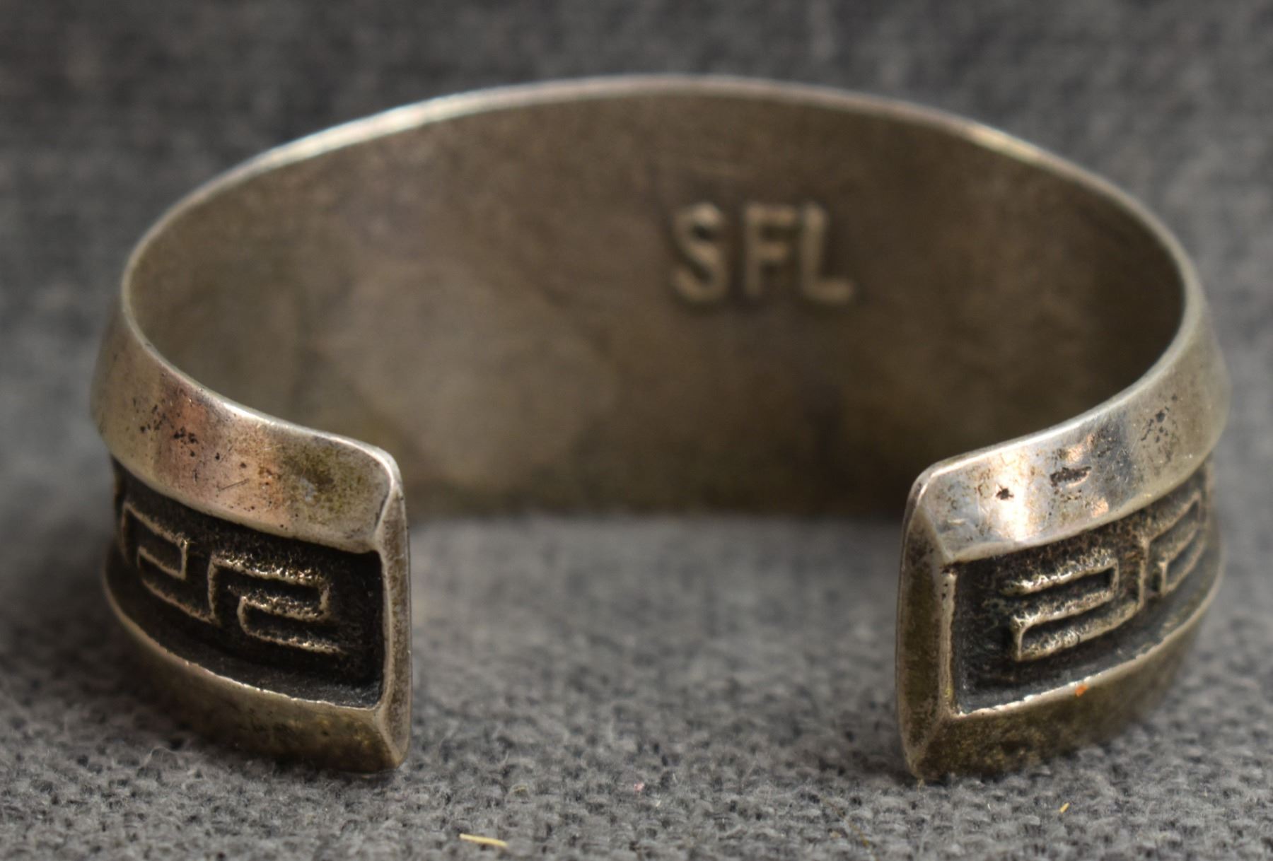 1980's Santo Domingo , tufa cast sterling silver and turquoise bracelet signed SFL. 1.25'' x 5.5'' x 1'' total weight 80 grams