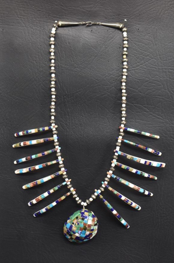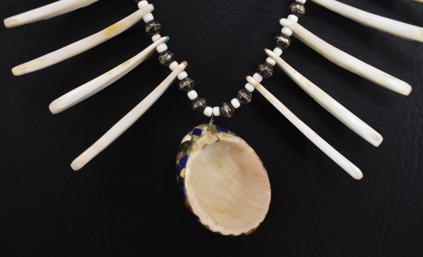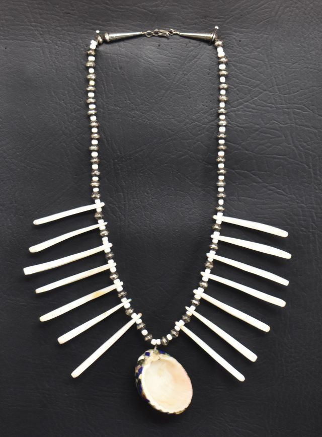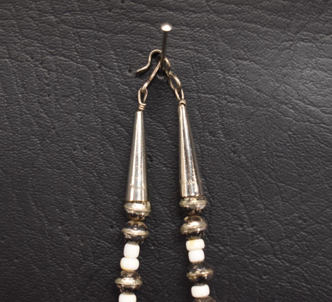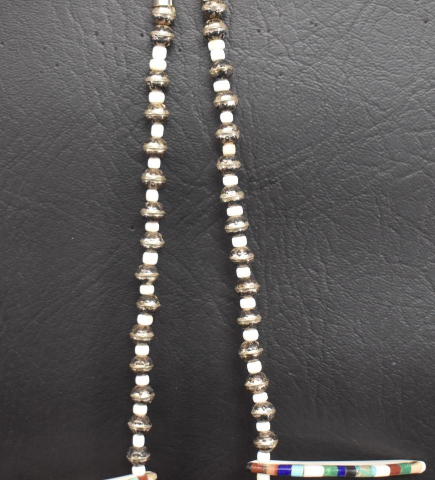 1970-80's Santo Domingo Indian single strand of shell and sterling silver beads with stamped design 22" long with shell tabs with inlaid turquoise shell and other stones longest 3" inlaid shell pendant 2.25" x 2"