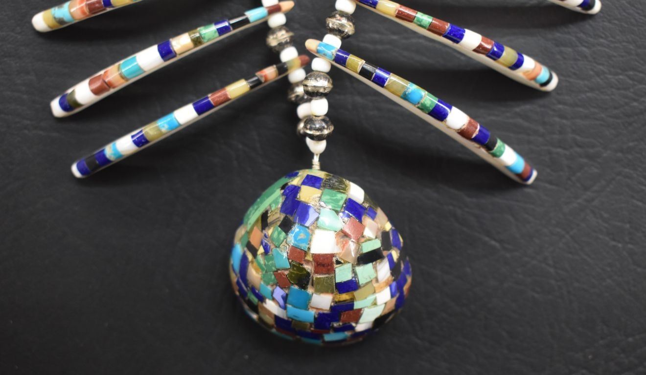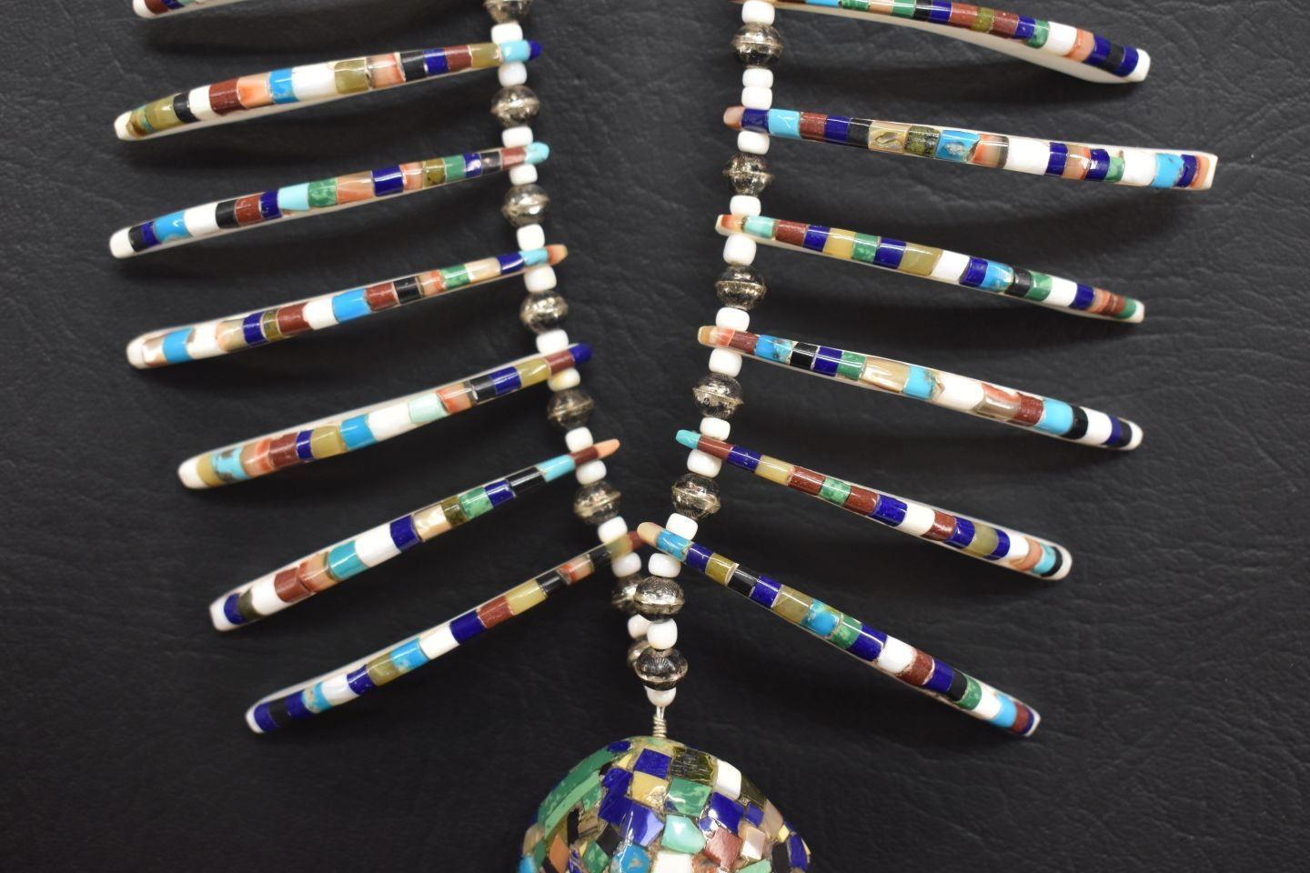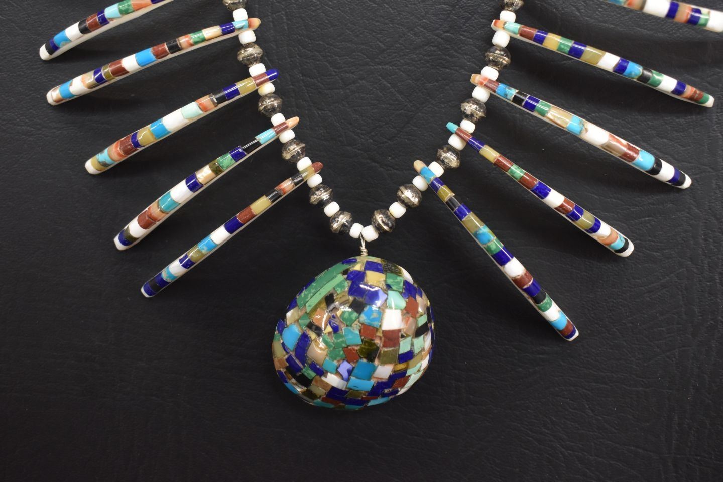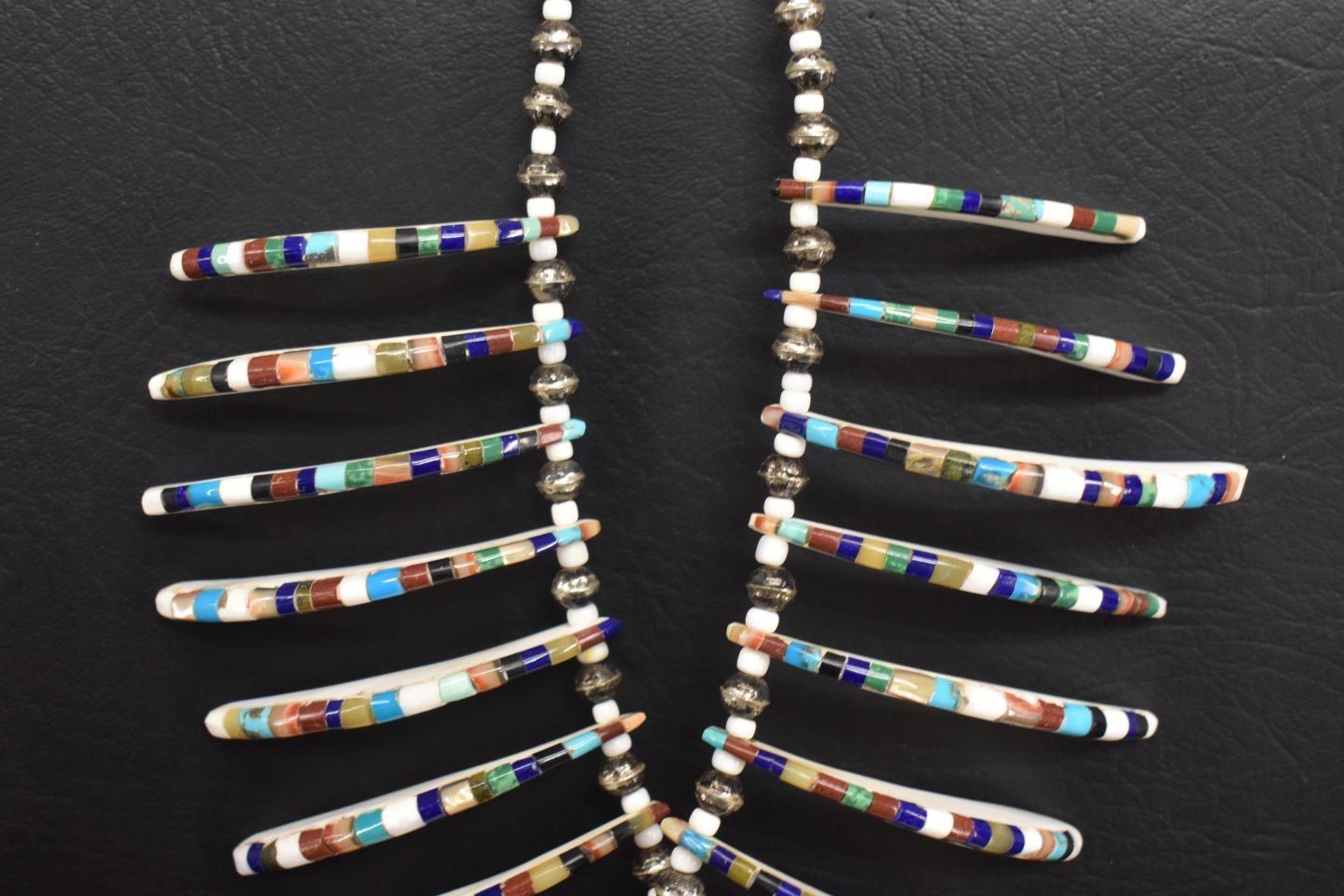 1970-80's Santo Domingo Indian single strand of shell and sterling silver beads with stamped design 22" long with shell tabs with inlaid turquoise shell and other stones longest 3" inlaid shell pendant 2.25" x 2"