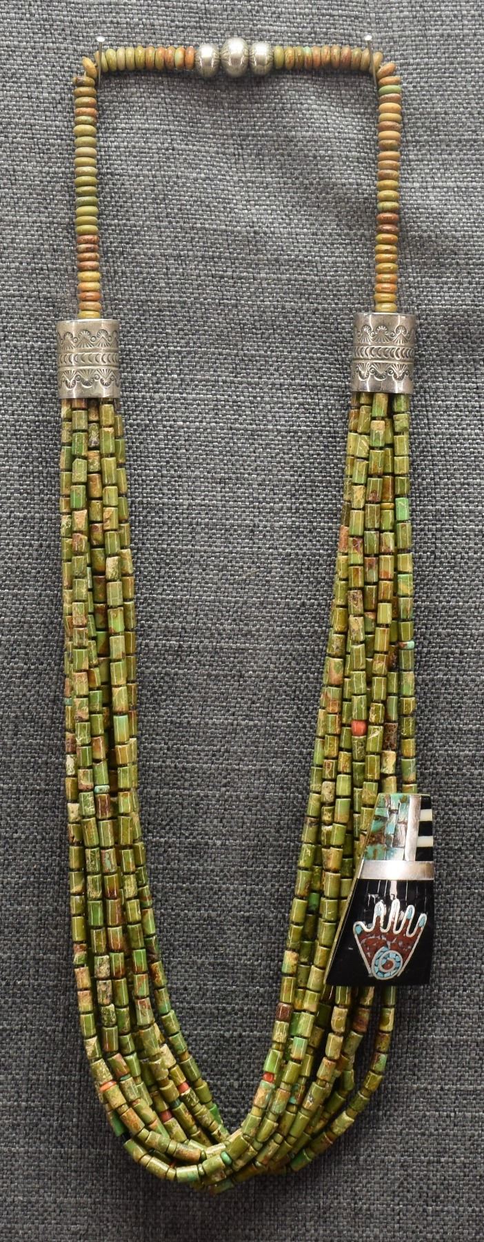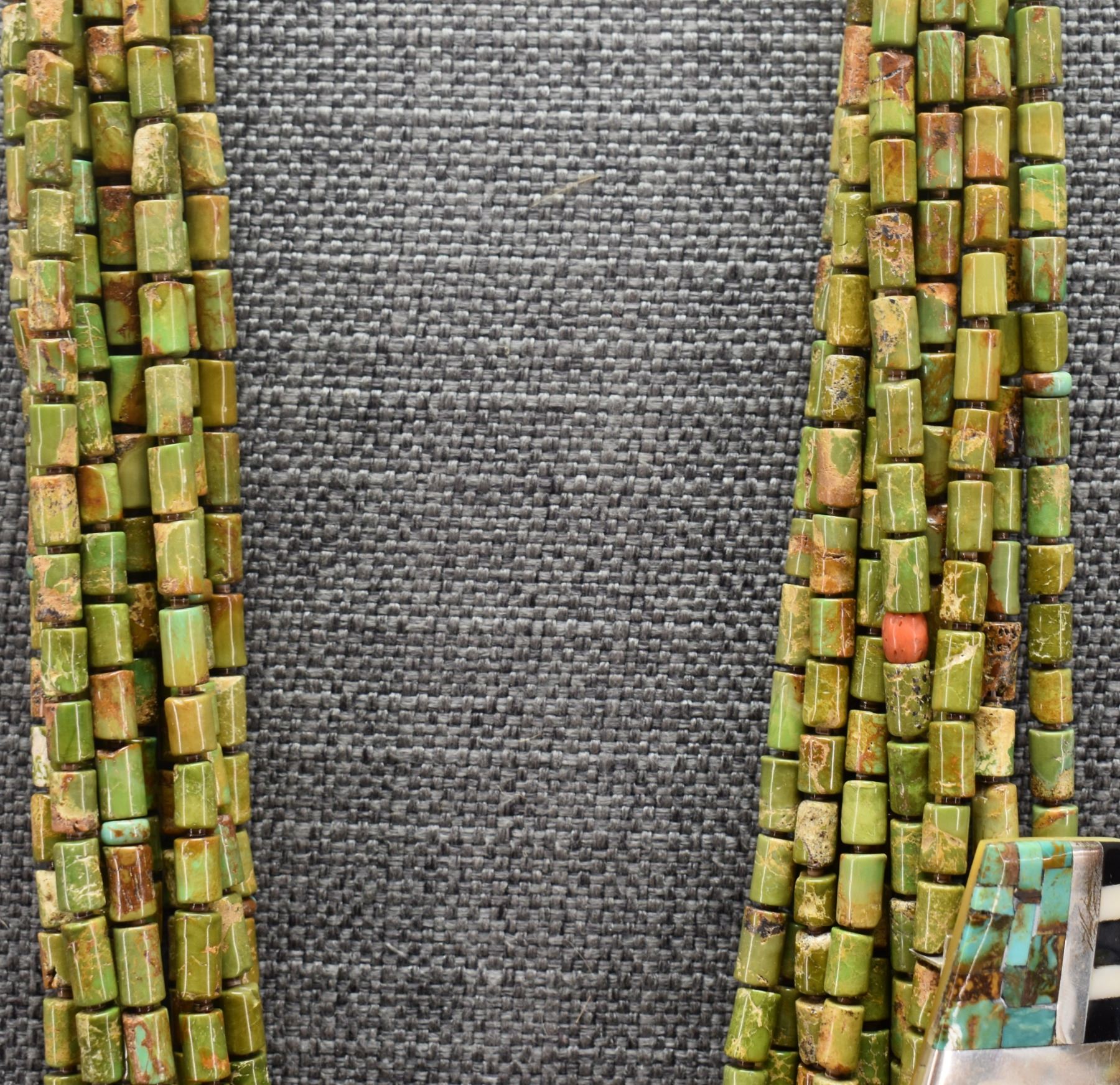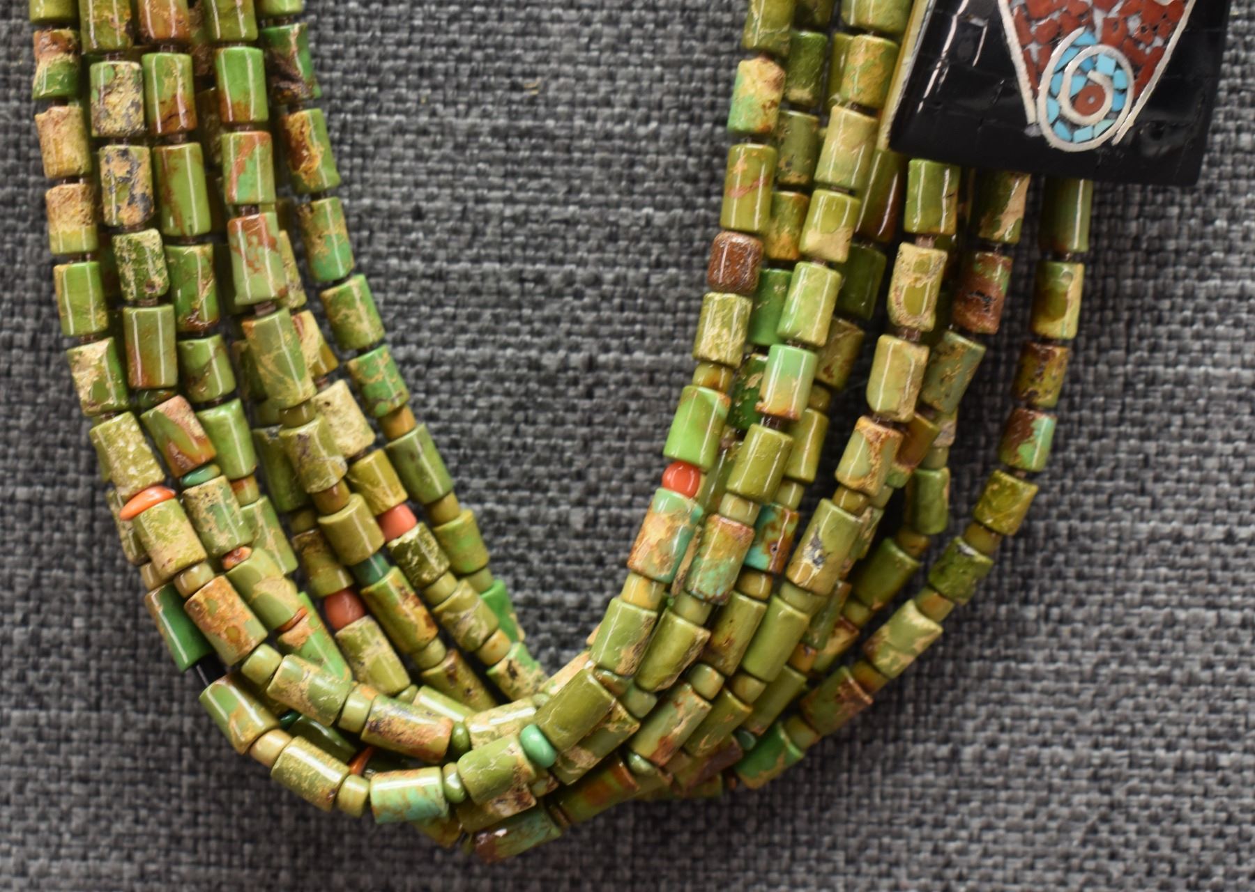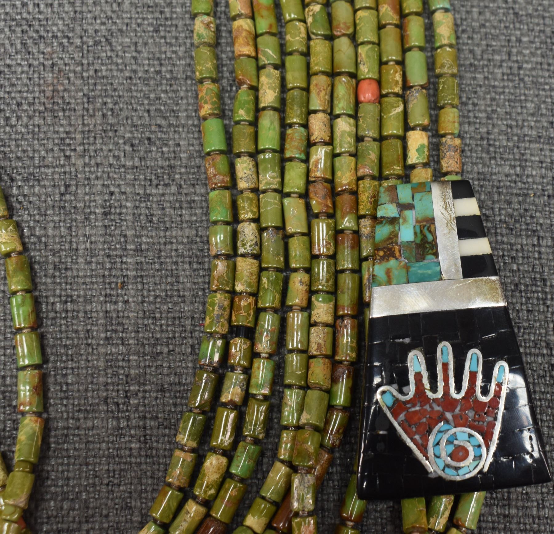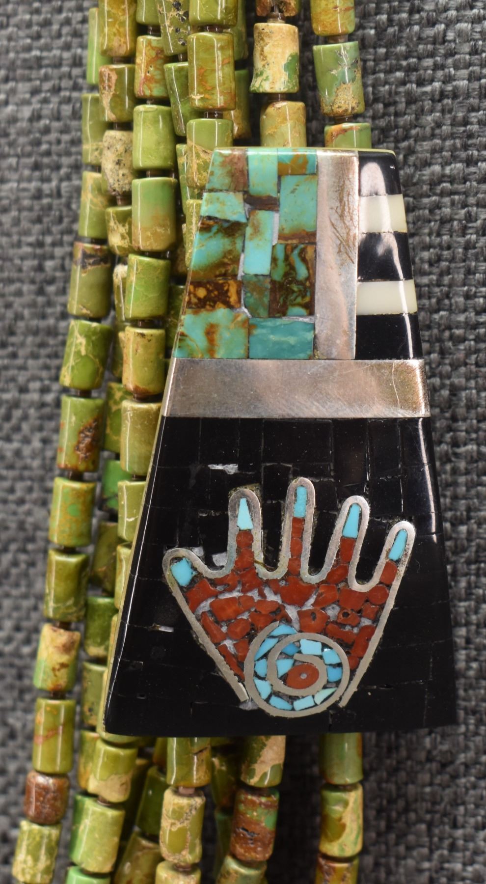 1980's Santo Domingo. Ten strand turquoise bead necklace 32'' long and in lay shell pendant 2.75'' x 1.75''