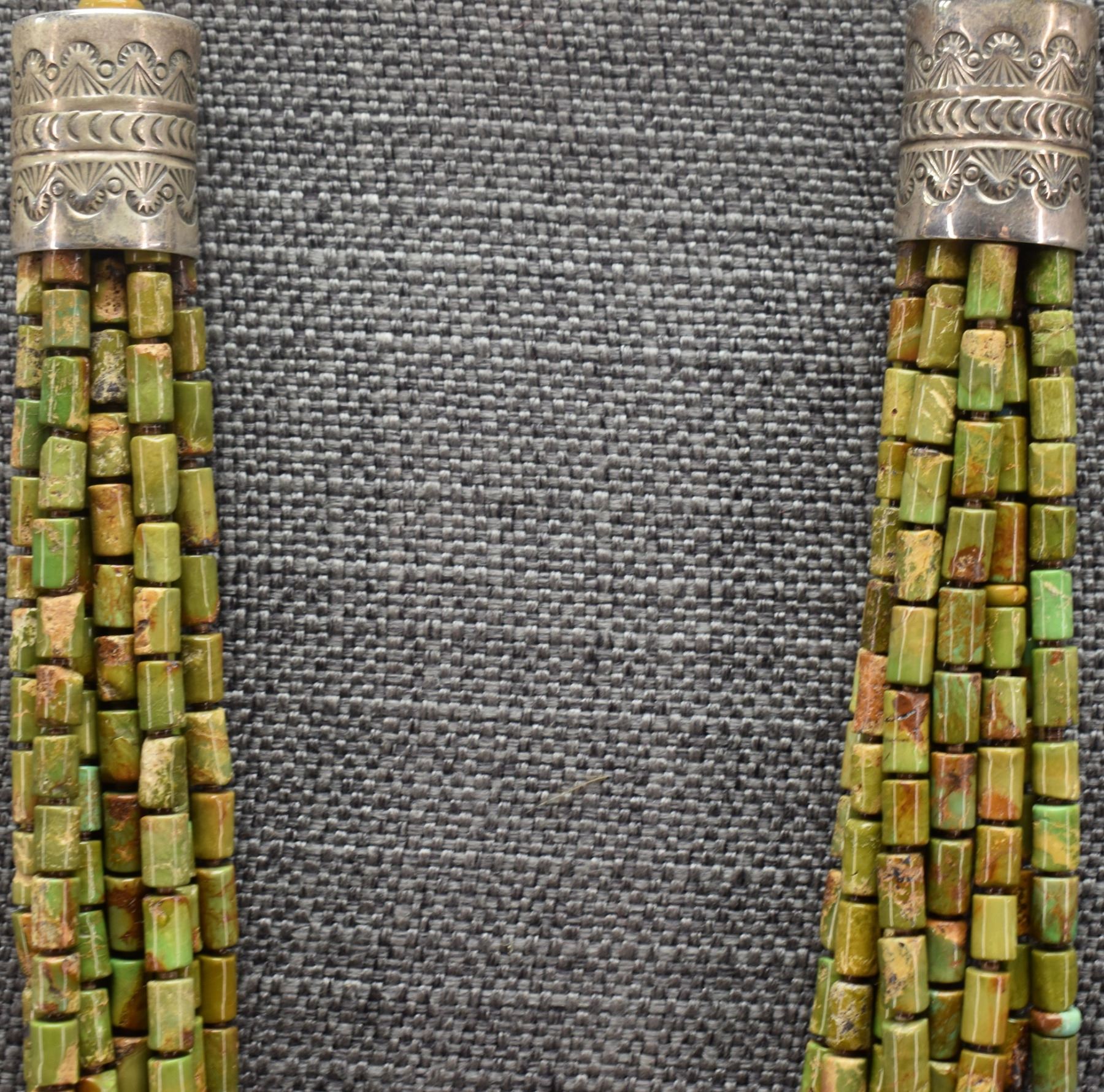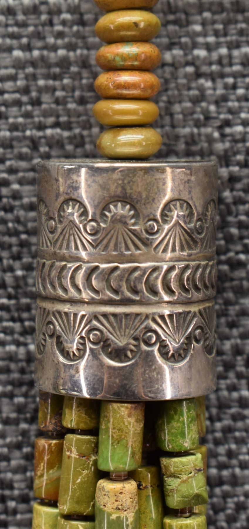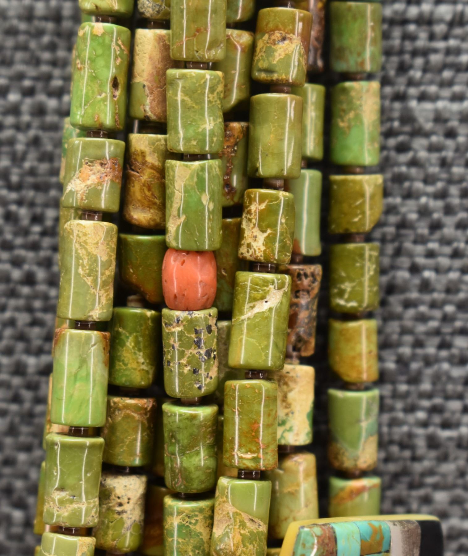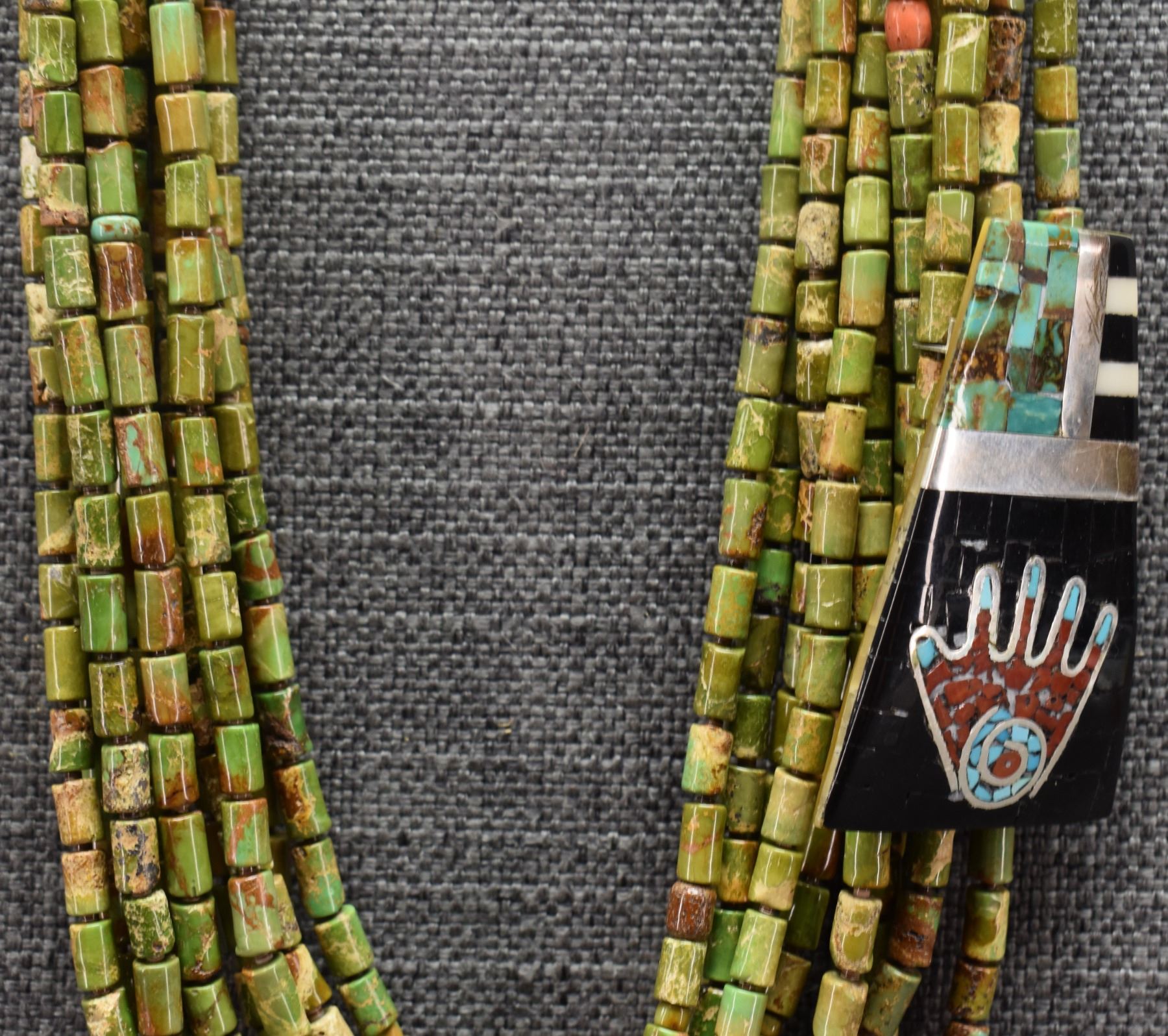 1980's Santo Domingo. Ten strand turquoise bead necklace 32'' long and in lay shell pendant 2.75'' x 1.75''