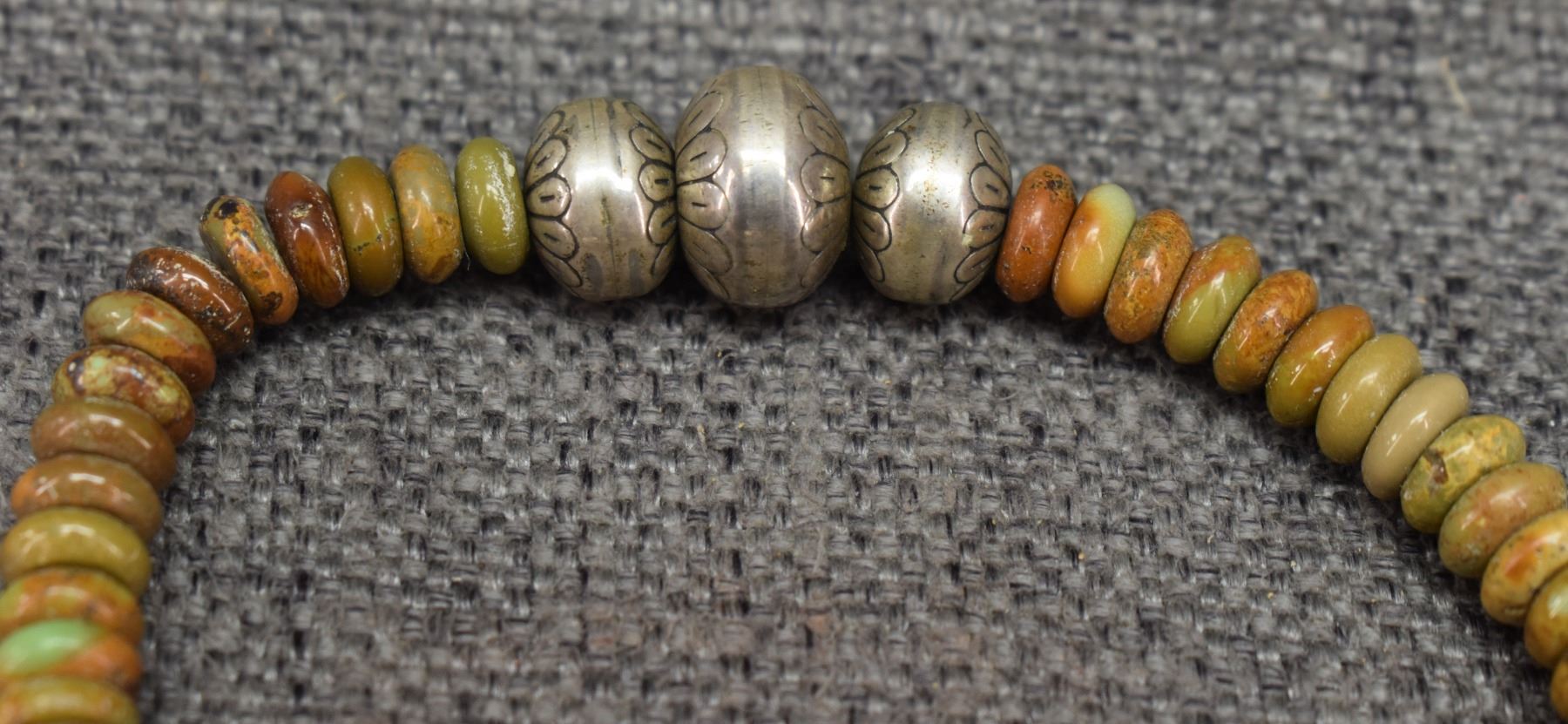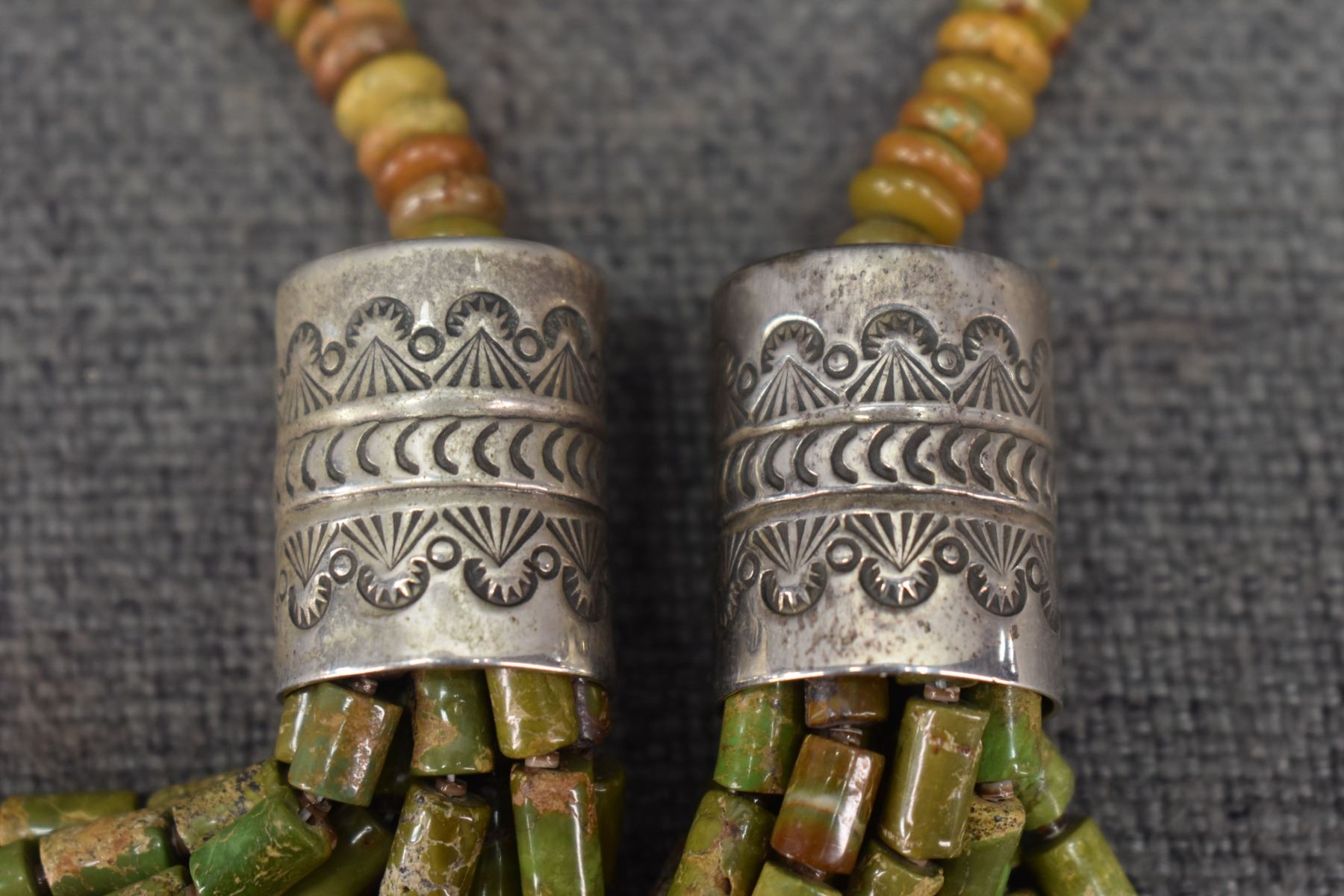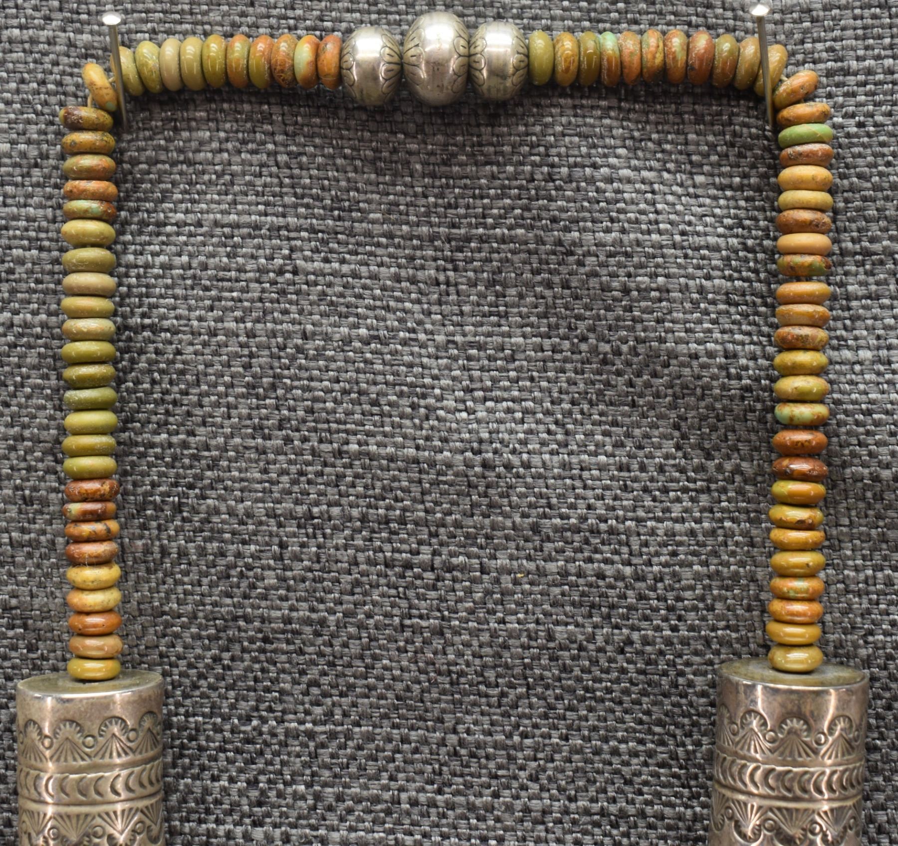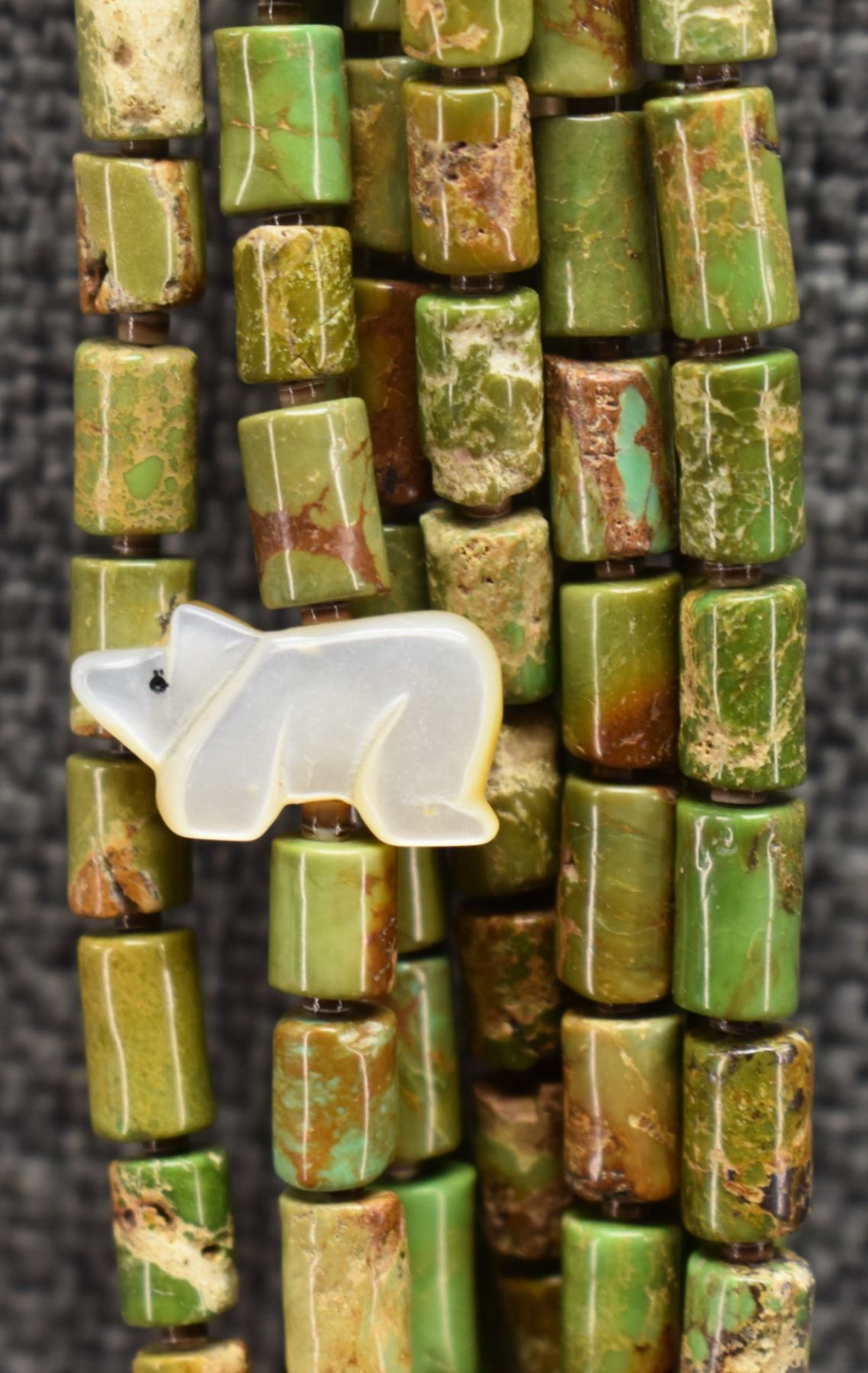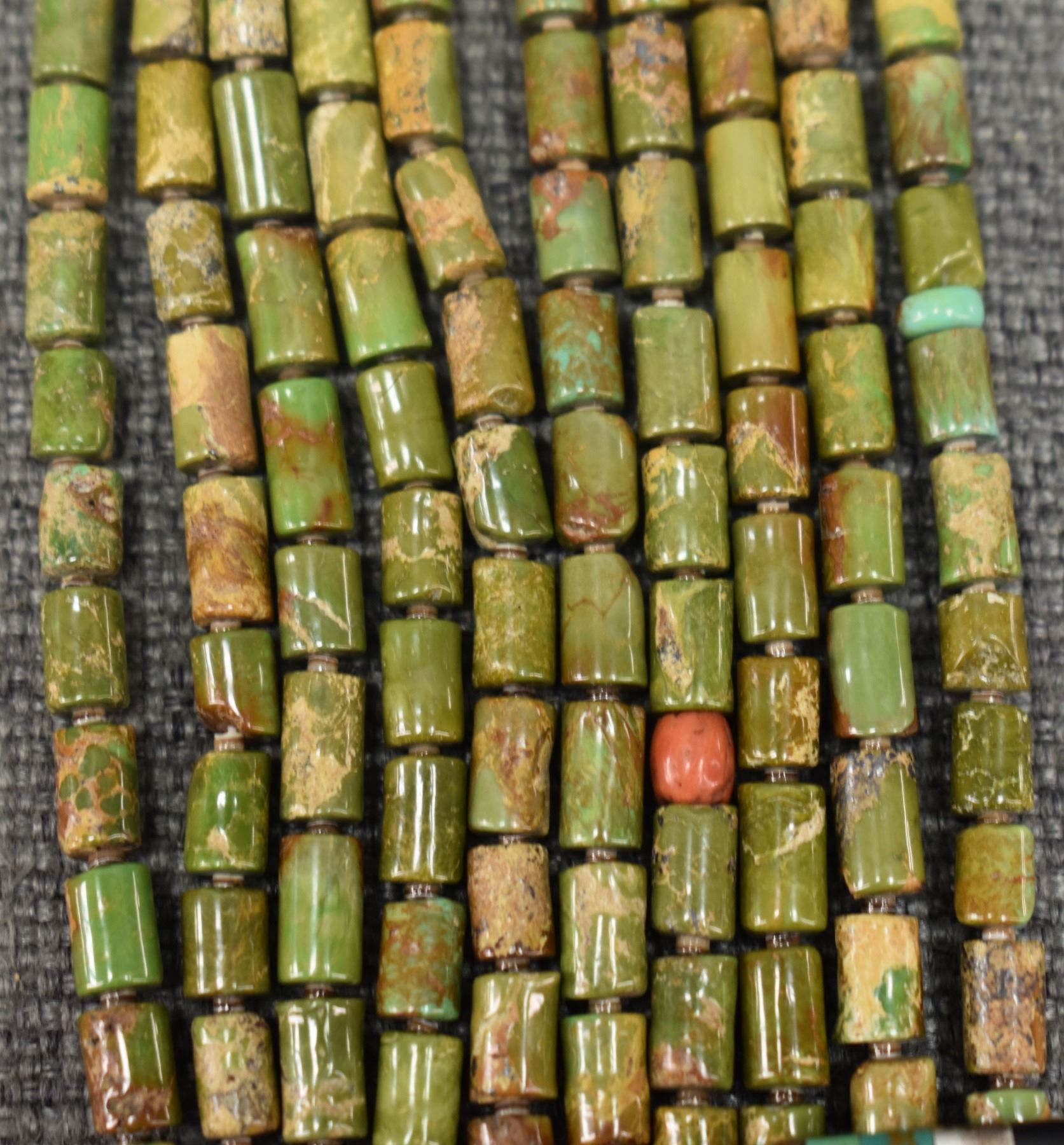 1980's Santo Domingo. Ten strand turquoise bead necklace 32'' long and in lay shell pendant 2.75'' x 1.75''
