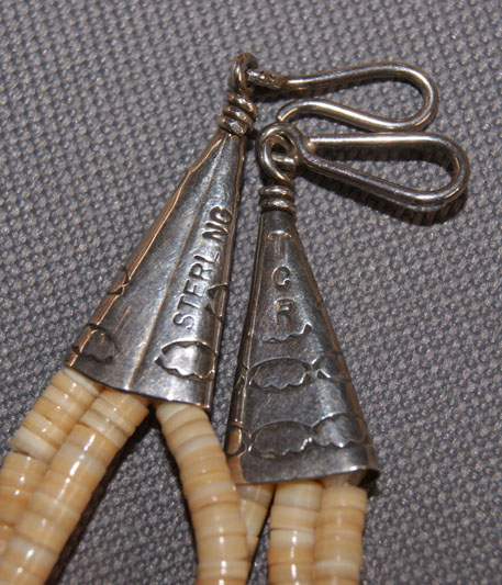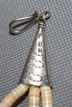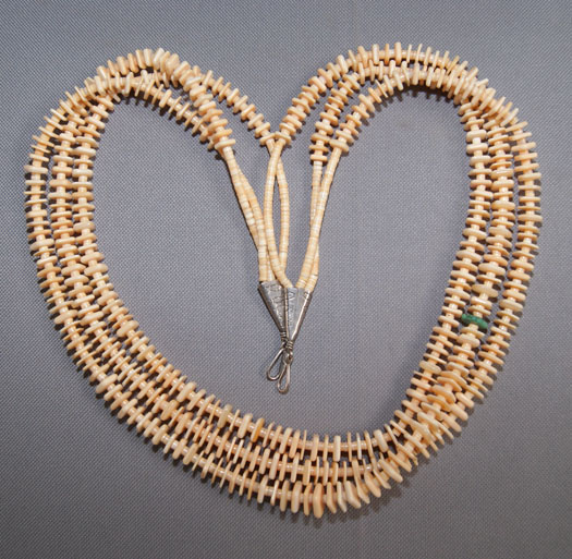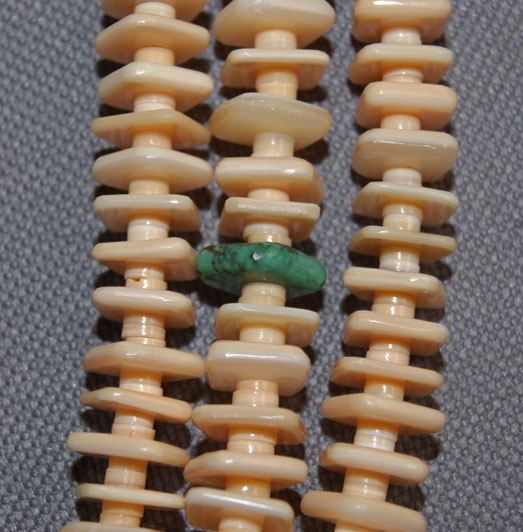 1980s three strands of spiny oyster shell with single turquoise. Graduated style by Joe and Terry Reano, 30"long