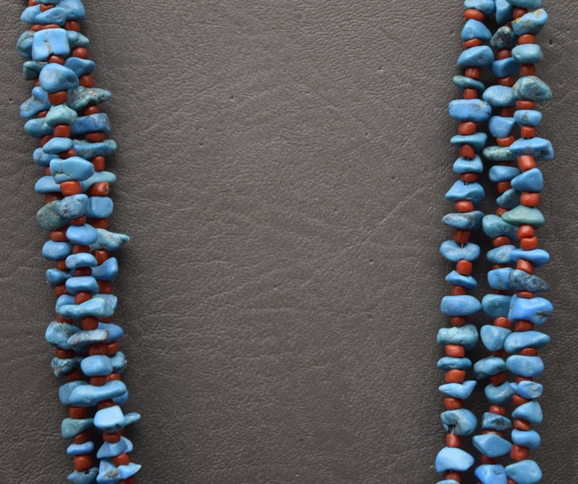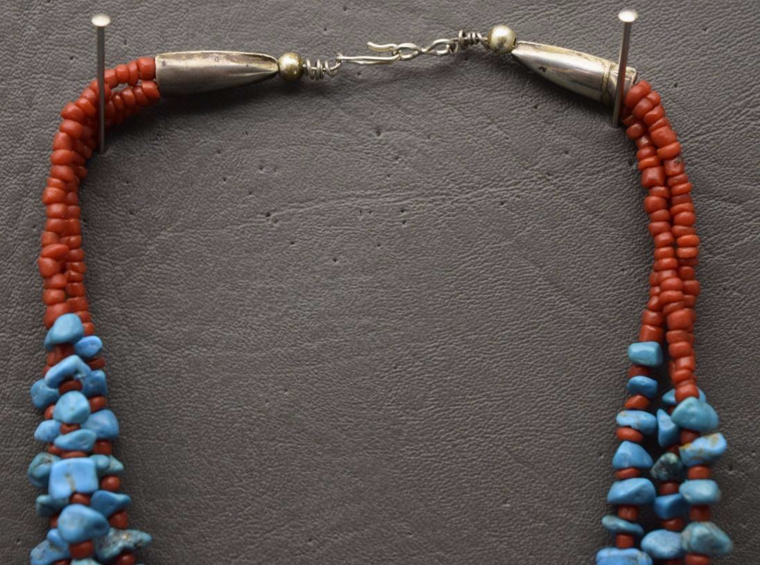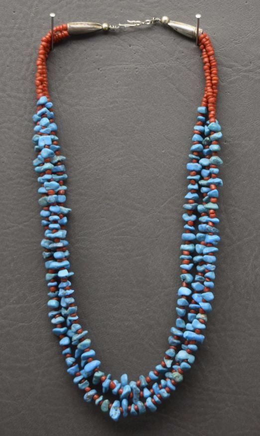 1980's three strands coral and turquoise with silver ends. 19'' long
