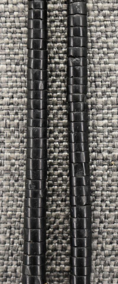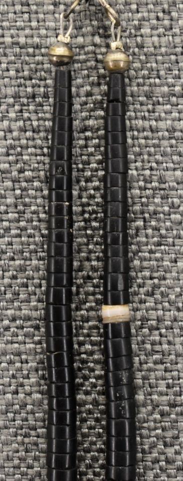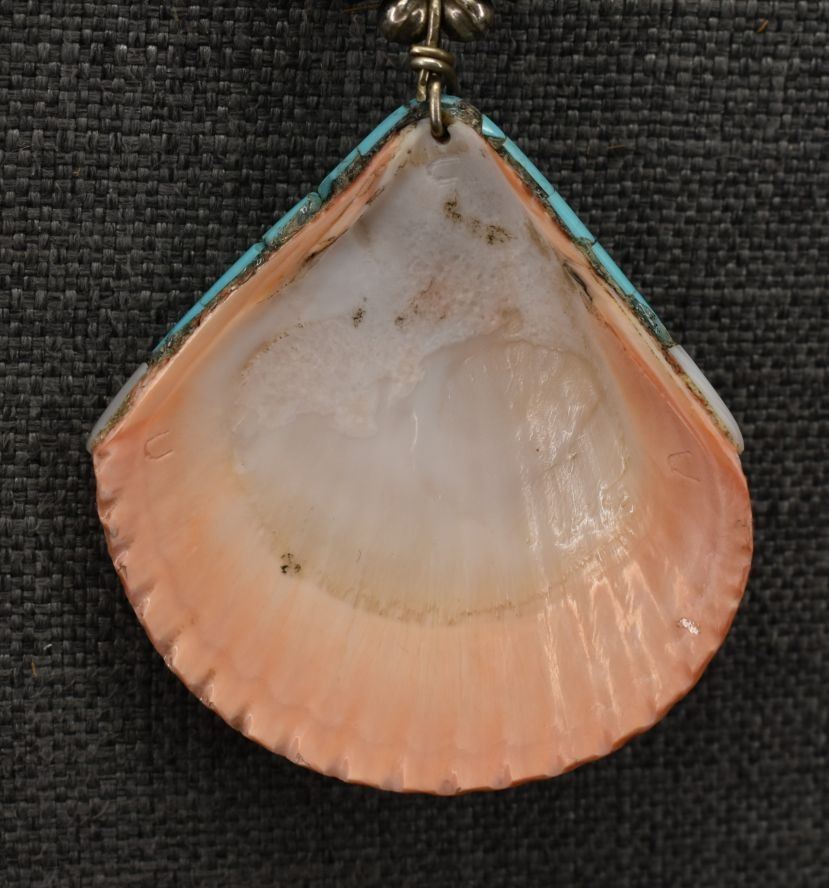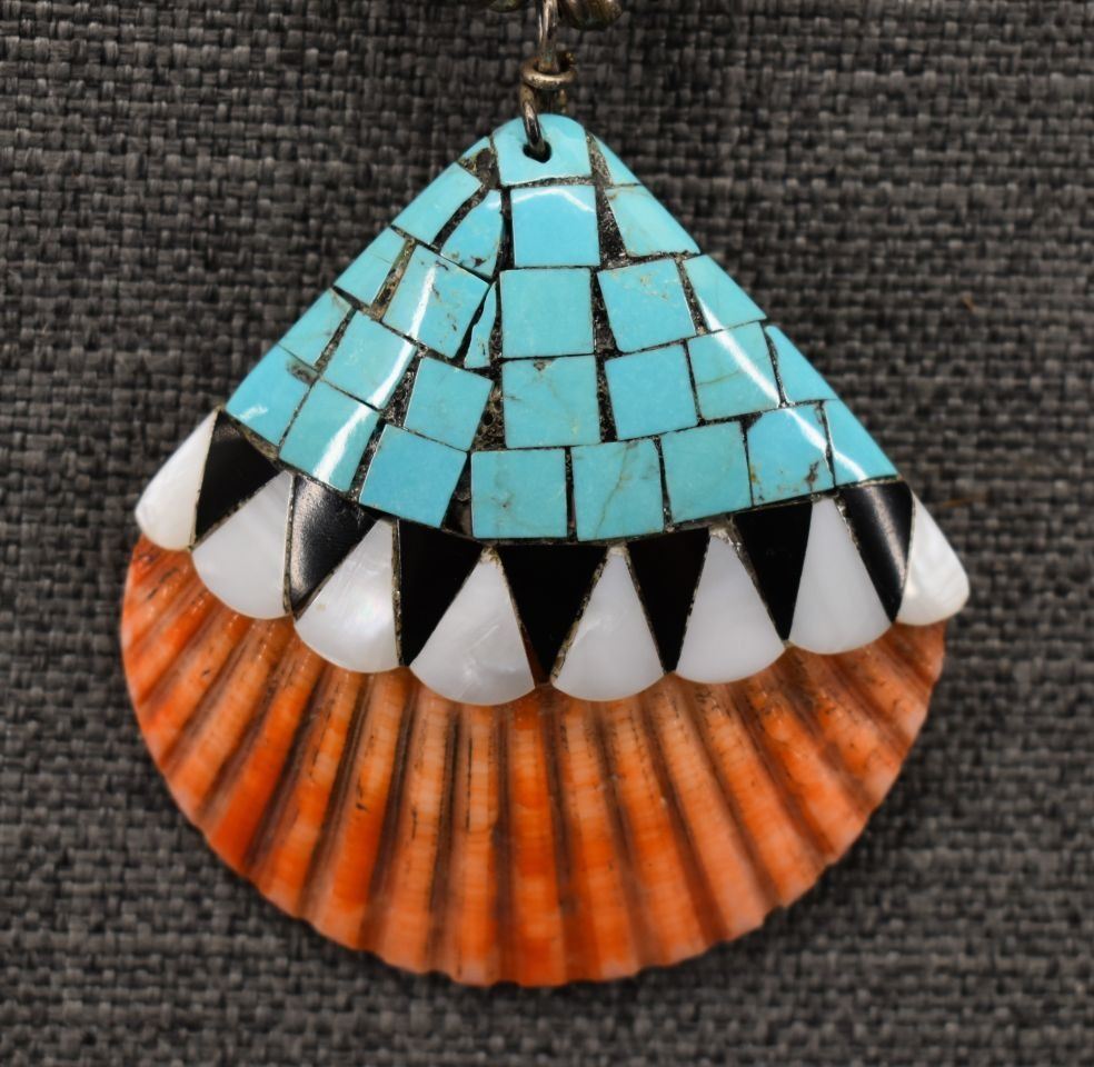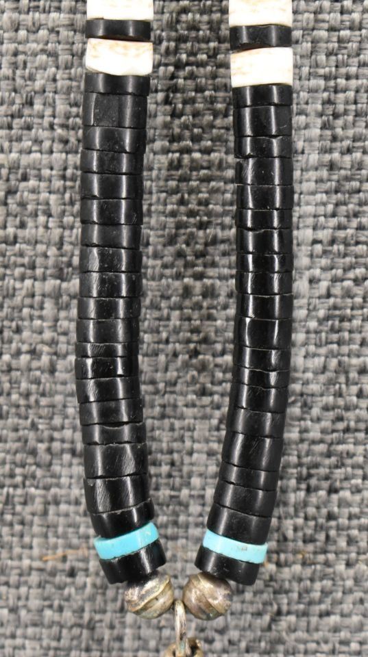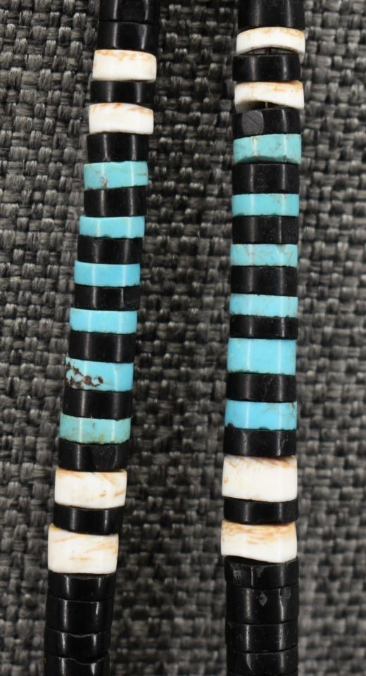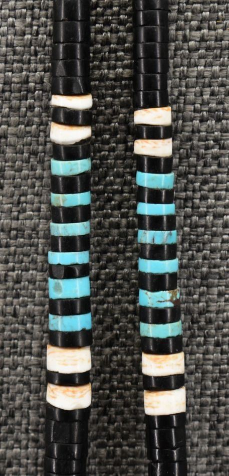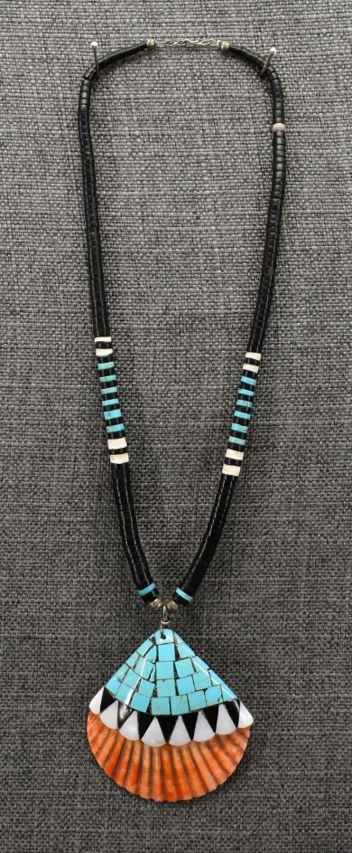 1970-80's Santo Domingo, single strand of Jett shell and turquoise beads 22" long with overlay shell pendant with turquoise Jett and shell design 3" x 3"