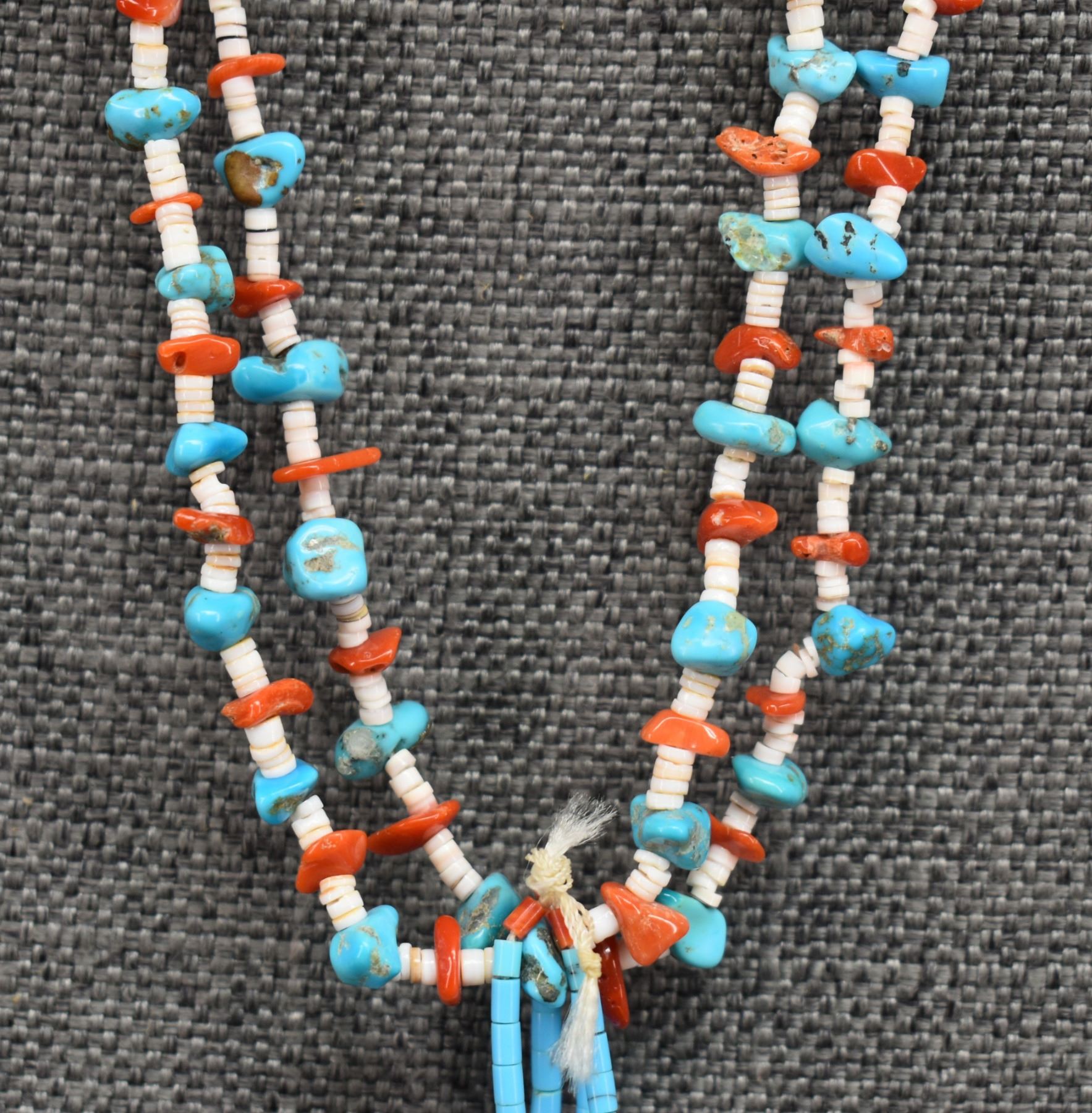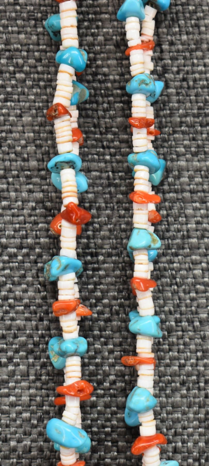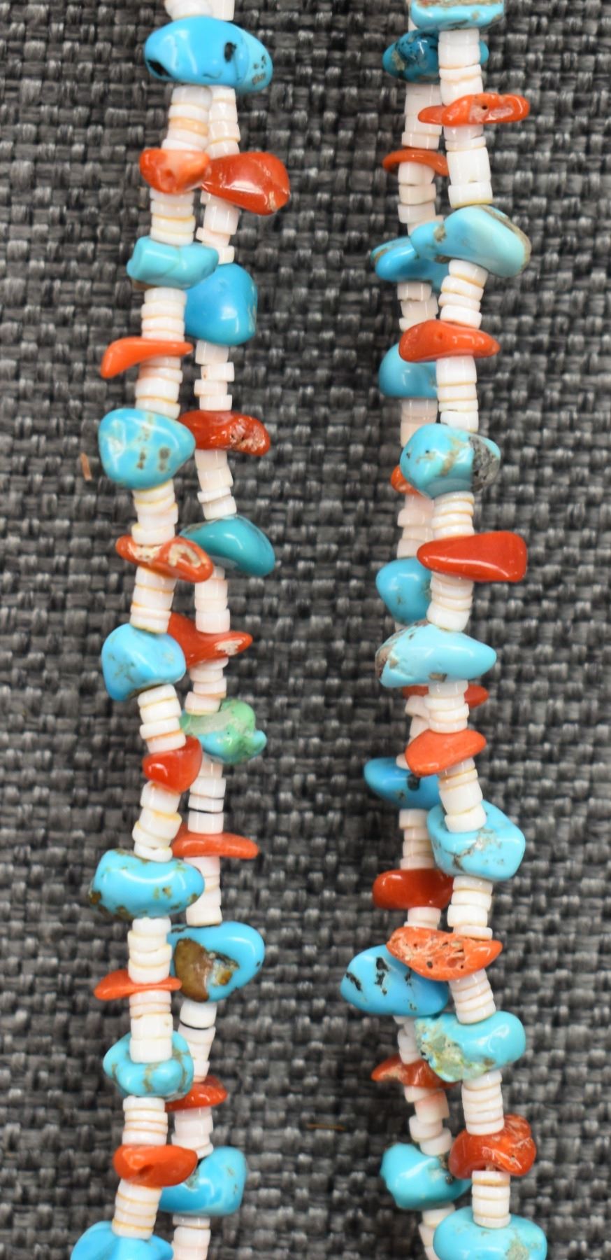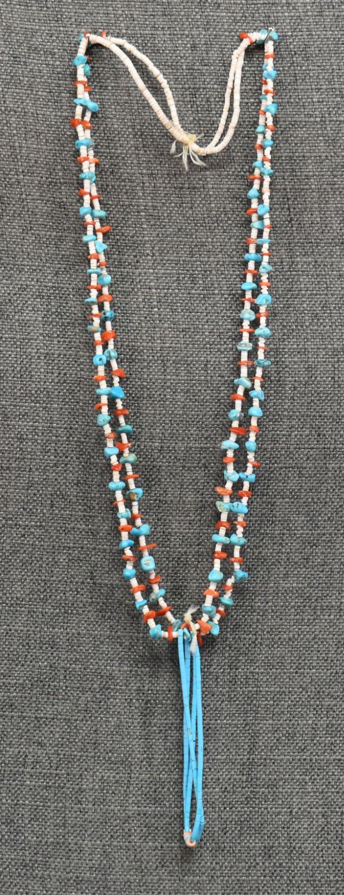 1980's Santo Domingo. Two stand turquoise shell and coral necklace 30'' long and joclas 4.5'' long