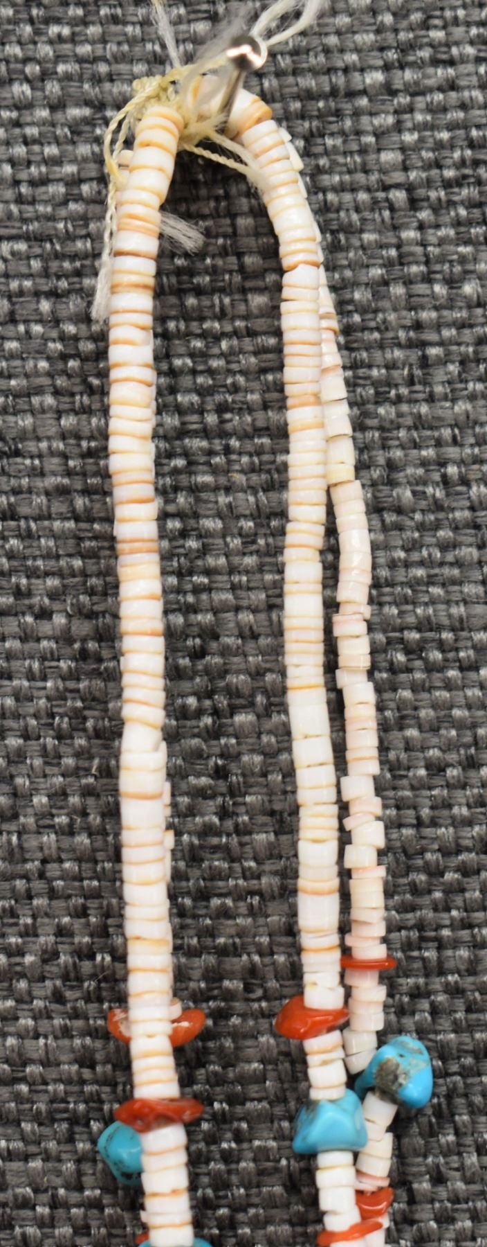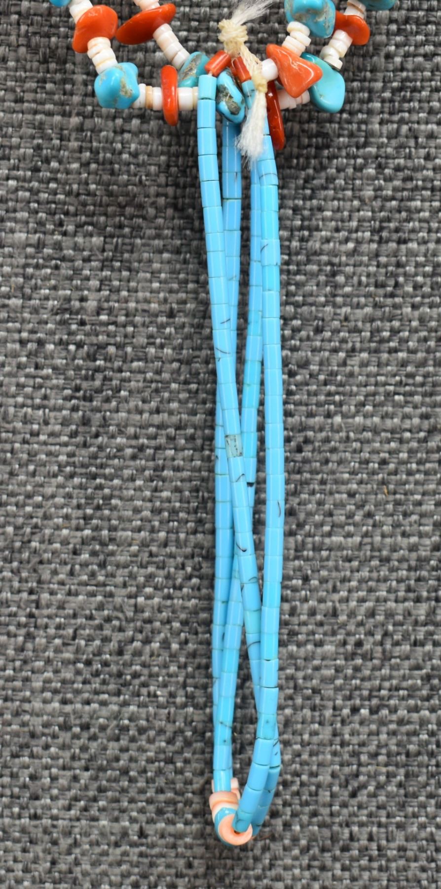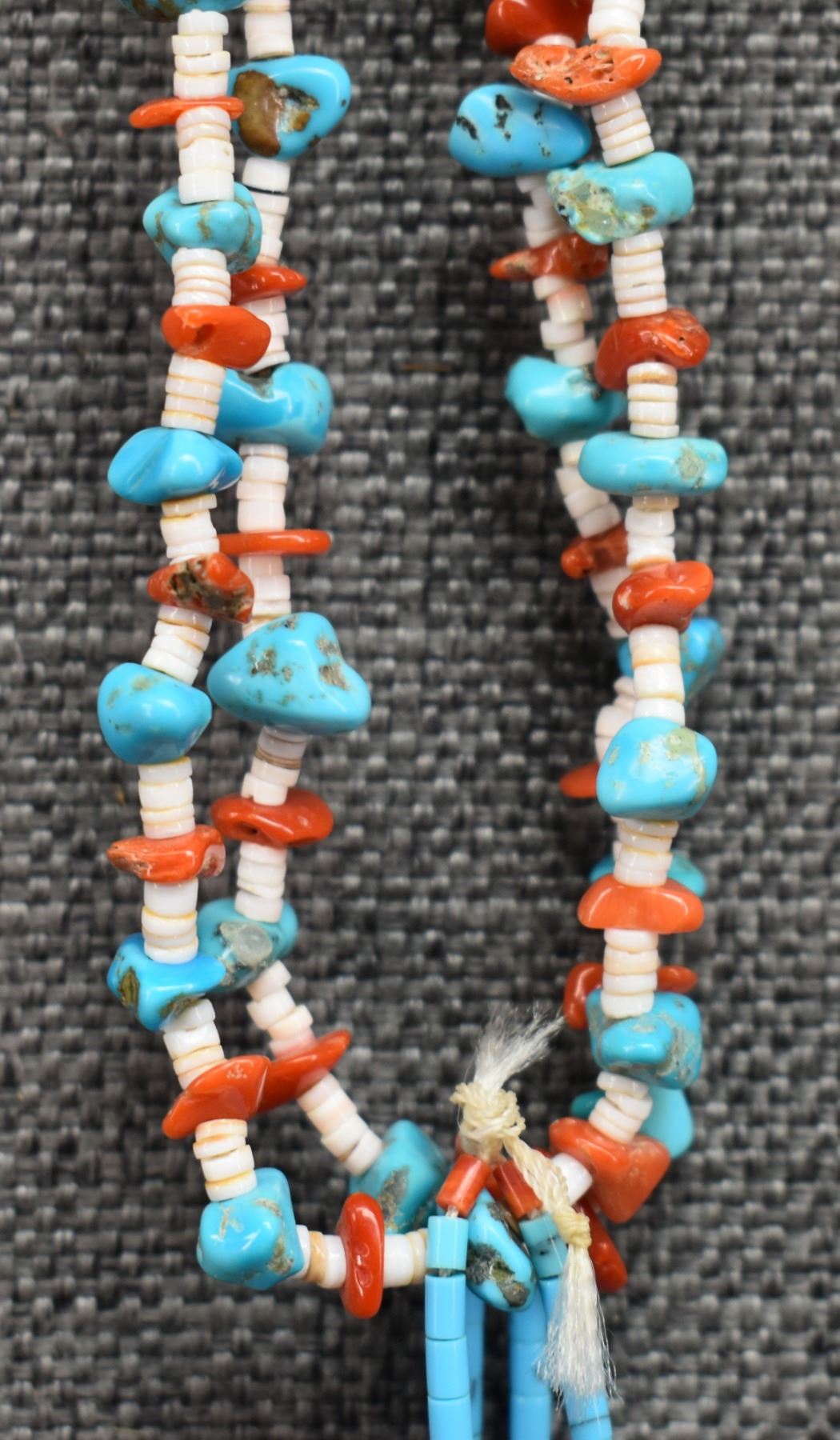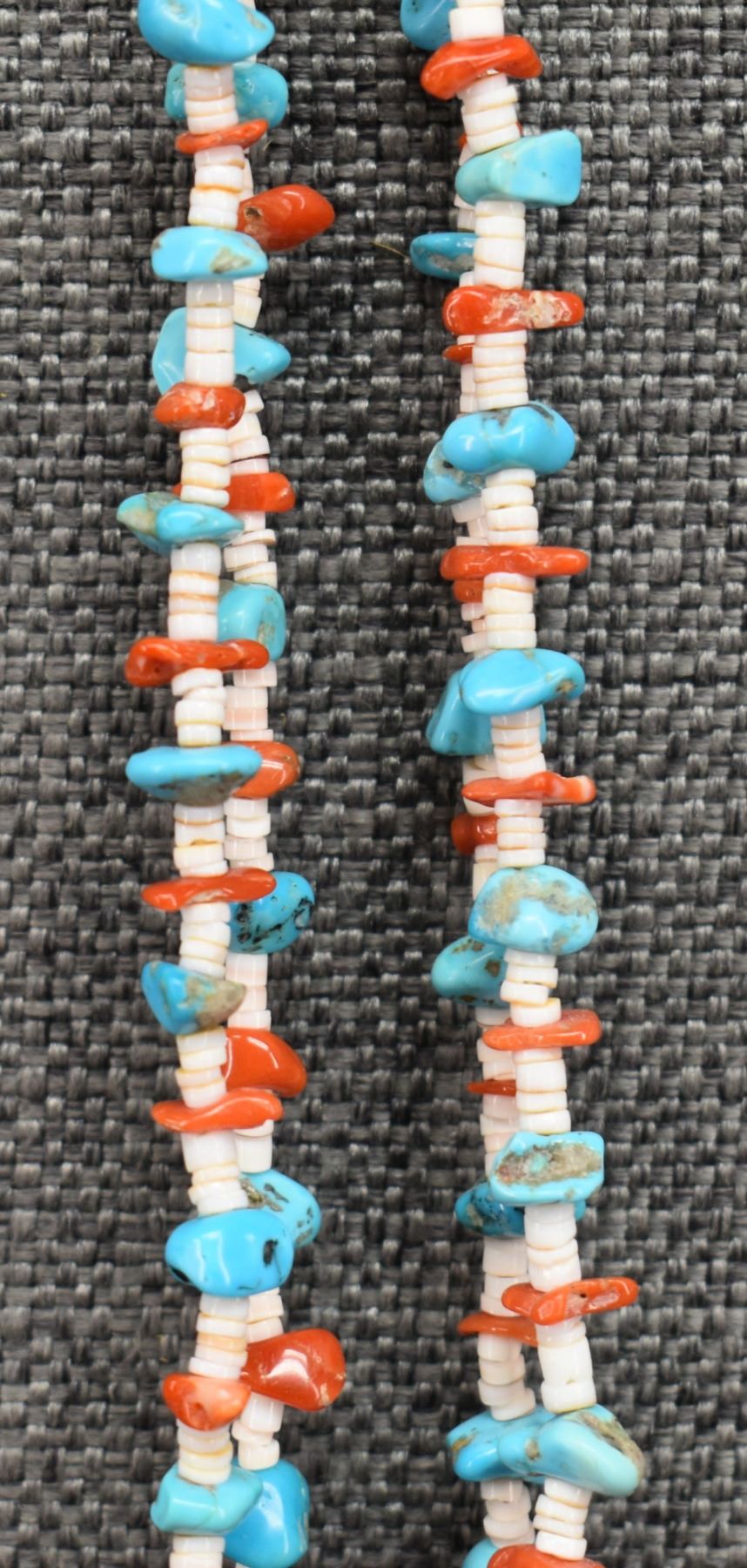 1980's Santo Domingo. Two stand turquoise shell and coral necklace 30'' long and joclas 4.5'' long