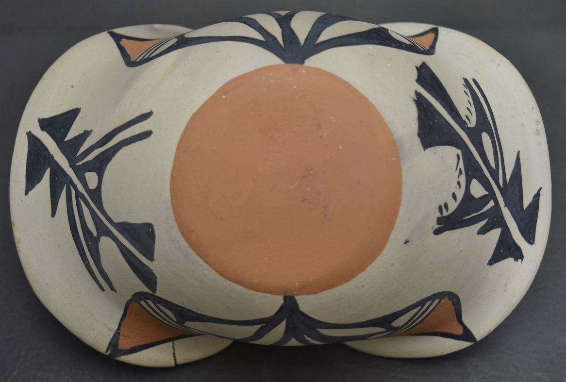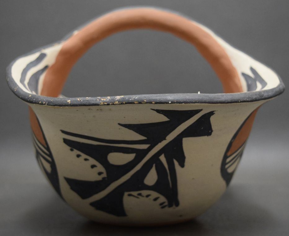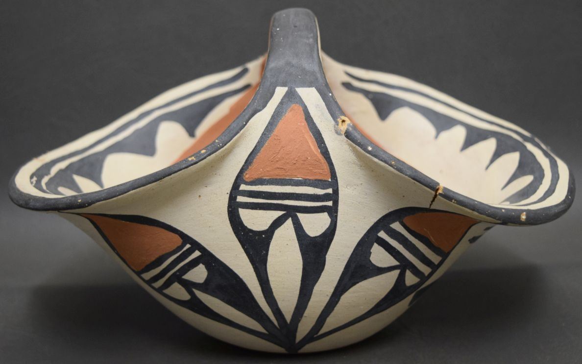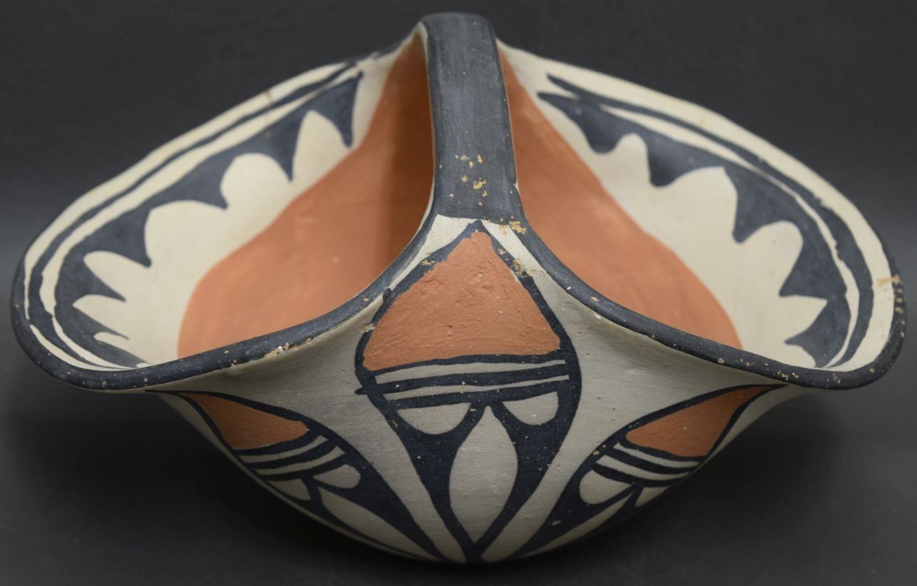 1960's hand coiled and painted polychrome floral design. Has crack. 6'' x 10'' x 6.5''