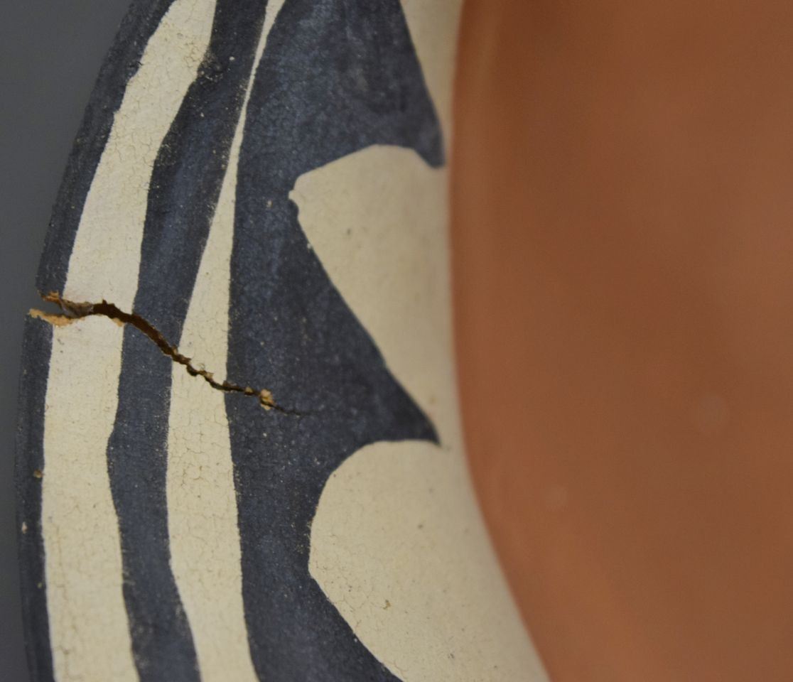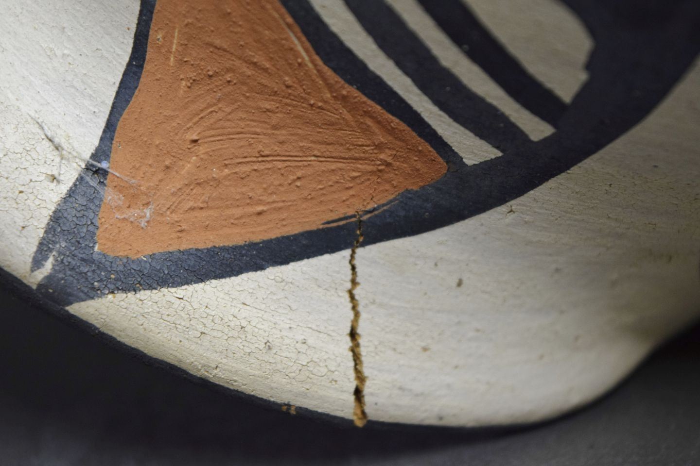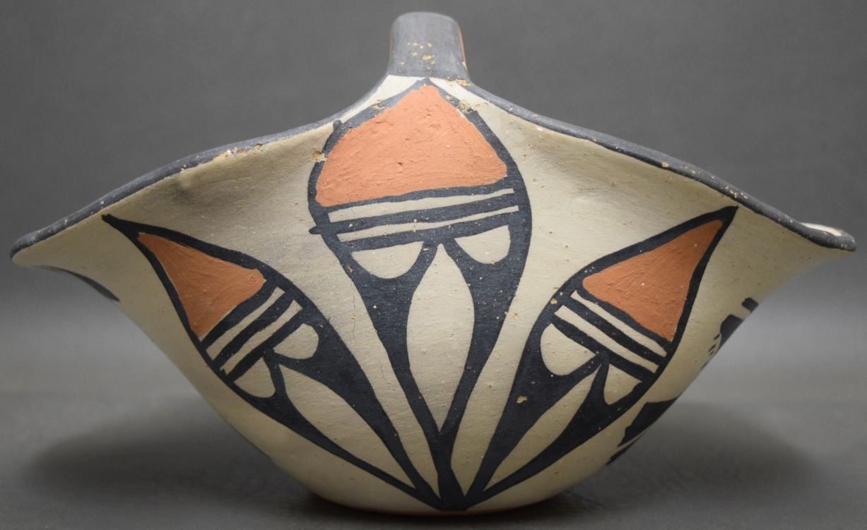 1960's hand coiled and painted polychrome floral design. Has crack. 6'' x 10'' x 6.5''