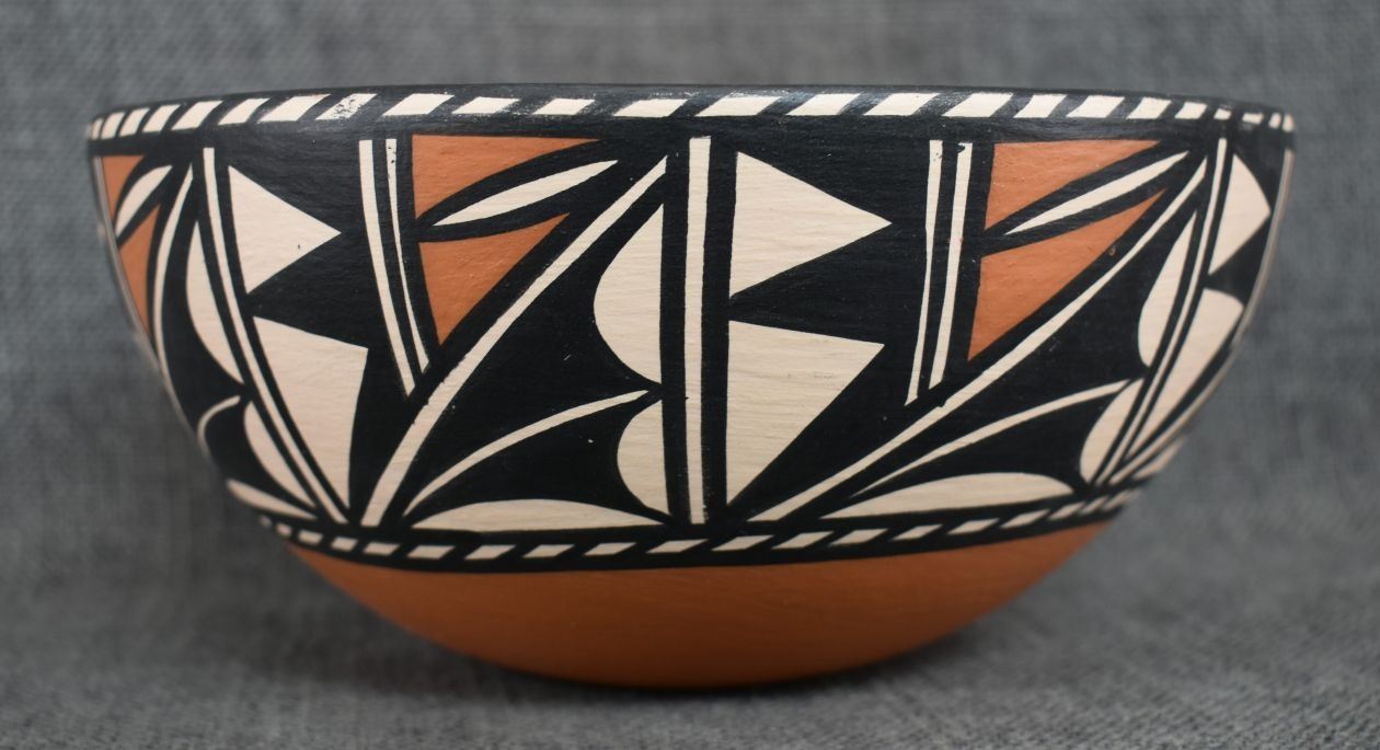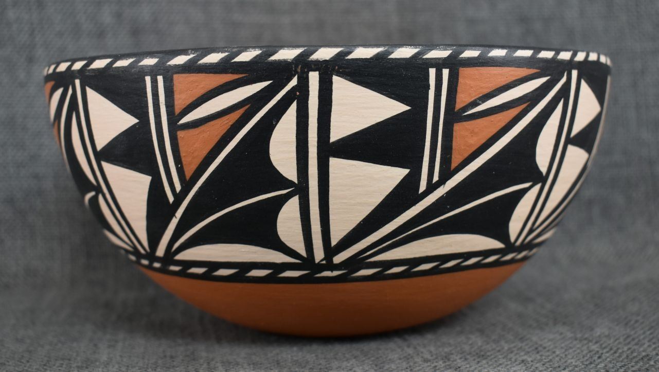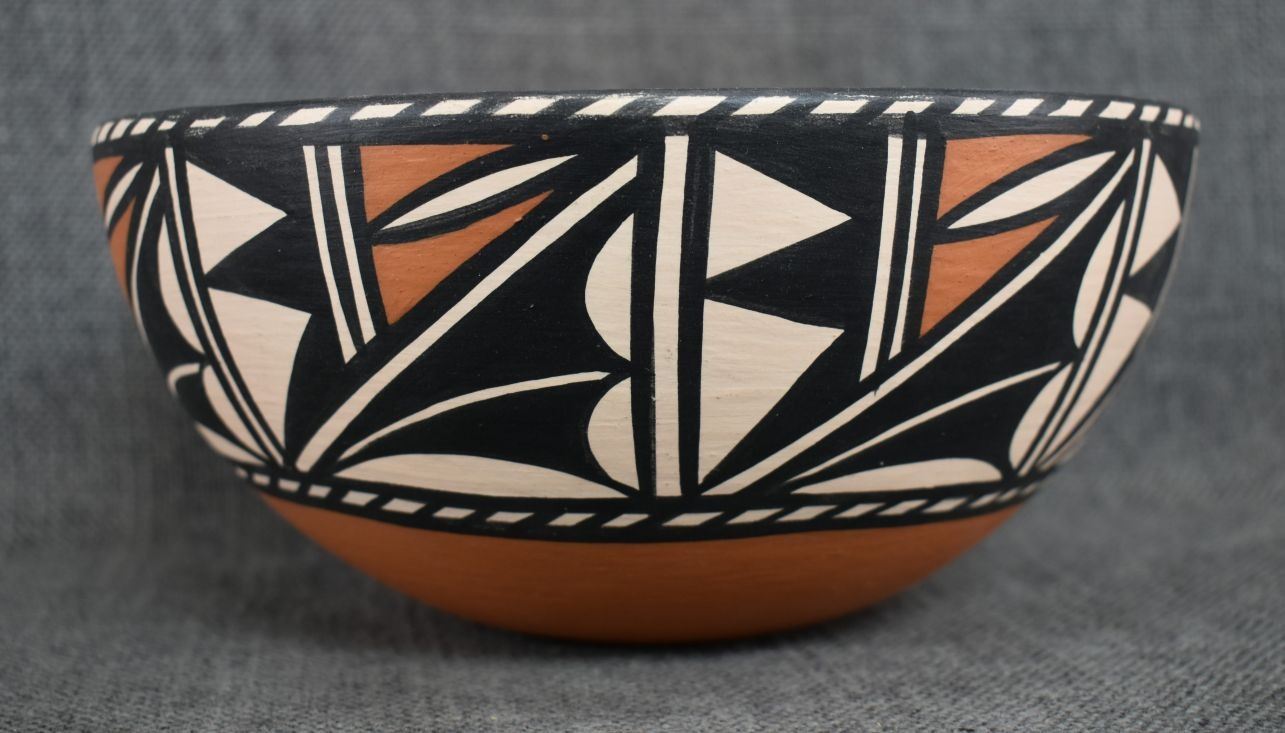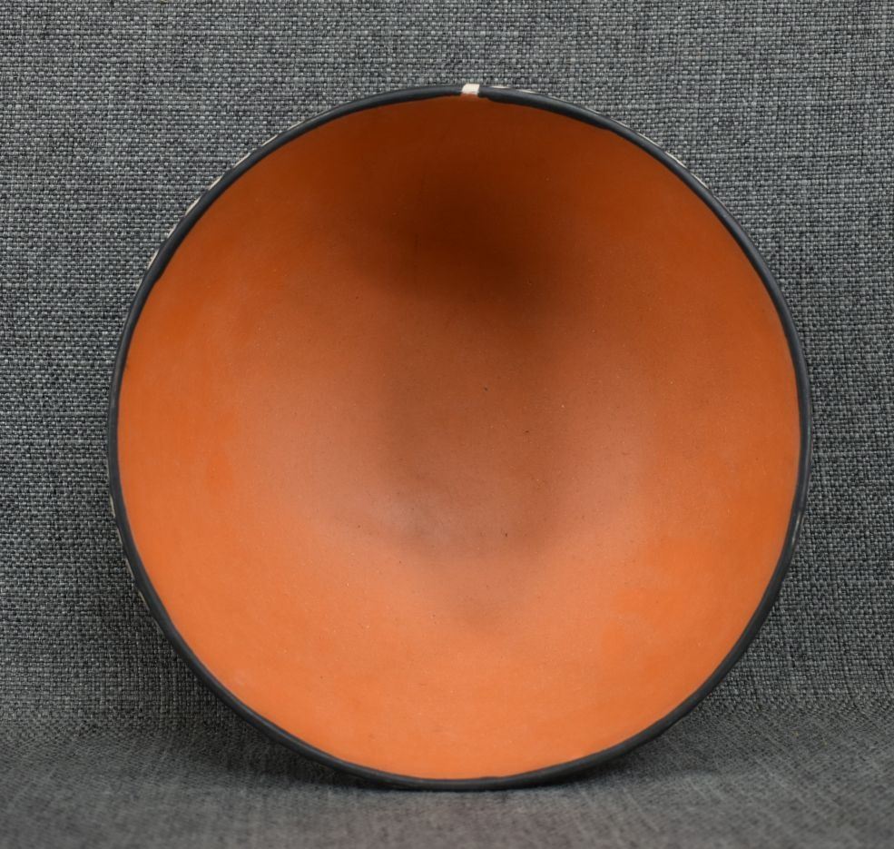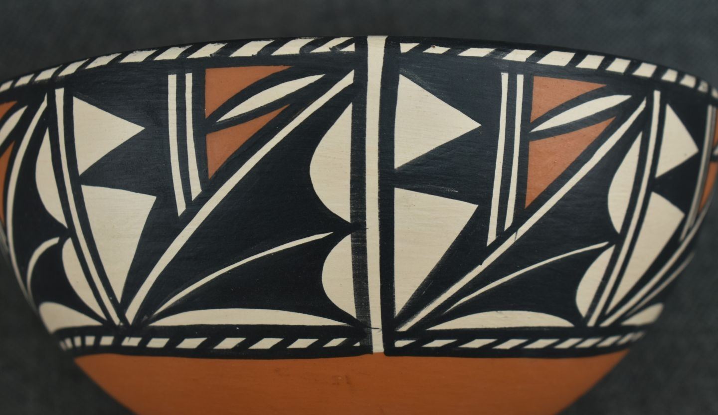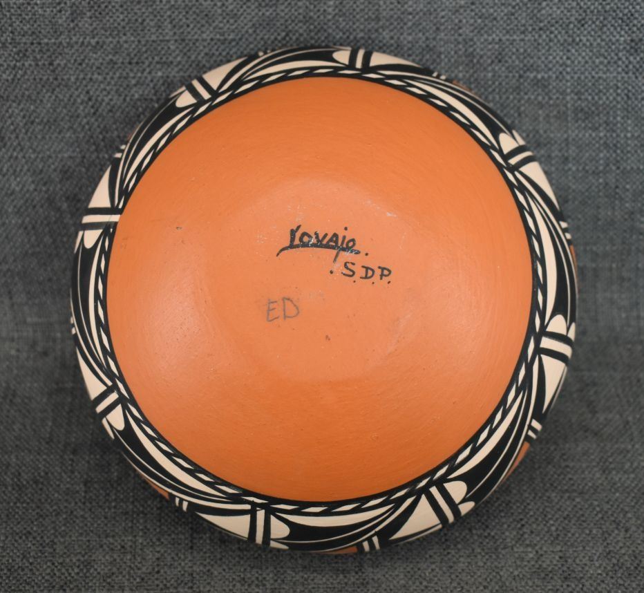 1990's Santo Domingo, hand coiled with polychrome painted geometric design signed Lovato 3.75" x 8"