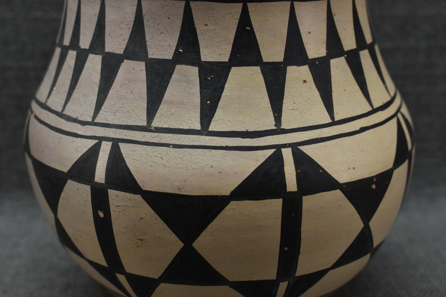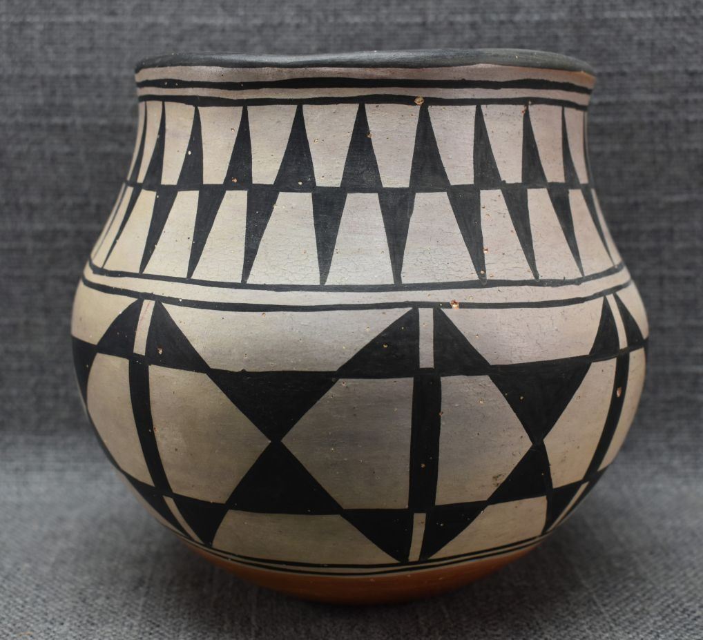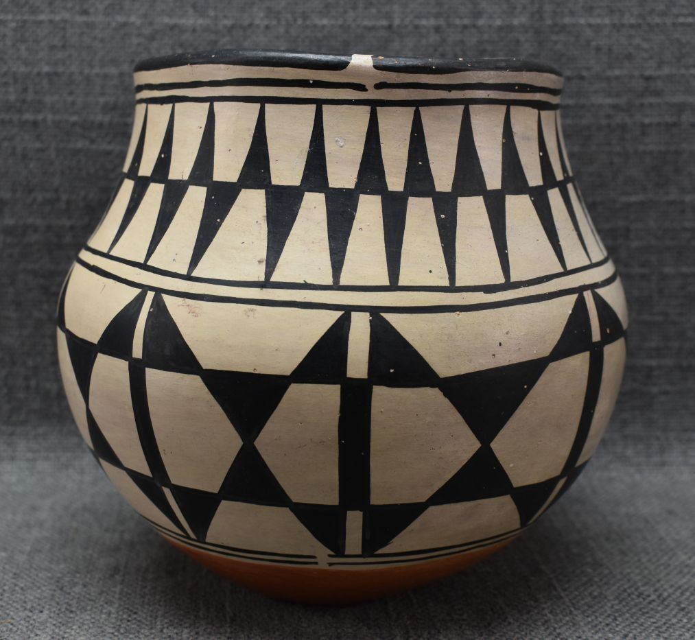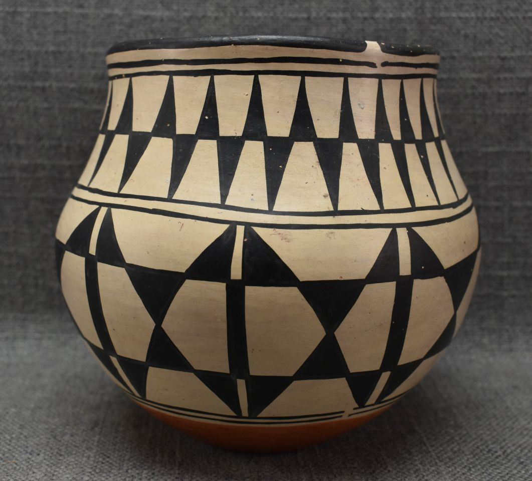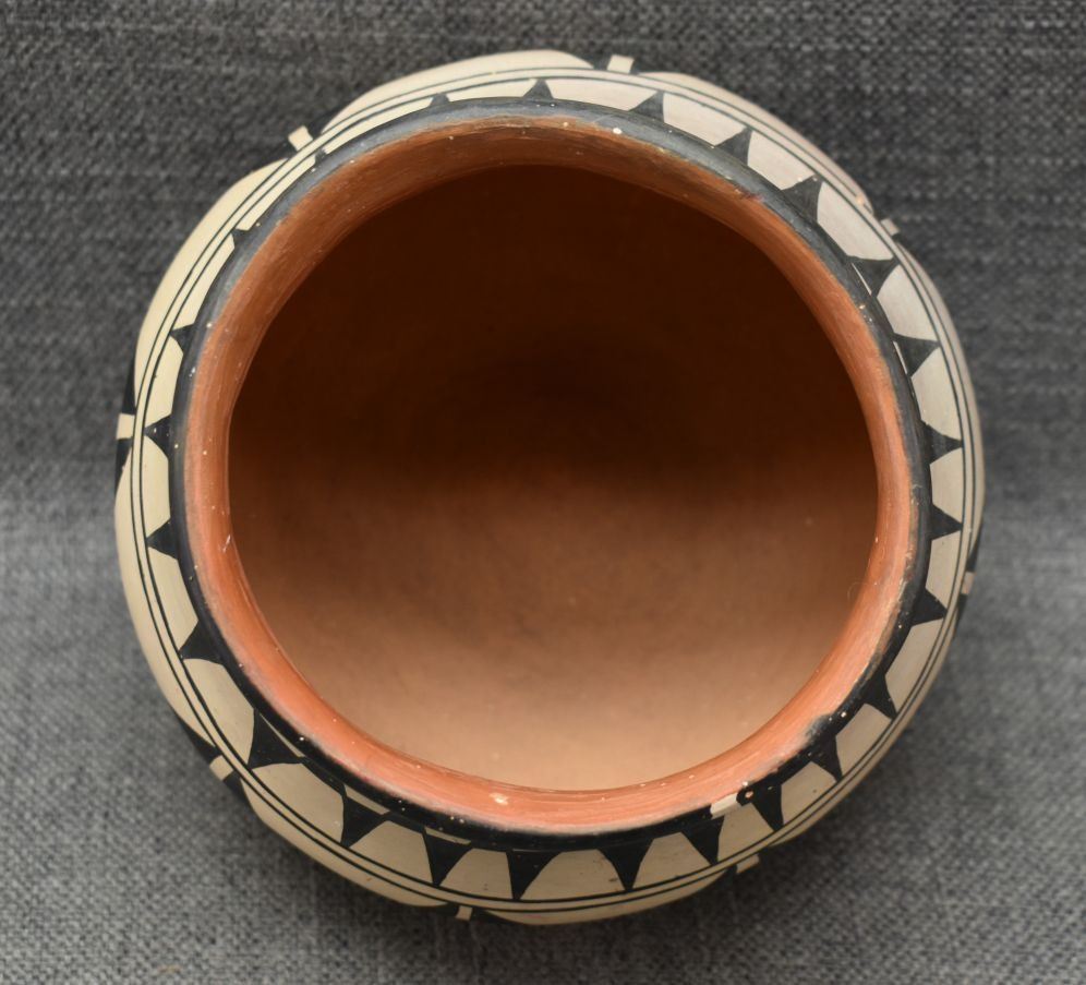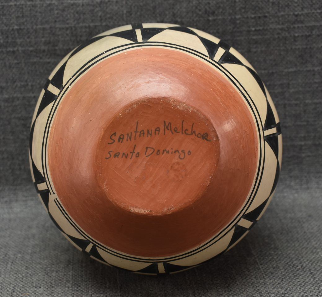1960's. santo Domingo. hand coiled and painted traditional design pottery bowl signed Santana Melcher. 6.5'' x 6.5''