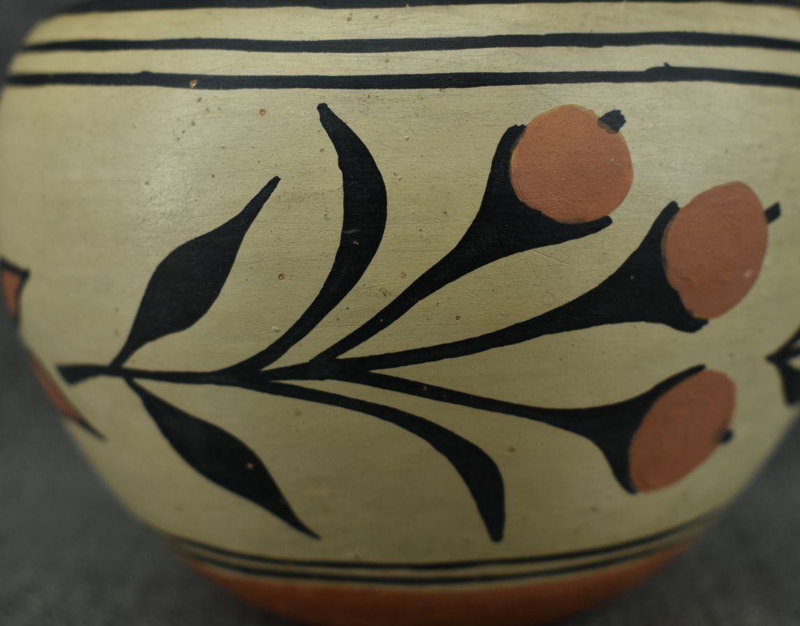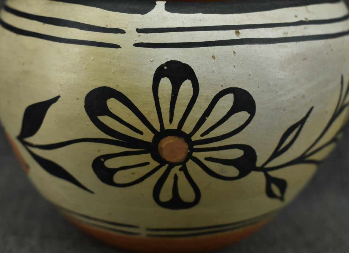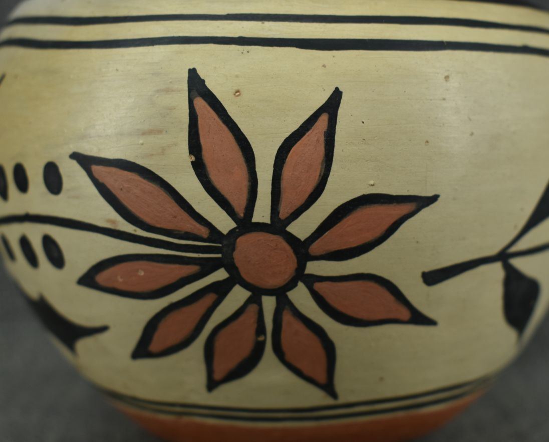 1950's Santo Domingo, hand coiled with polychrome painted floral design signed Santana Melchor 3.5" x 4.75"