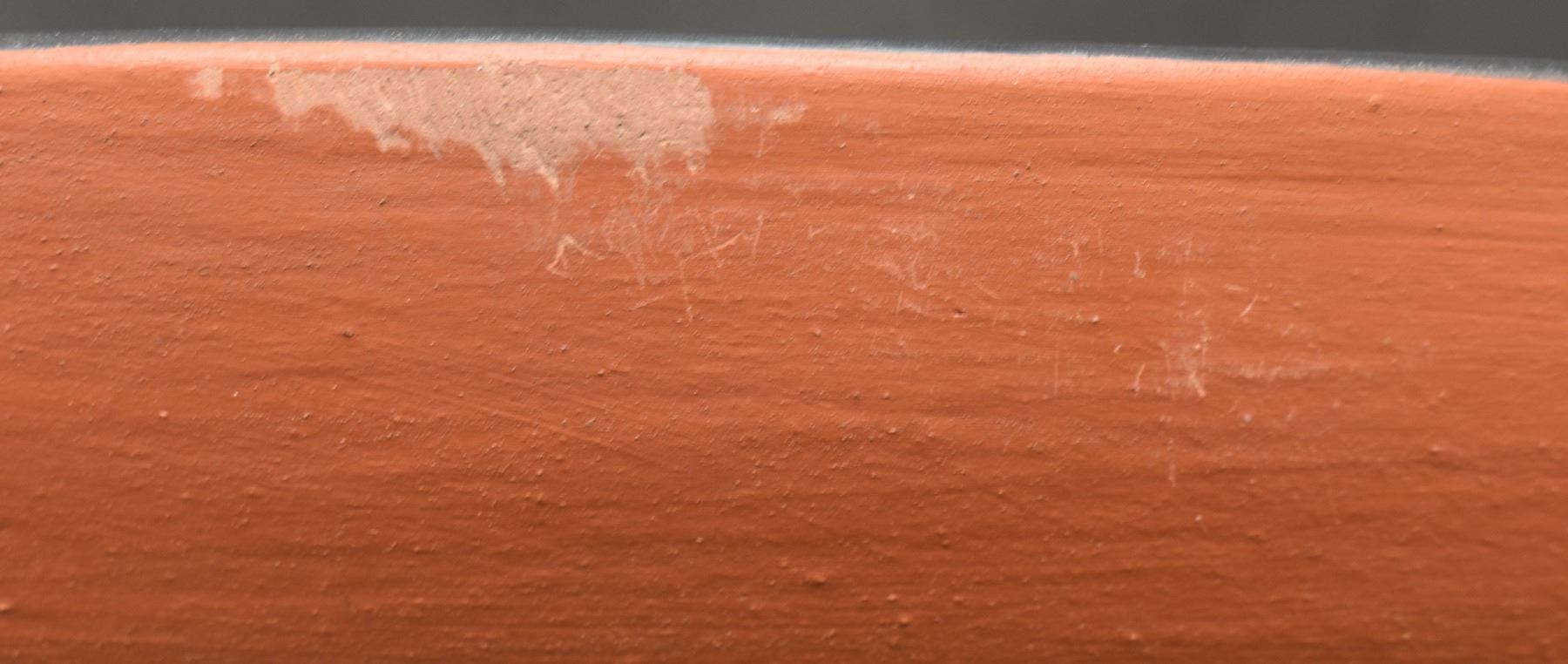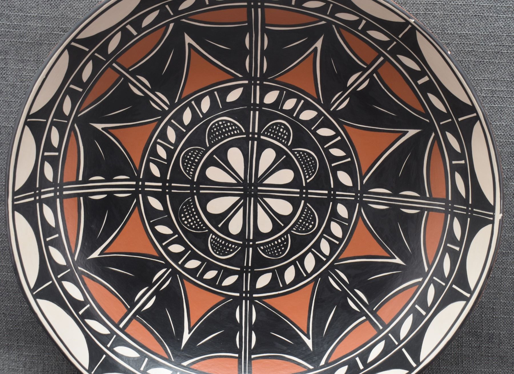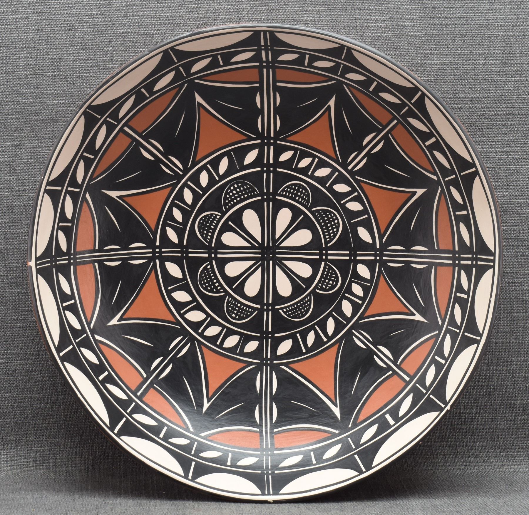 2000 Santo Domingo, hand coiled with polychrome painted geometric design signed Thomas Tenorio 4" x 18"