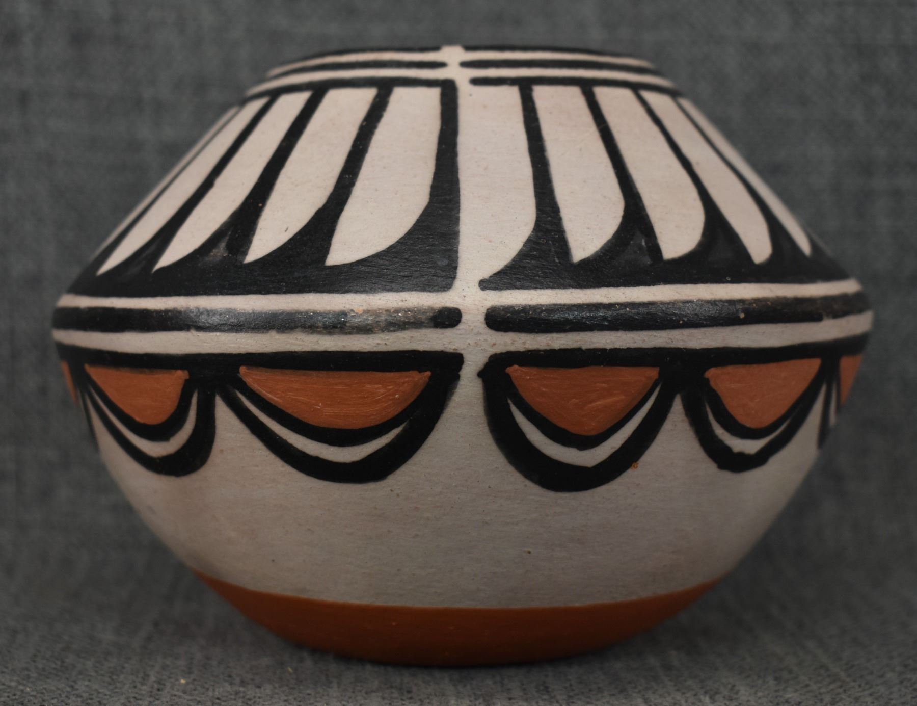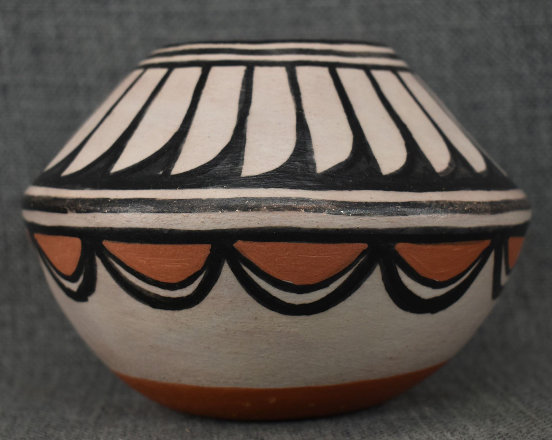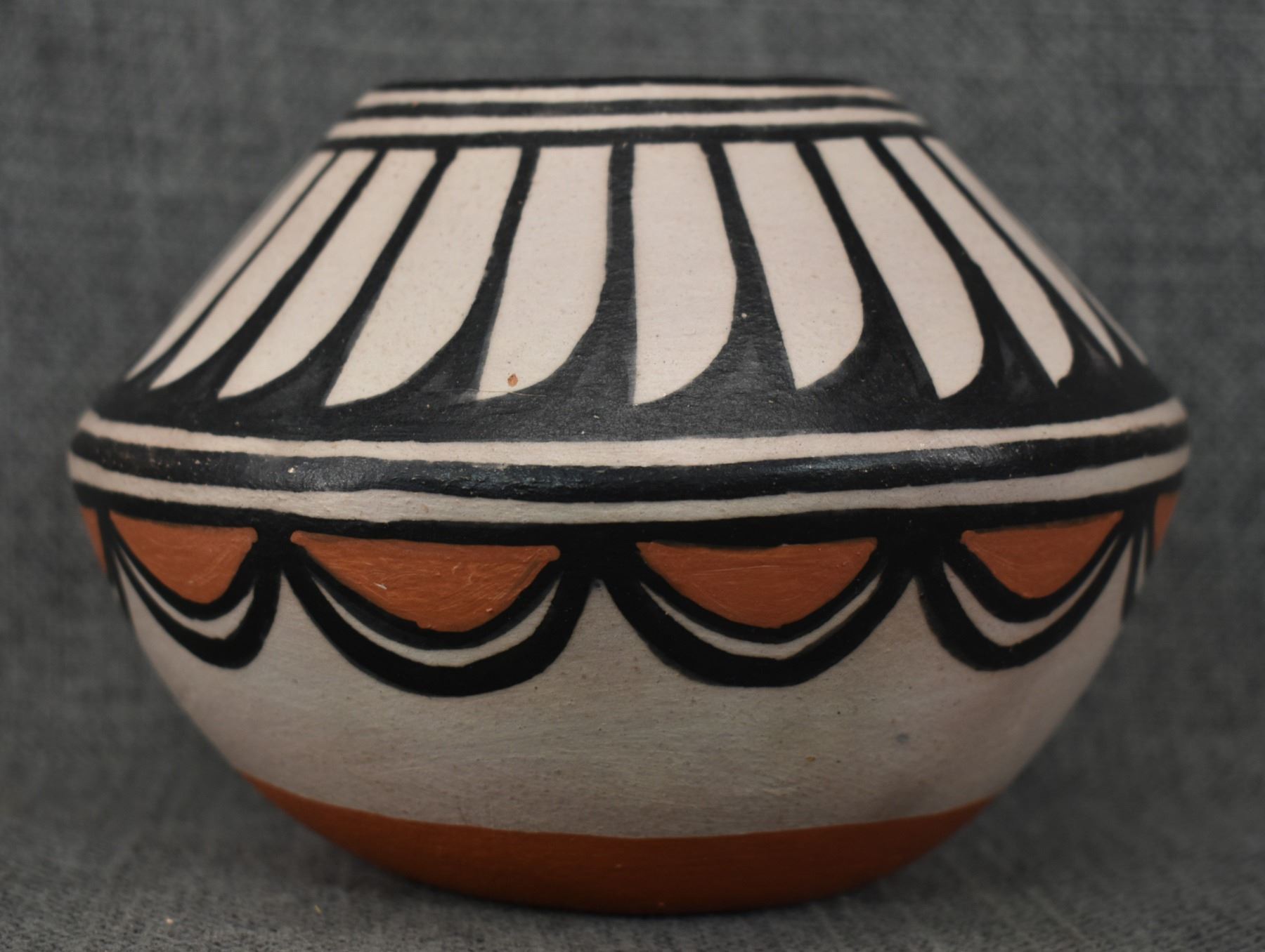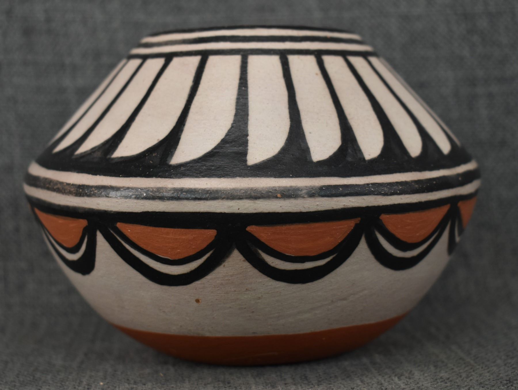 1990-2000's Santo Domingo, hand coiled with polychrome painted feather design by Robert Tenorio 4.5" x 6"