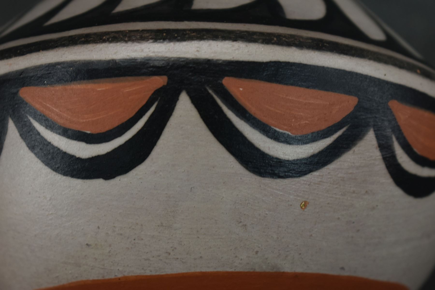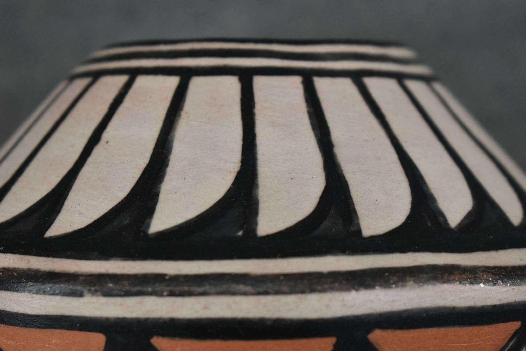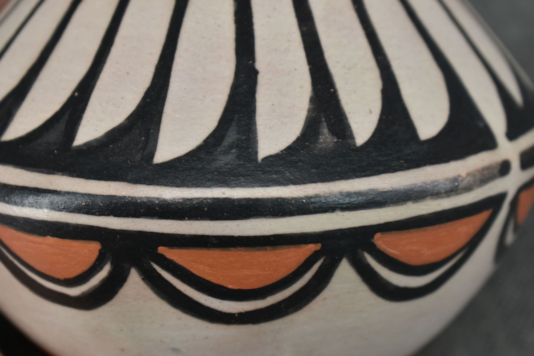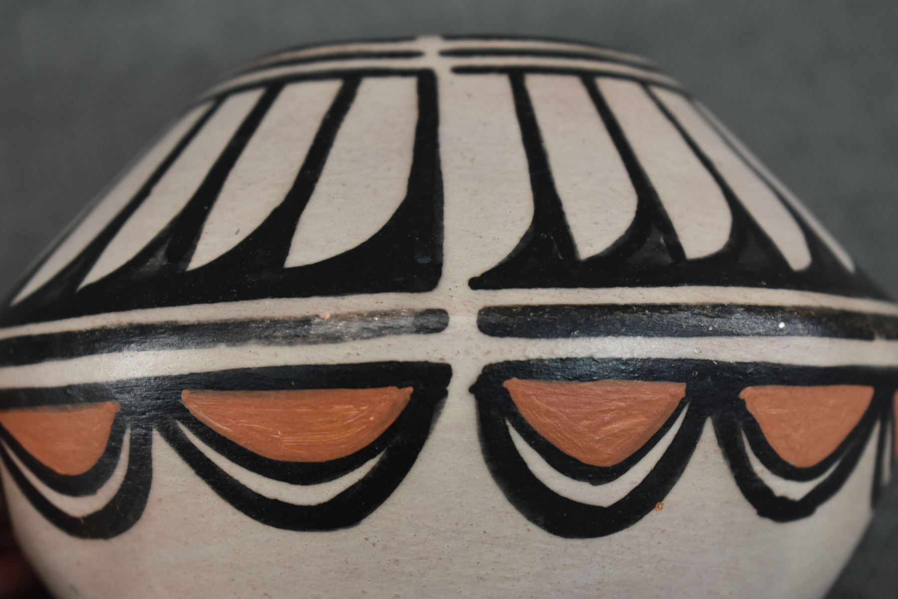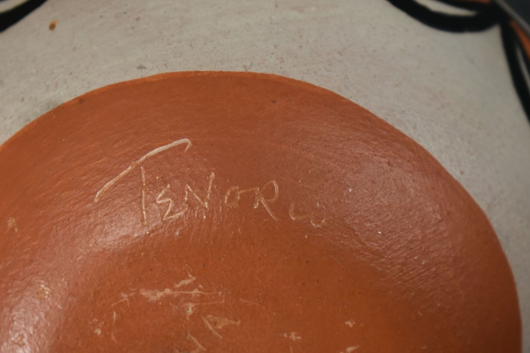 1990-2000's Santo Domingo, hand coiled with polychrome painted feather design by Robert Tenorio 4.5" x 6"