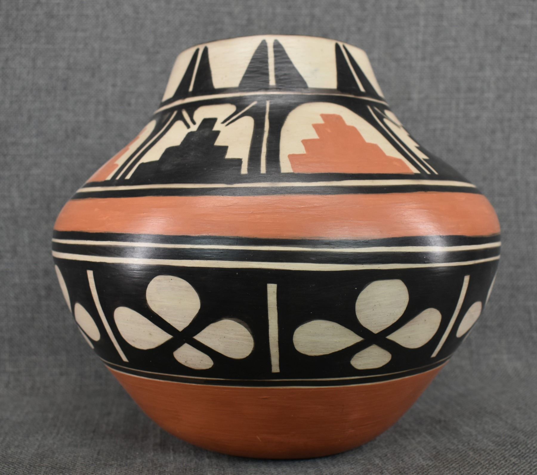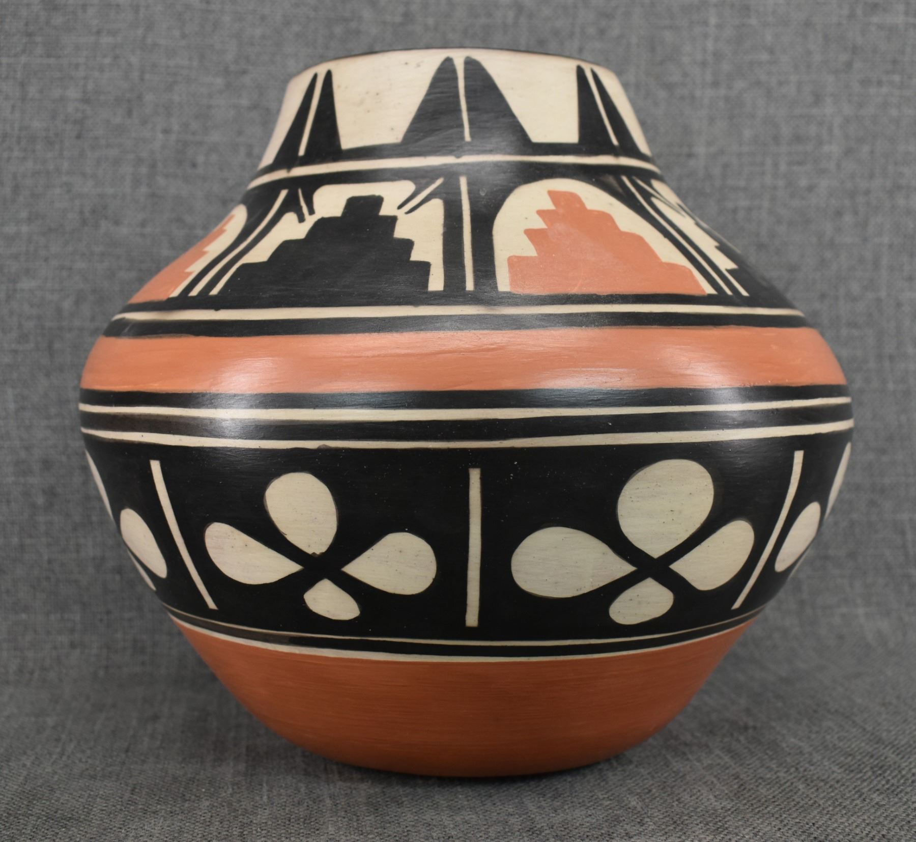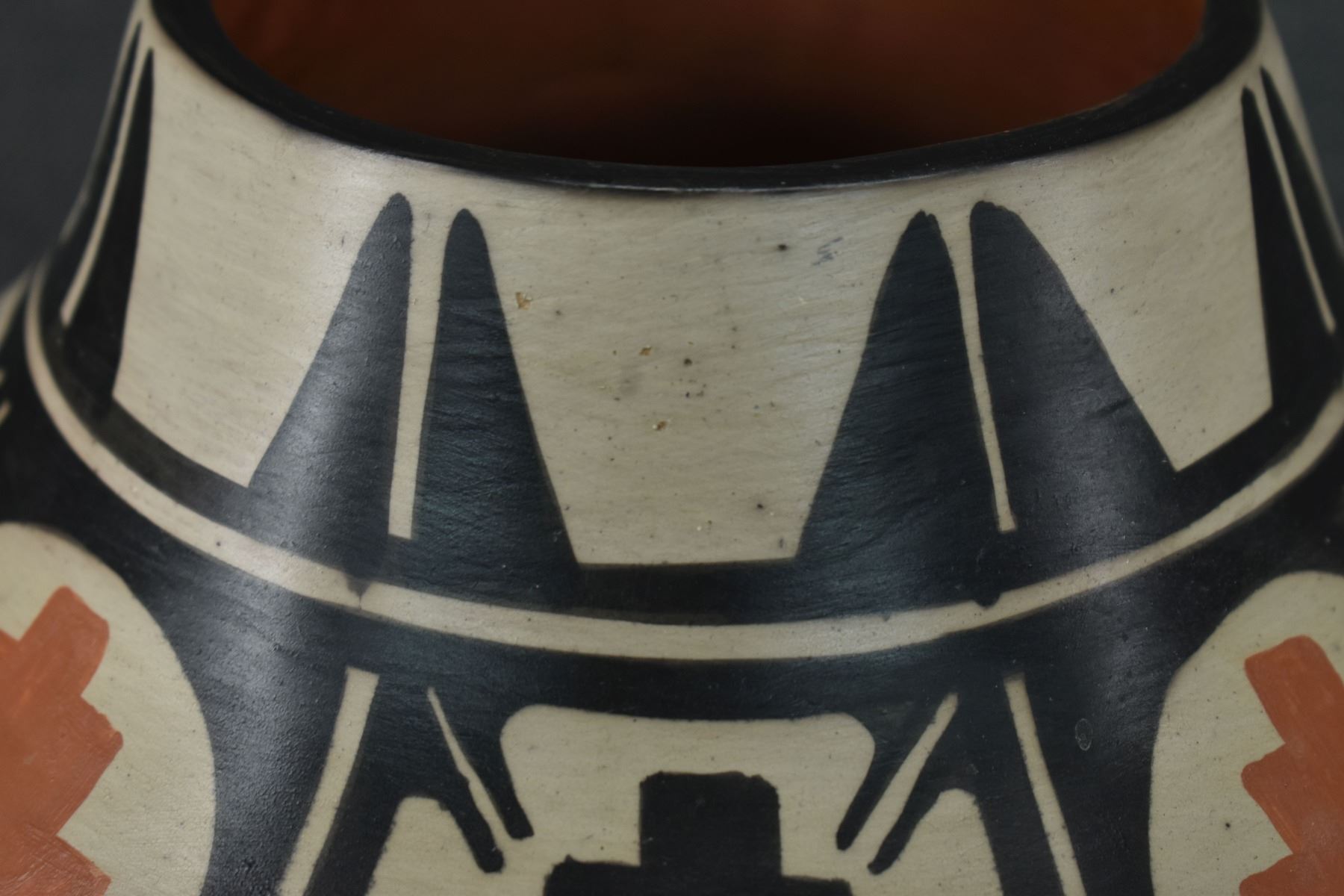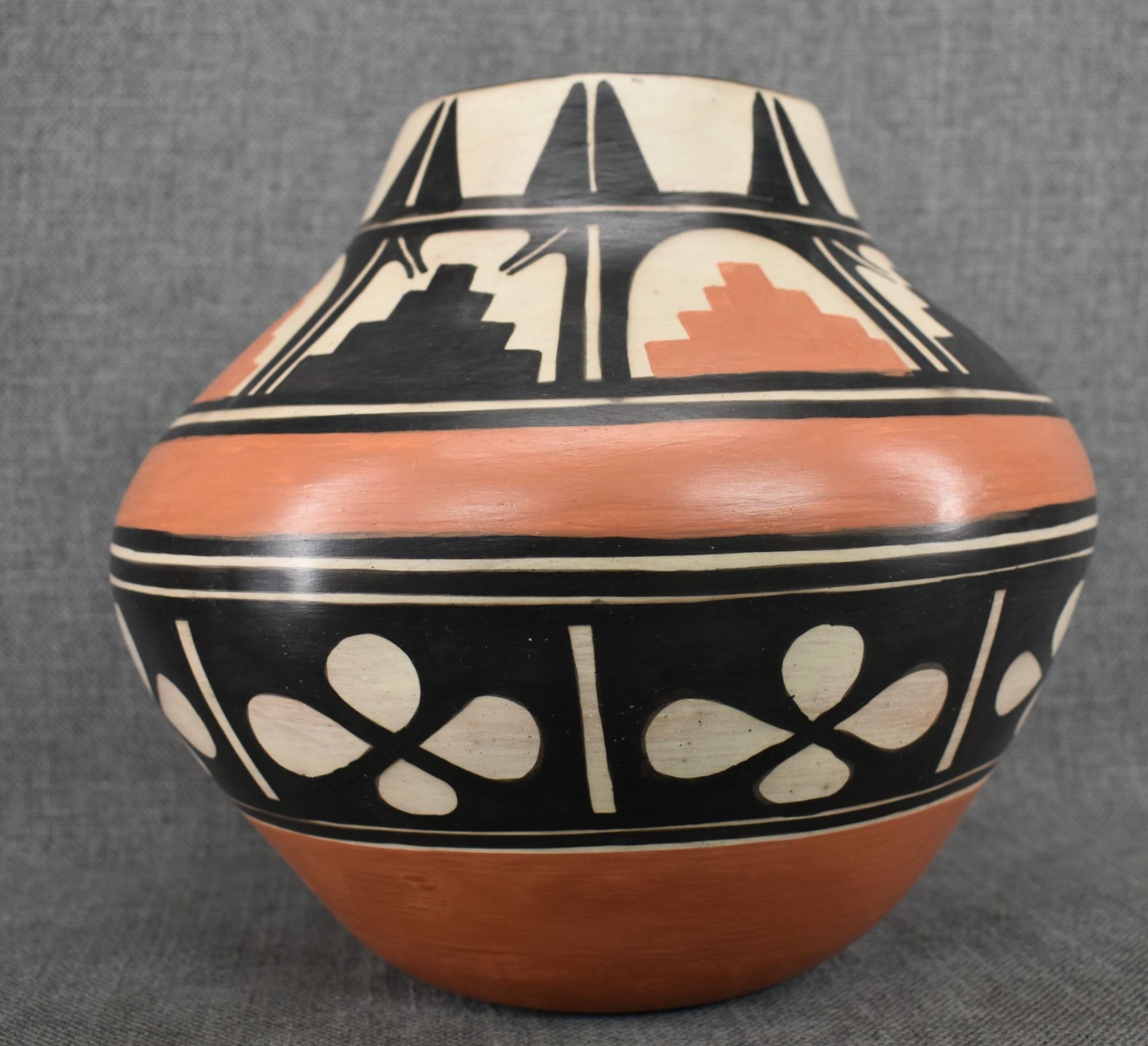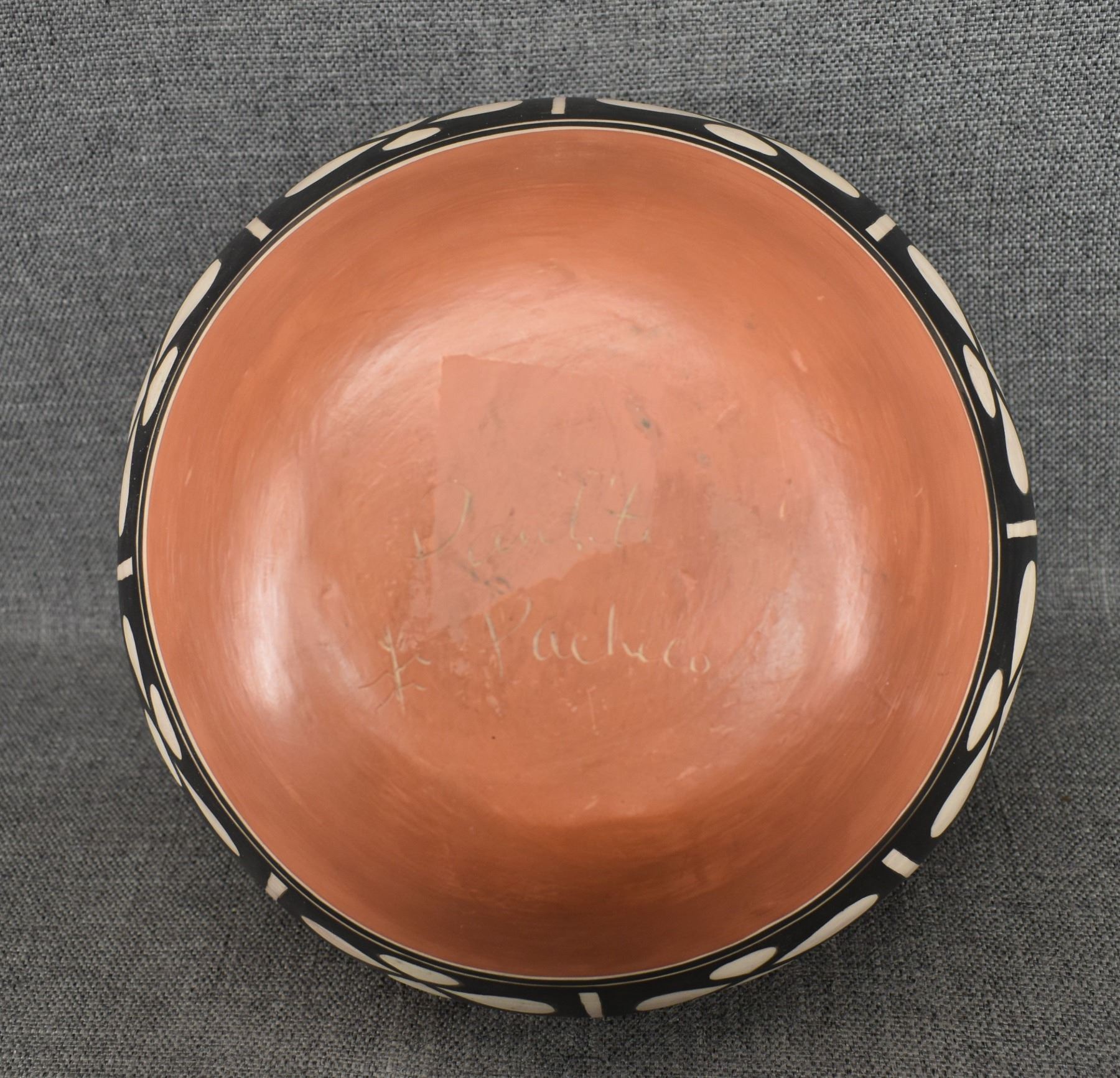 1980-90's Santo Domingo, hand coiled with polychrome painted floral and mesa design signed Paulito Pacheco. 9.5" x 10"