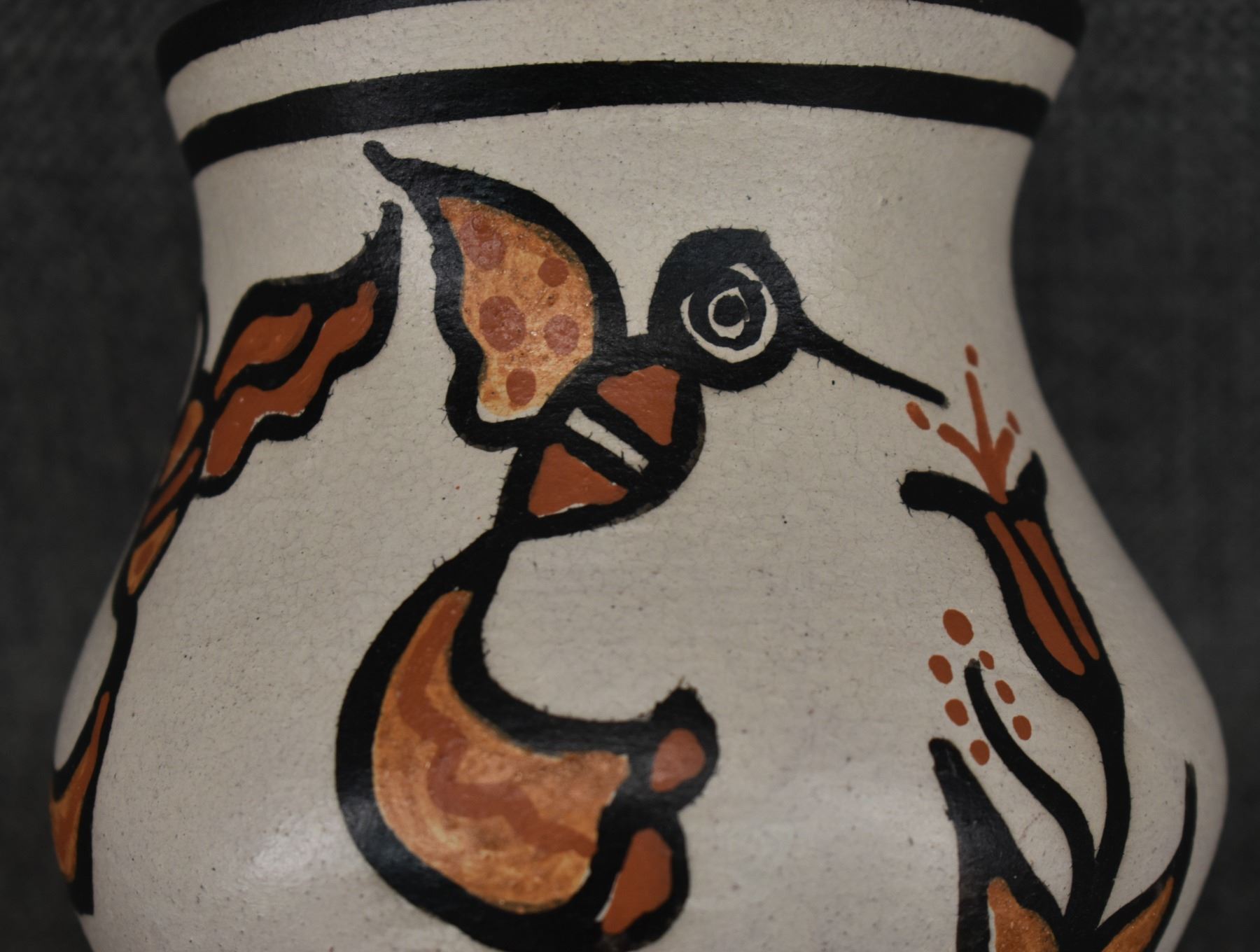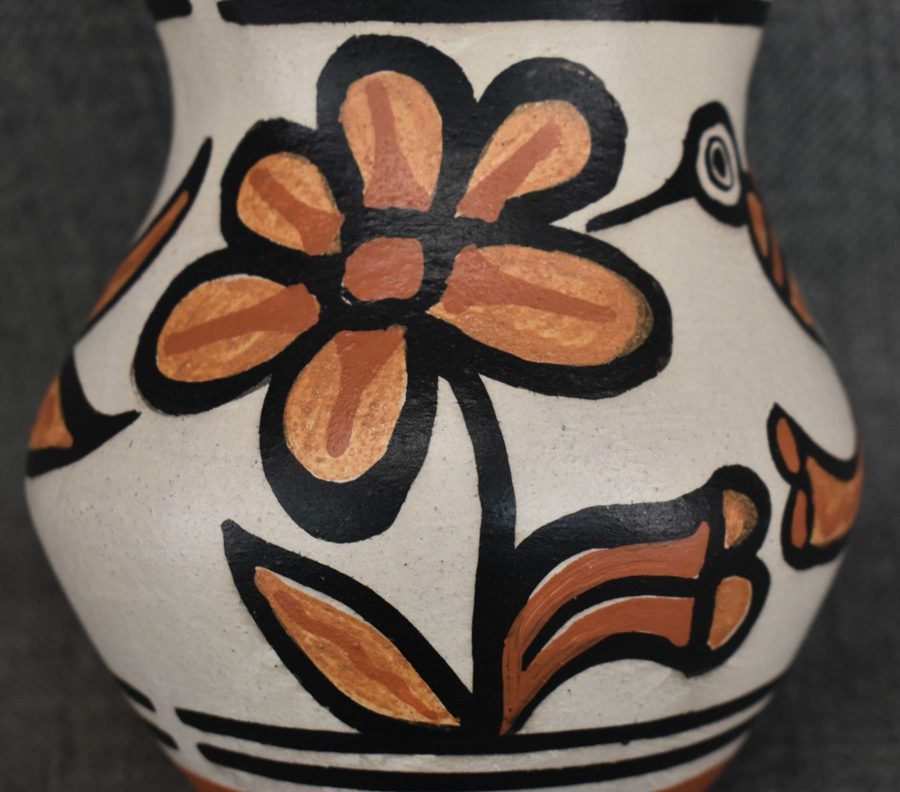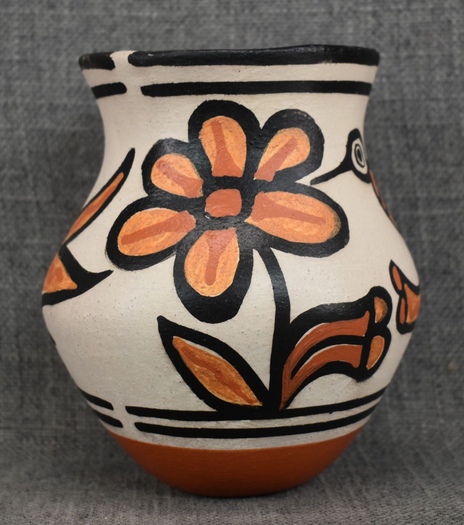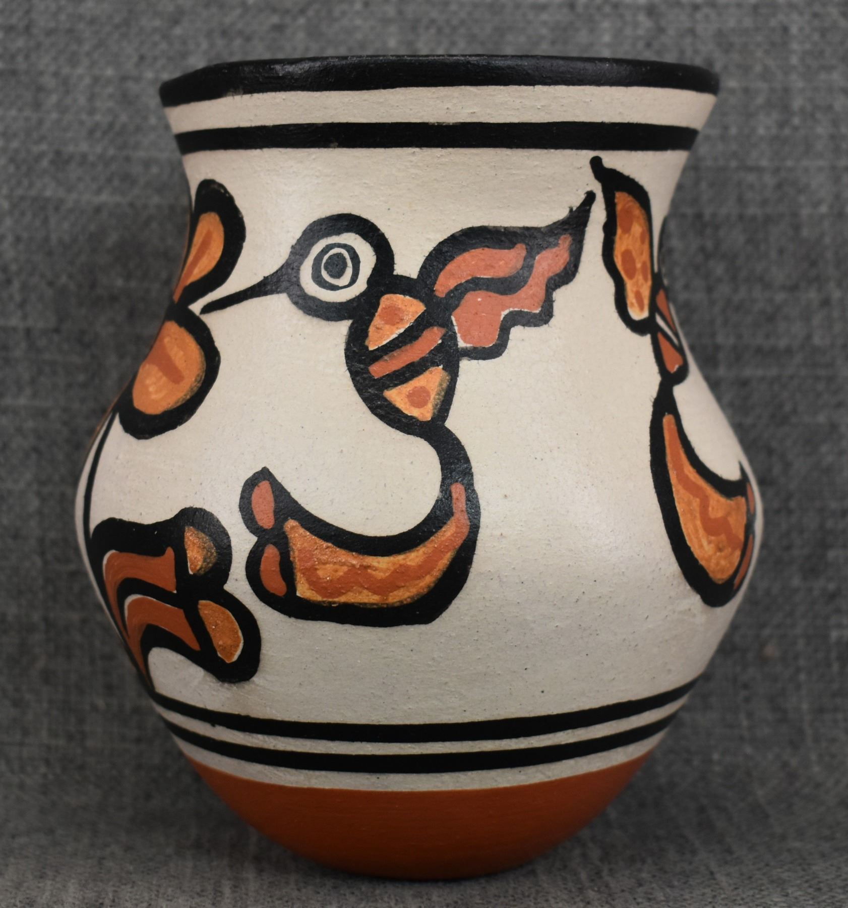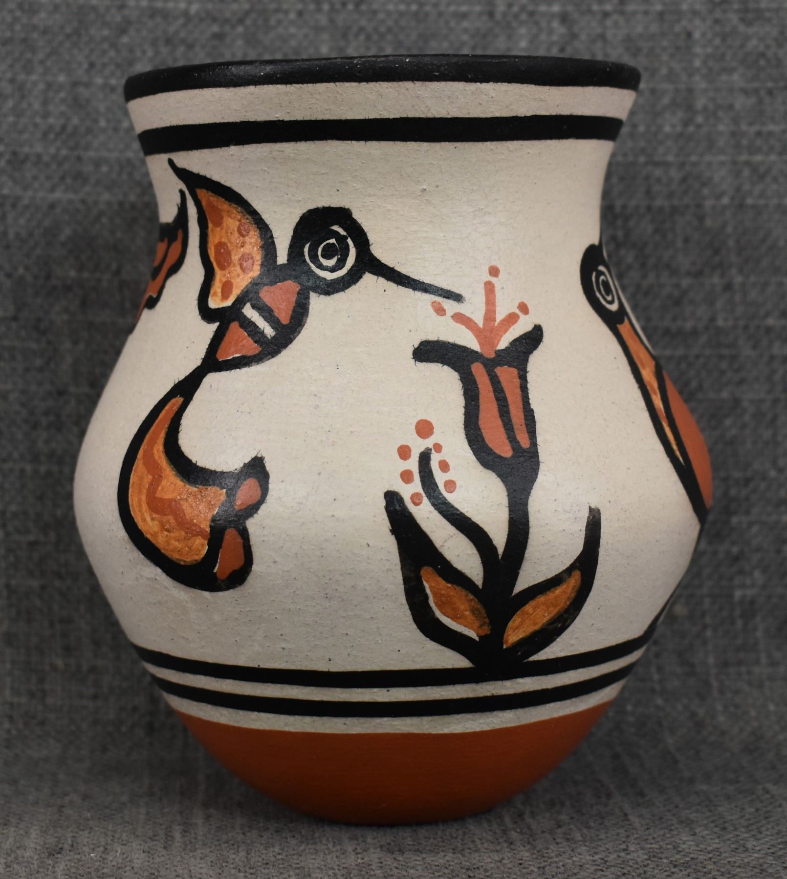 2000's Santo Domingo, hand coiled with polychrome painted hummingbird and floral design signed Rose Pacheco. 6" x 4.75"