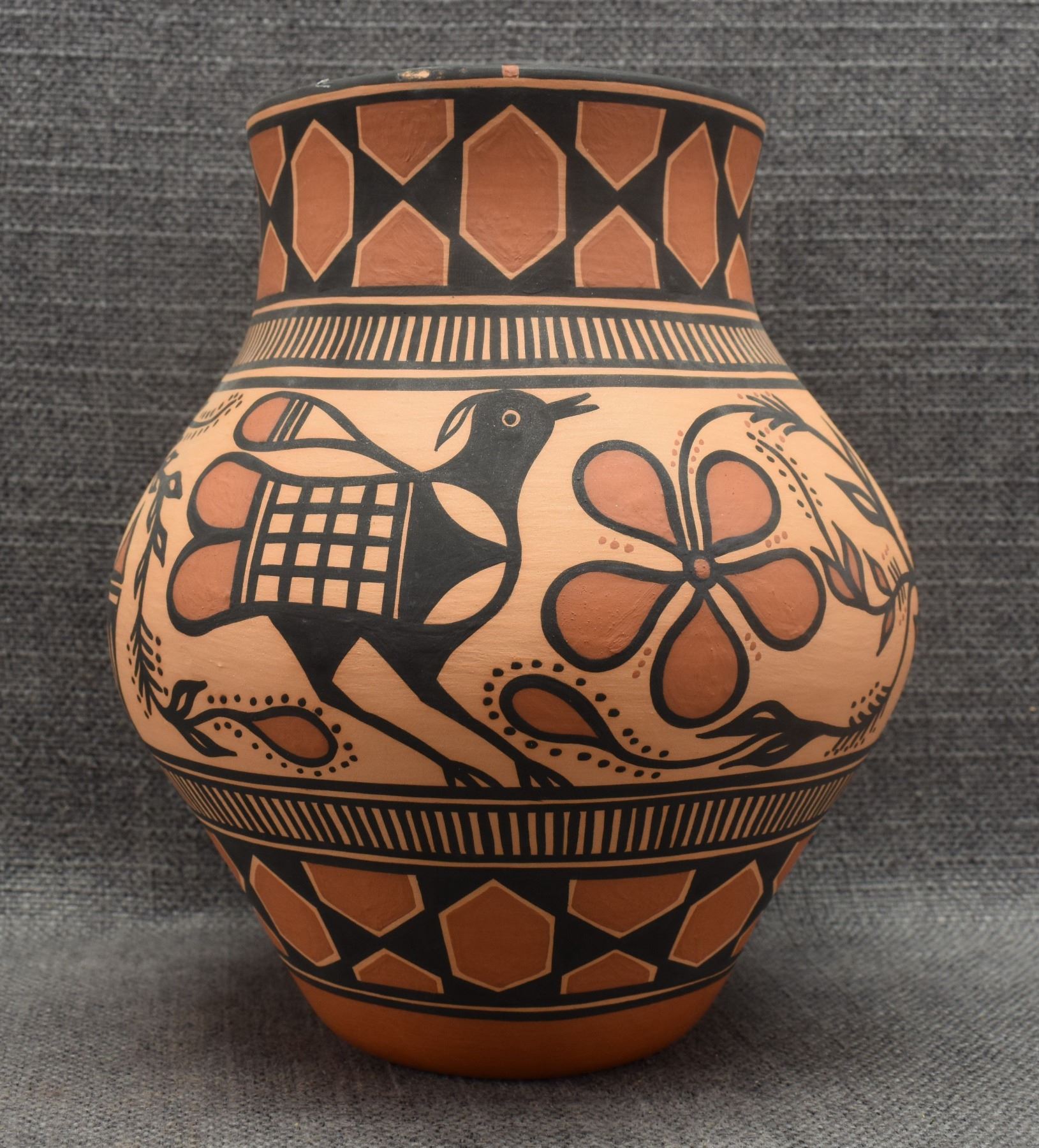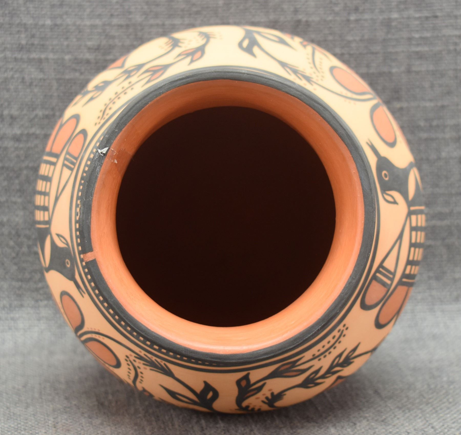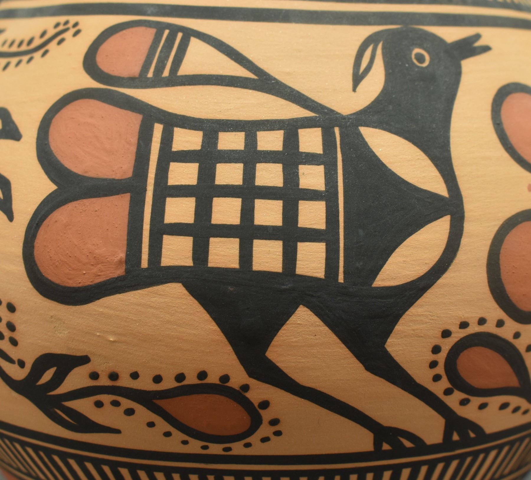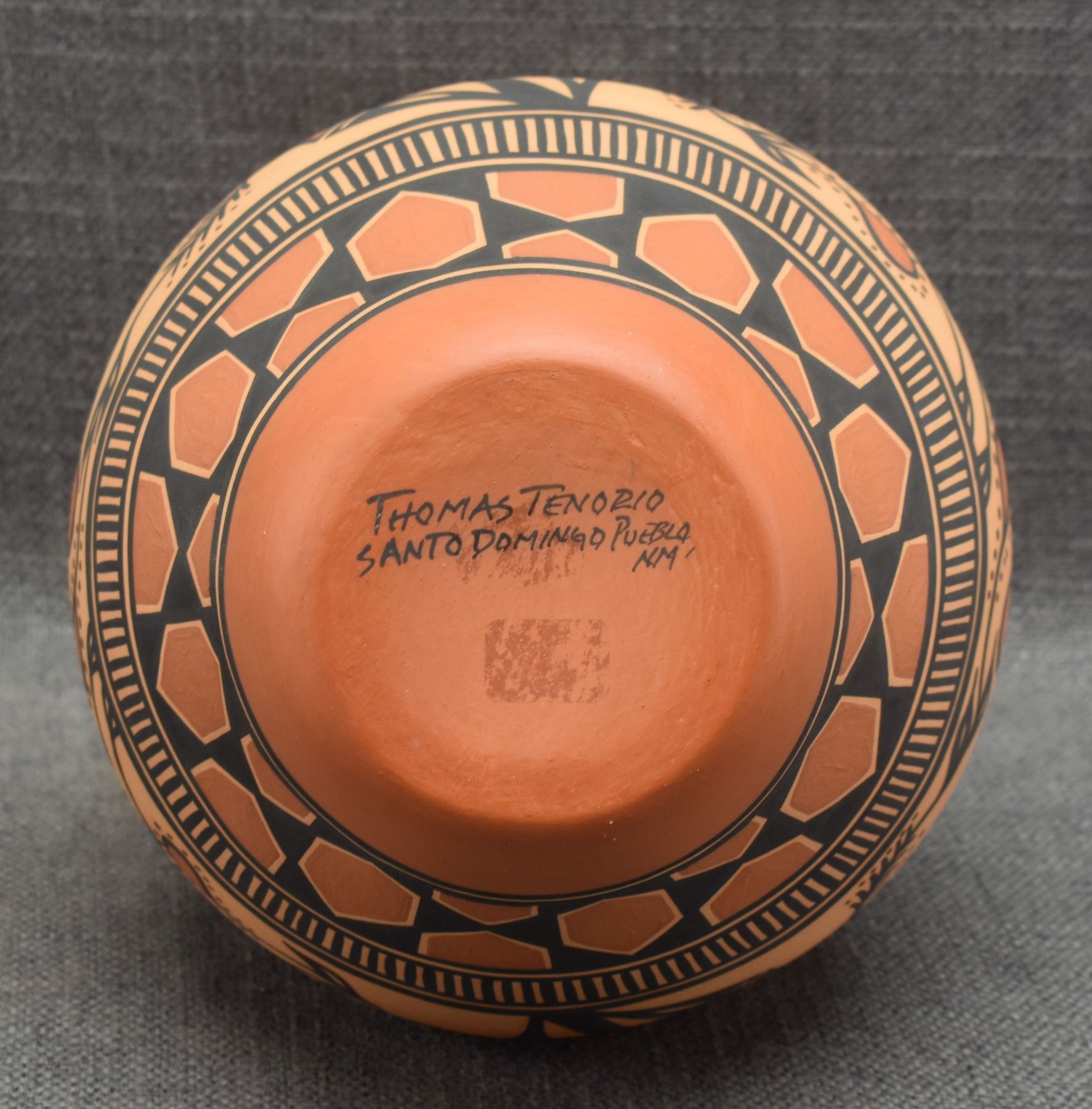 1990's Santo Domingo, hand coiled with carved and painted geometric and bird design by Thomas Tenorio 8" x 6.5"