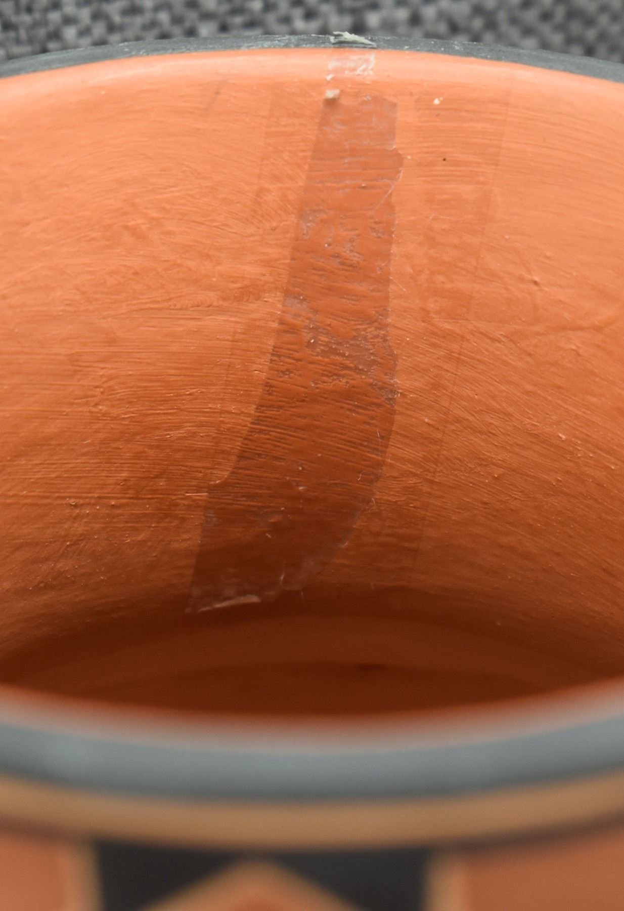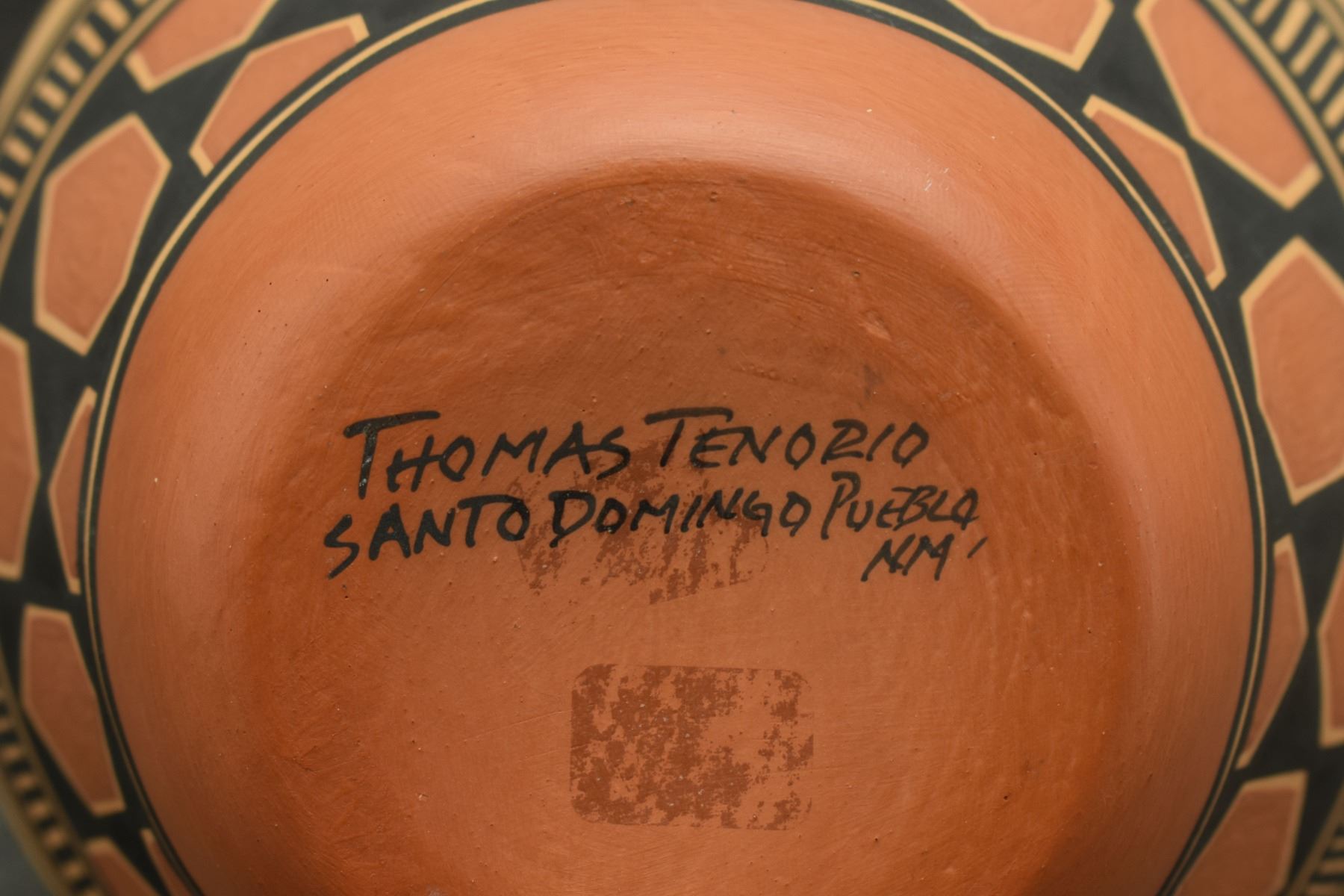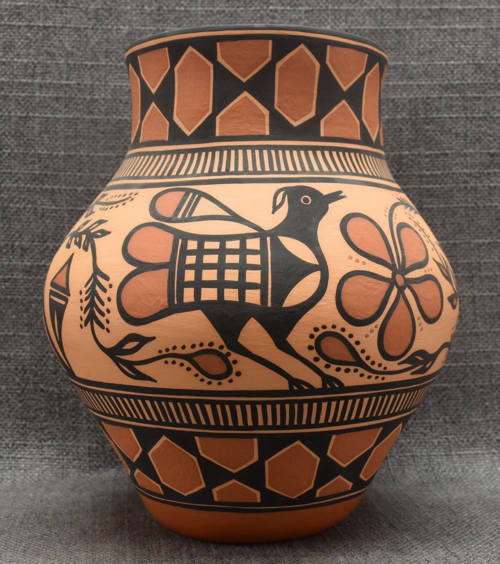 1990's Santo Domingo, hand coiled with carved and painted geometric and bird design by Thomas Tenorio 8" x 6.5"