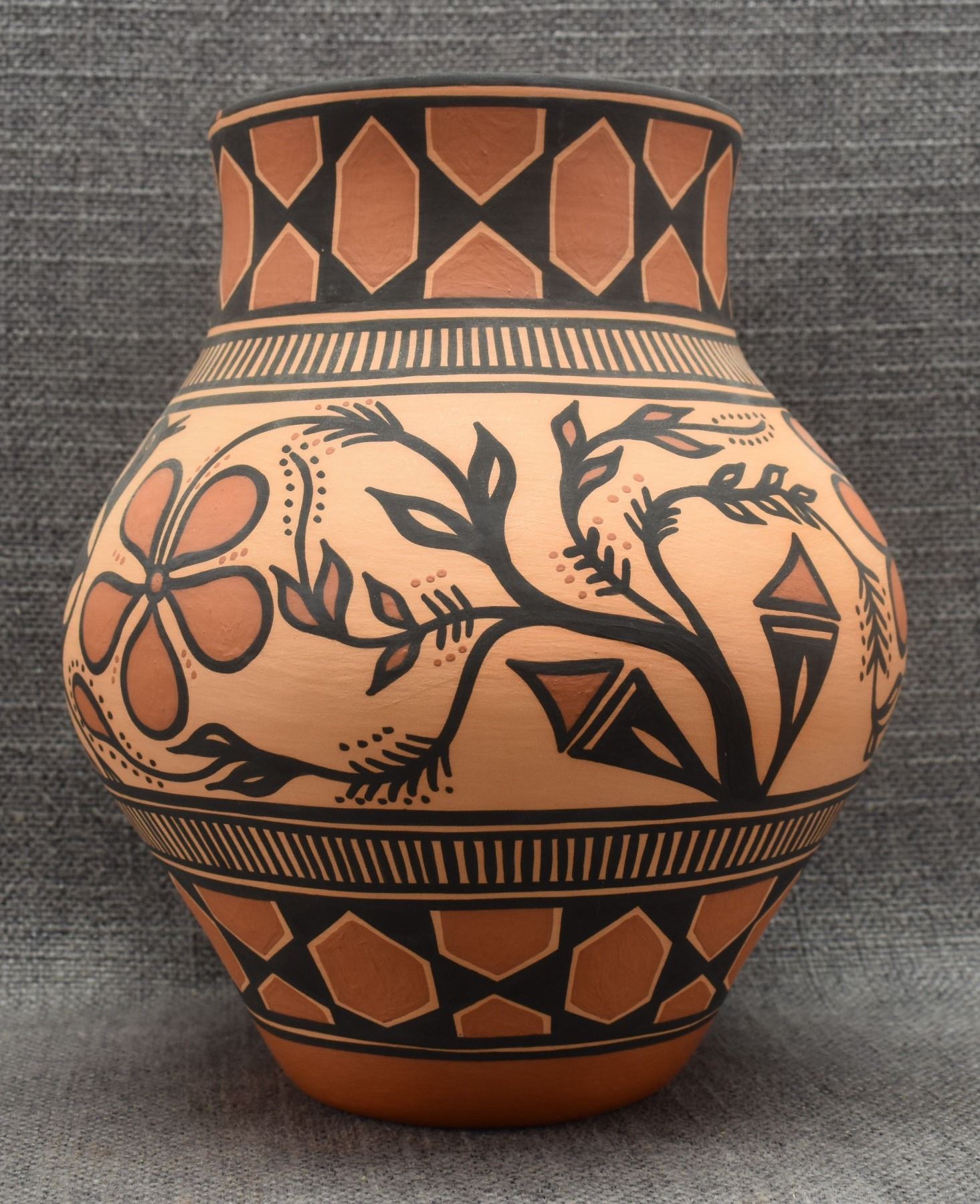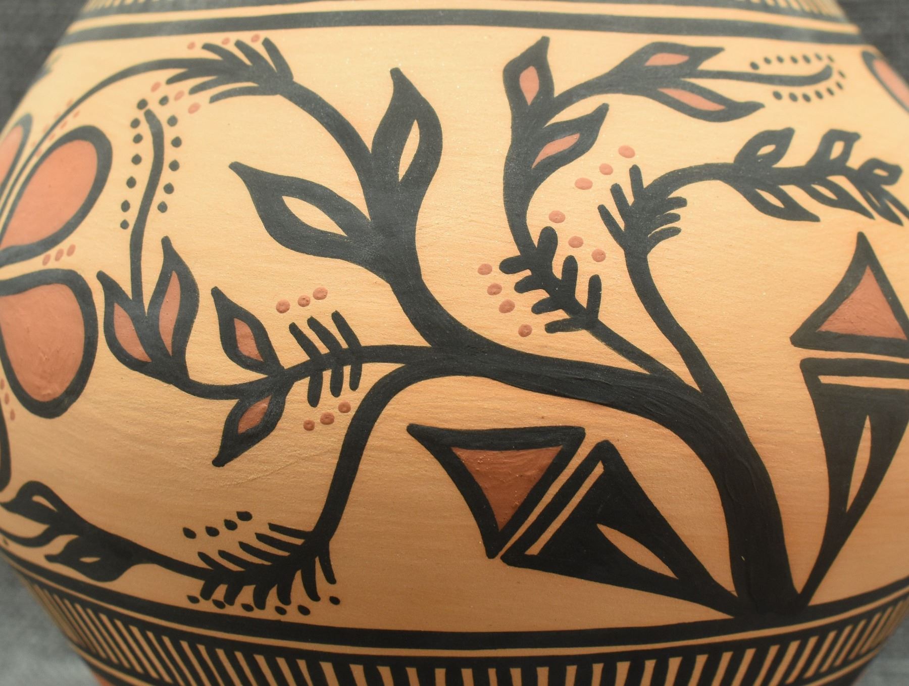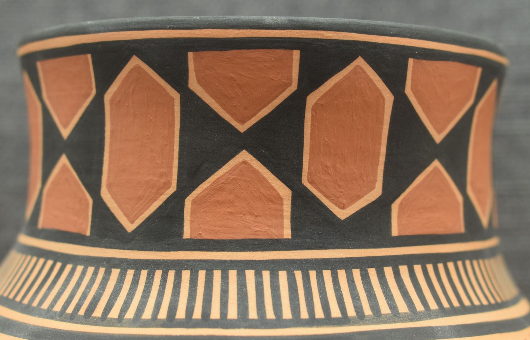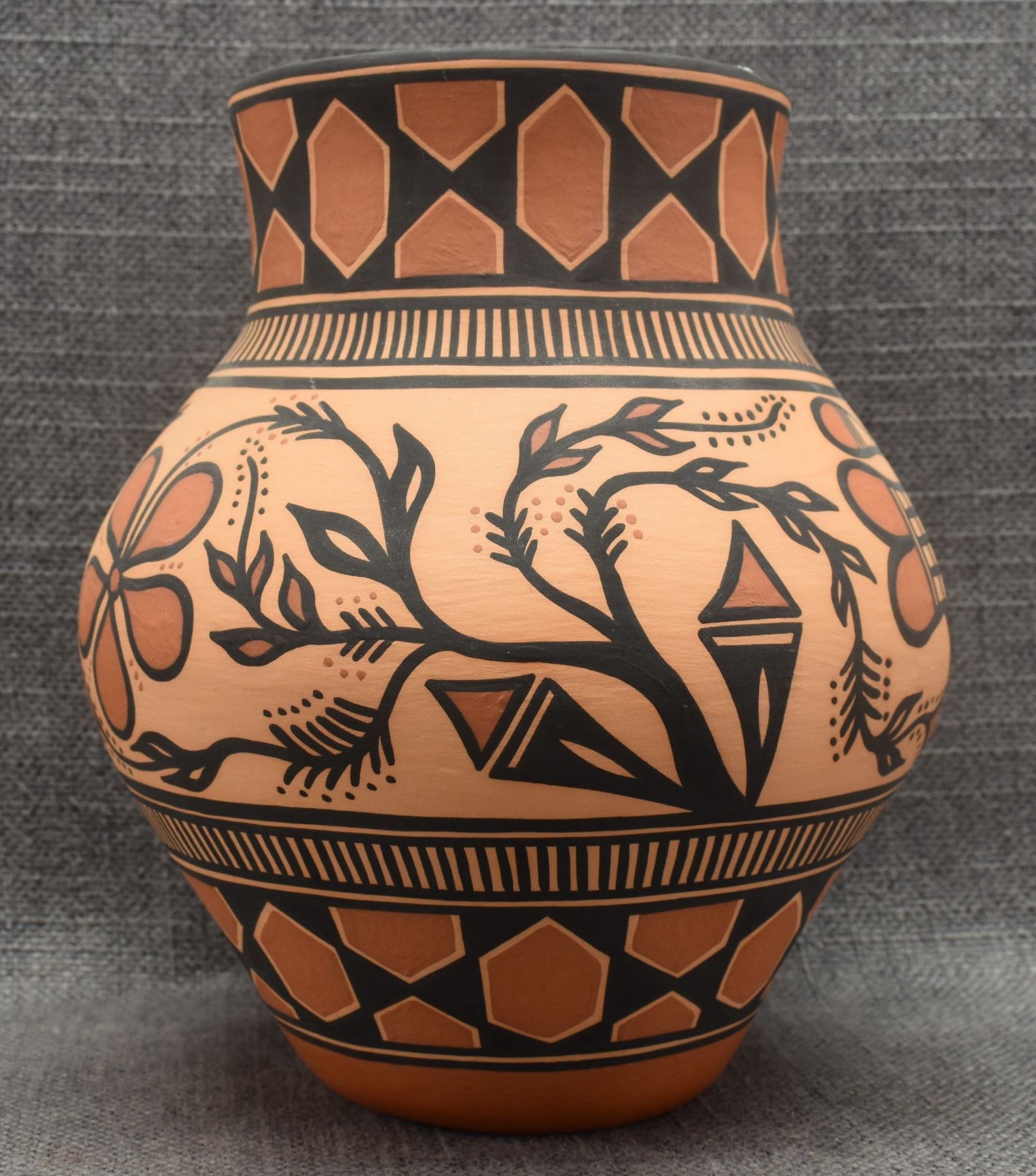 1990's Santo Domingo, hand coiled with carved and painted geometric and bird design by Thomas Tenorio 8" x 6.5"