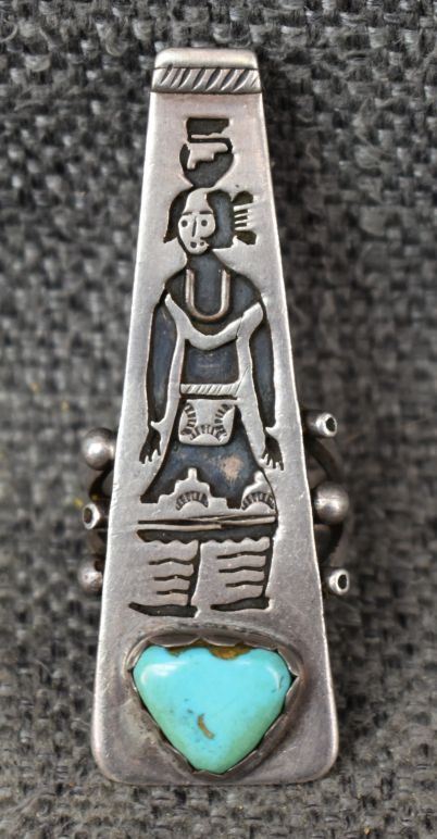 1960's Santo Domingo, sterling silver overlay pot maiden design with turquoise stone signed VA and hallmark for Vidal Aragon 2.25" x .75" size 6.5, total weight 14 grams
