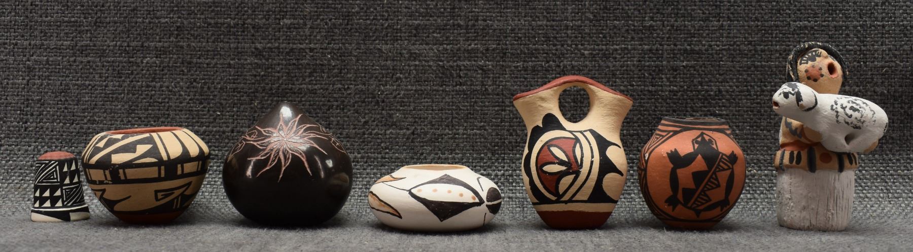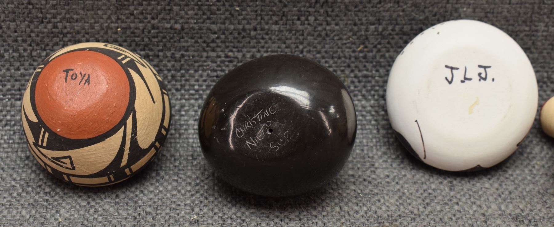 1990's-2000's pottery items Jemez wedding vase signed R.C., Jemez jar signed Toya Jemez pottery figure signed Cindy Fragua. Santa Clara sgraffito seed jar signed C Neito, two Acoma potter jars signed B. A. and J. L. J, Acoma pottery thumble.3.75"x 2"