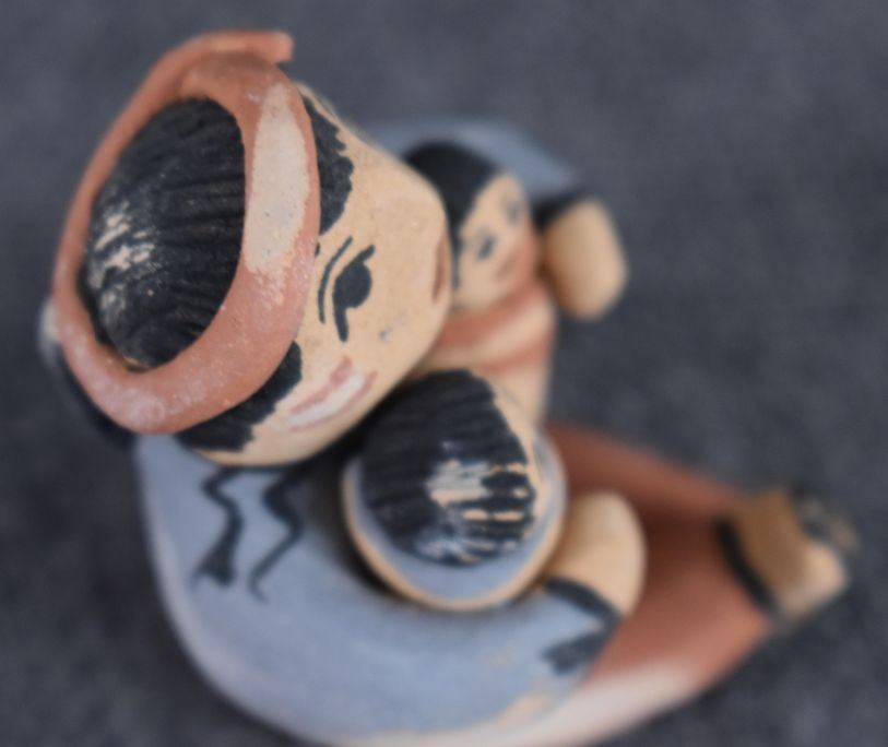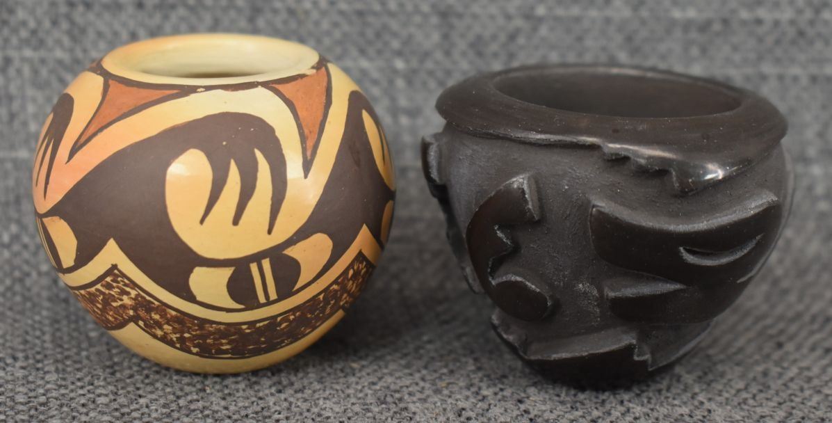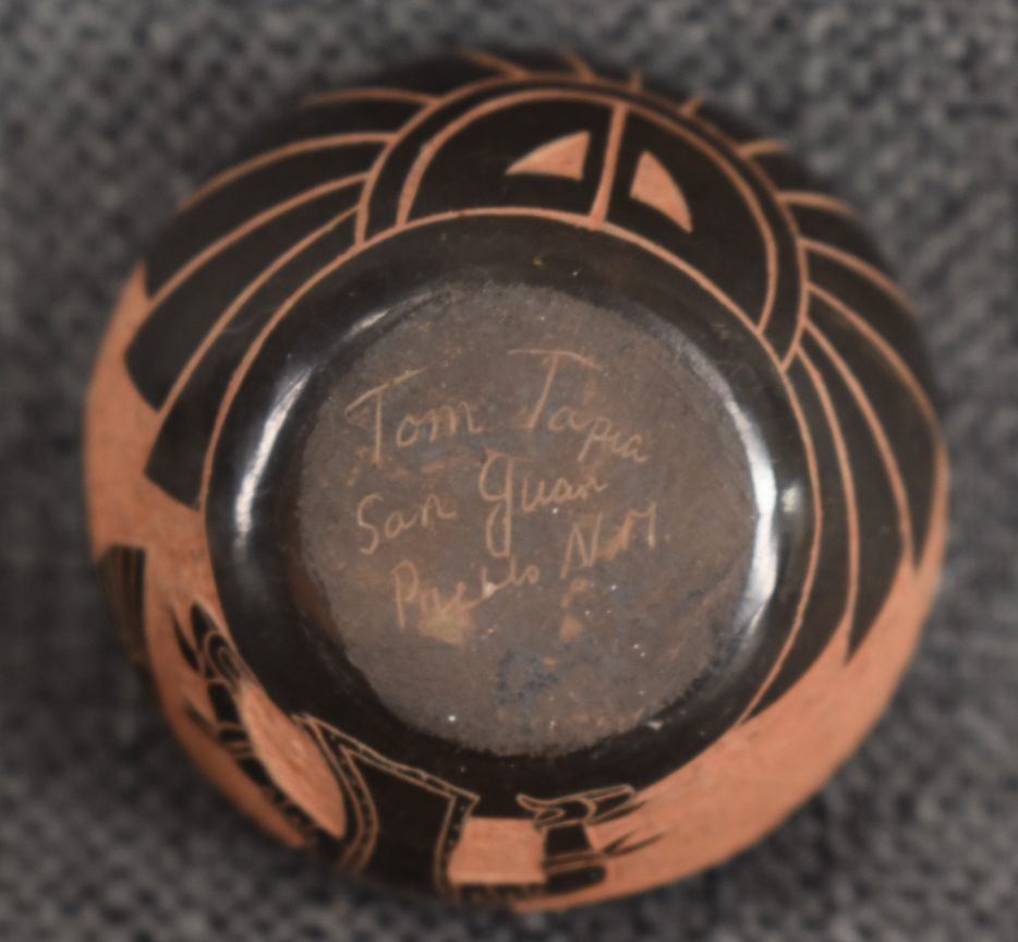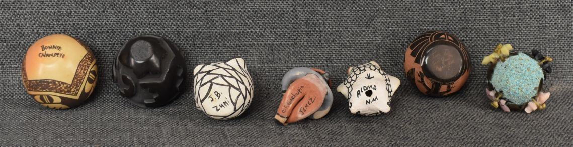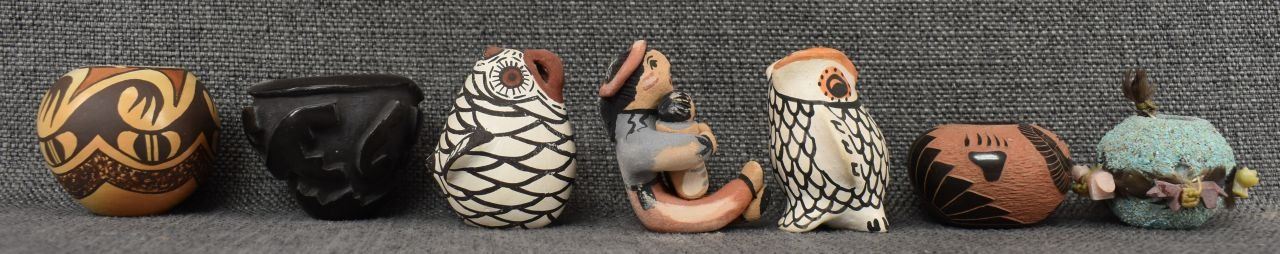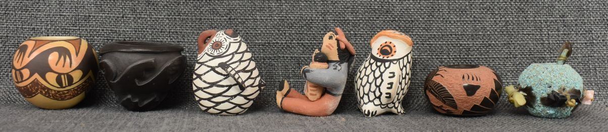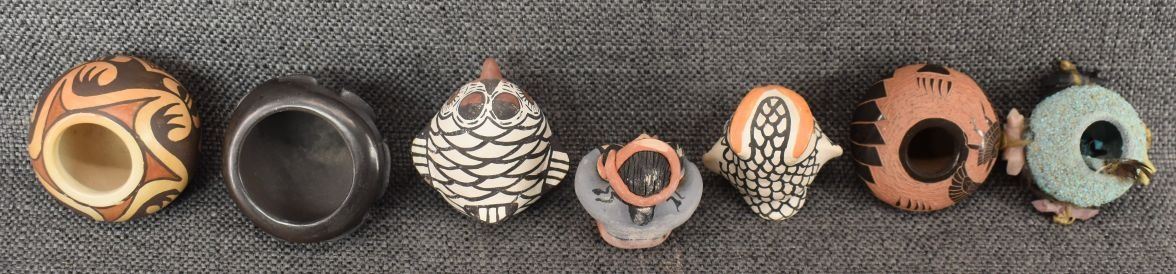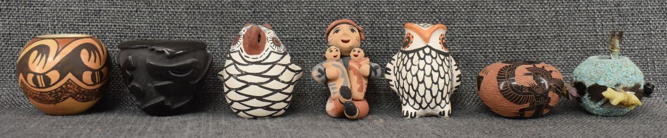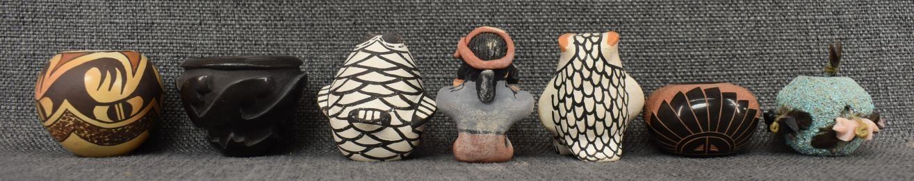 Hand coiled. Hopi polychrome bowl signed Bonni Nampeyo, San Juan Sgraffito pottery seed jar signed tom topia, Zuni fetish pot, Santa Clara vase signed victor an Naomi elckleberry, Jemez pottery story teller, Acoma owl, Zuni owl signed J.B. 2" x 2"