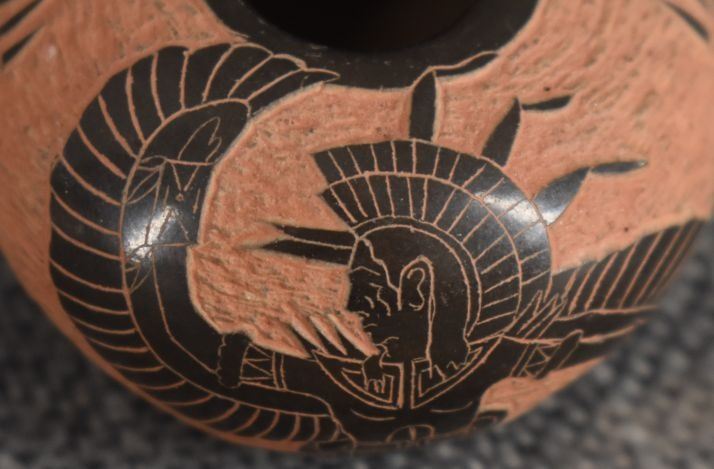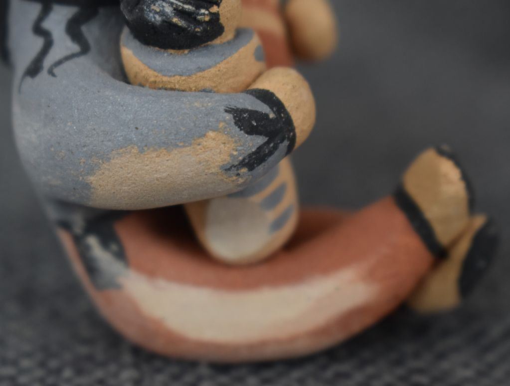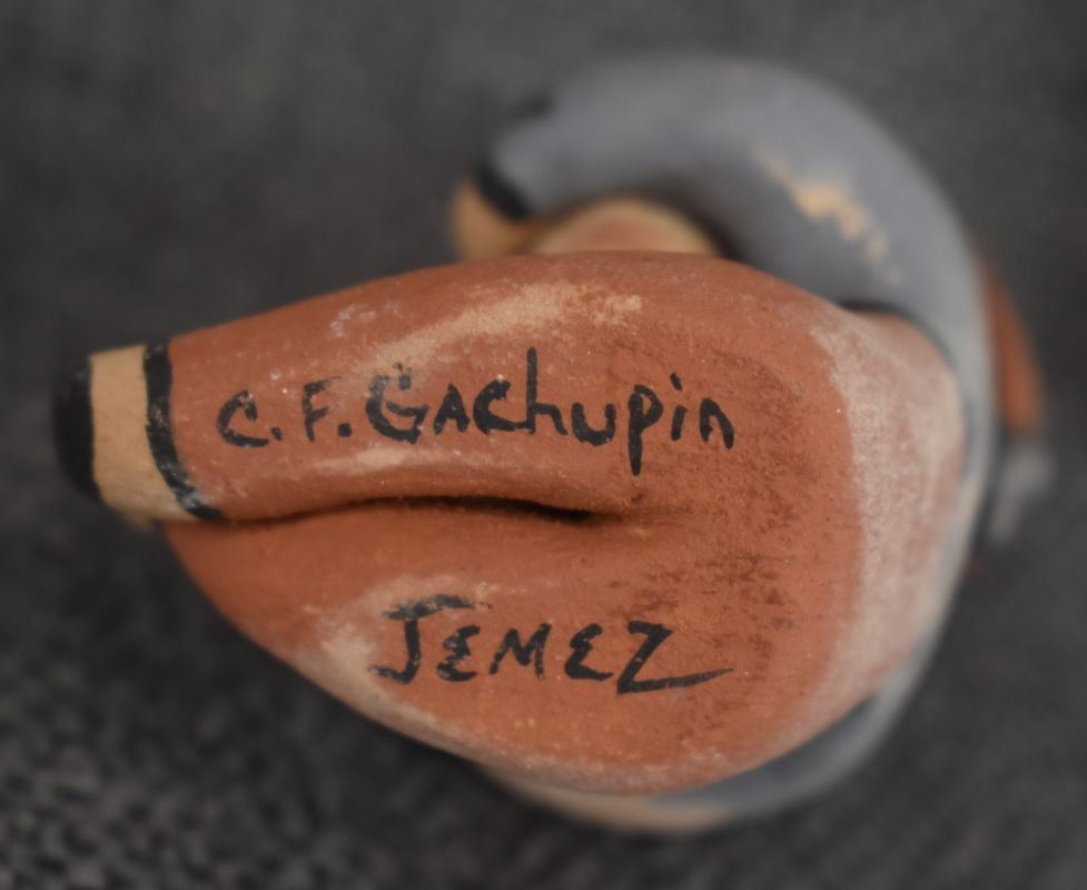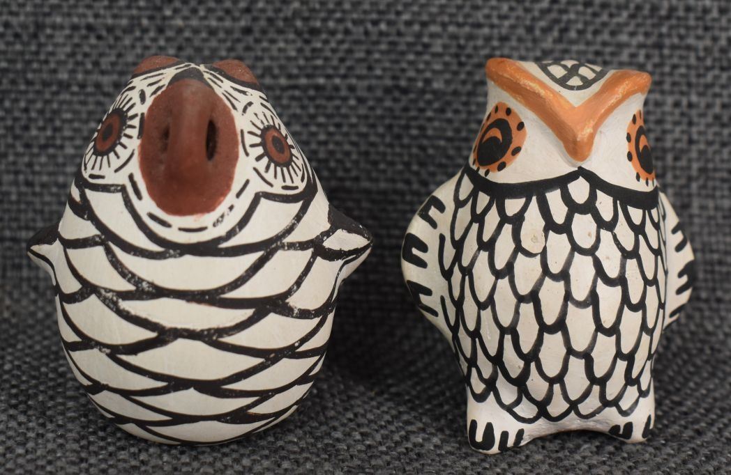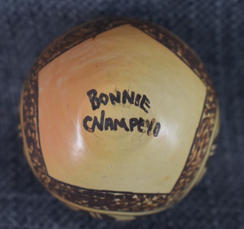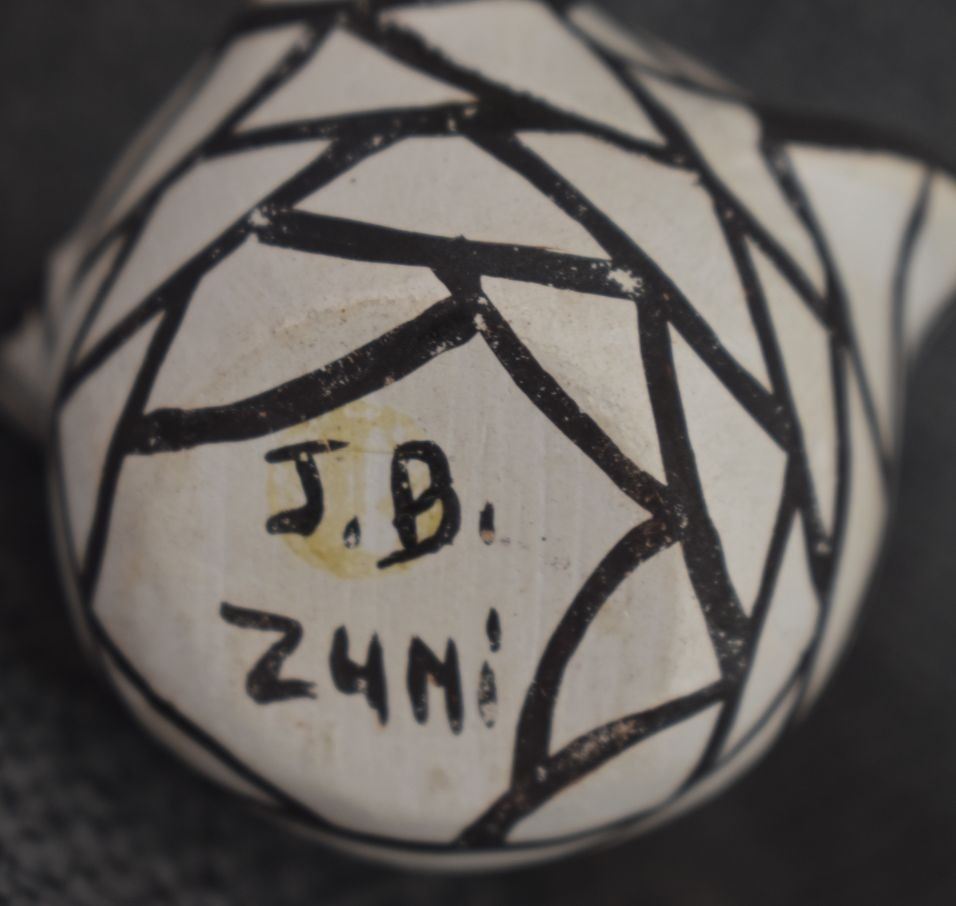 Hand coiled. Hopi polychrome bowl signed Bonni Nampeyo, San Juan Sgraffito pottery seed jar signed tom topia, Zuni fetish pot, Santa Clara vase signed victor an Naomi elckleberry, Jemez pottery story teller, Acoma owl, Zuni owl signed J.B. 2" x 2"
