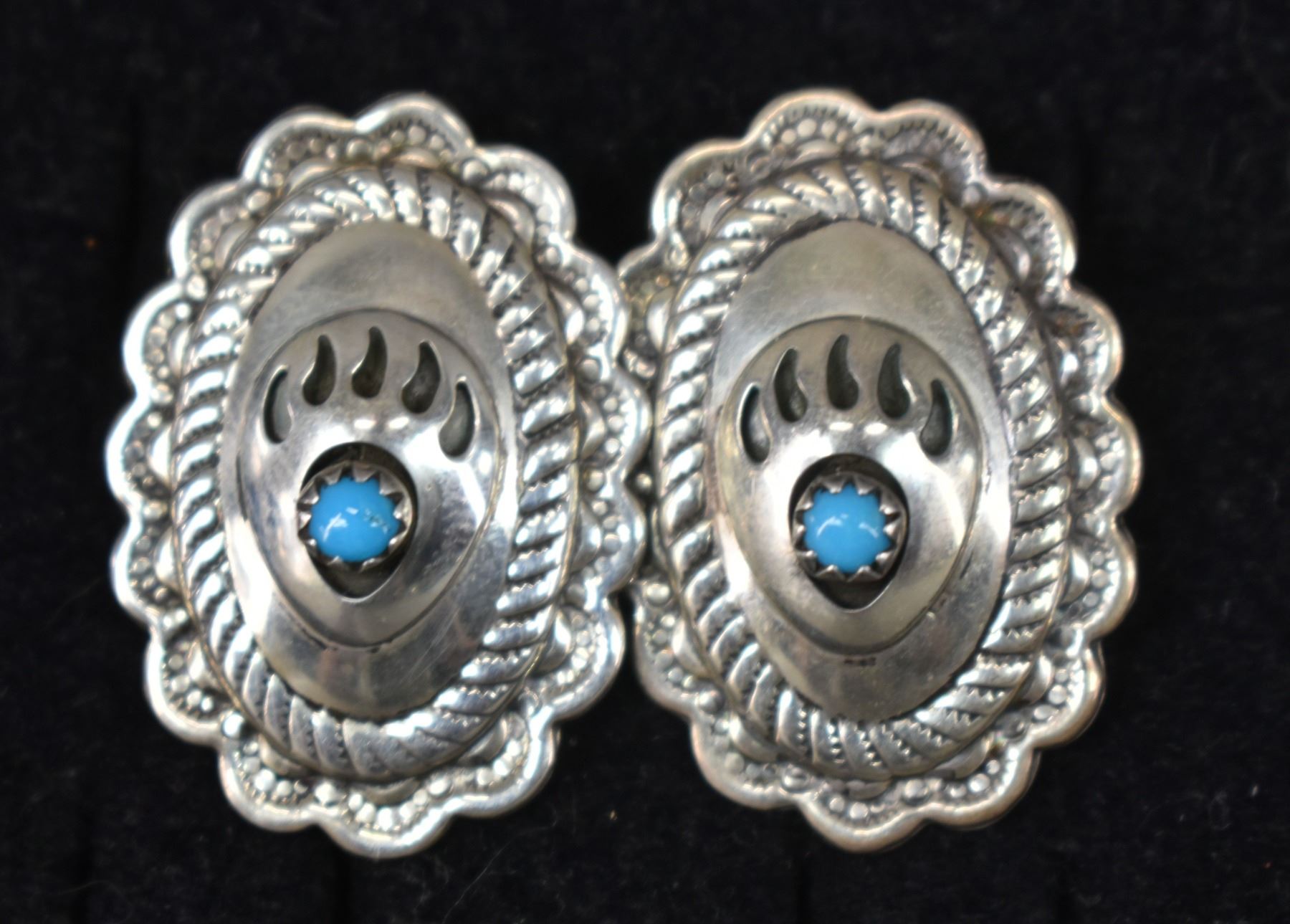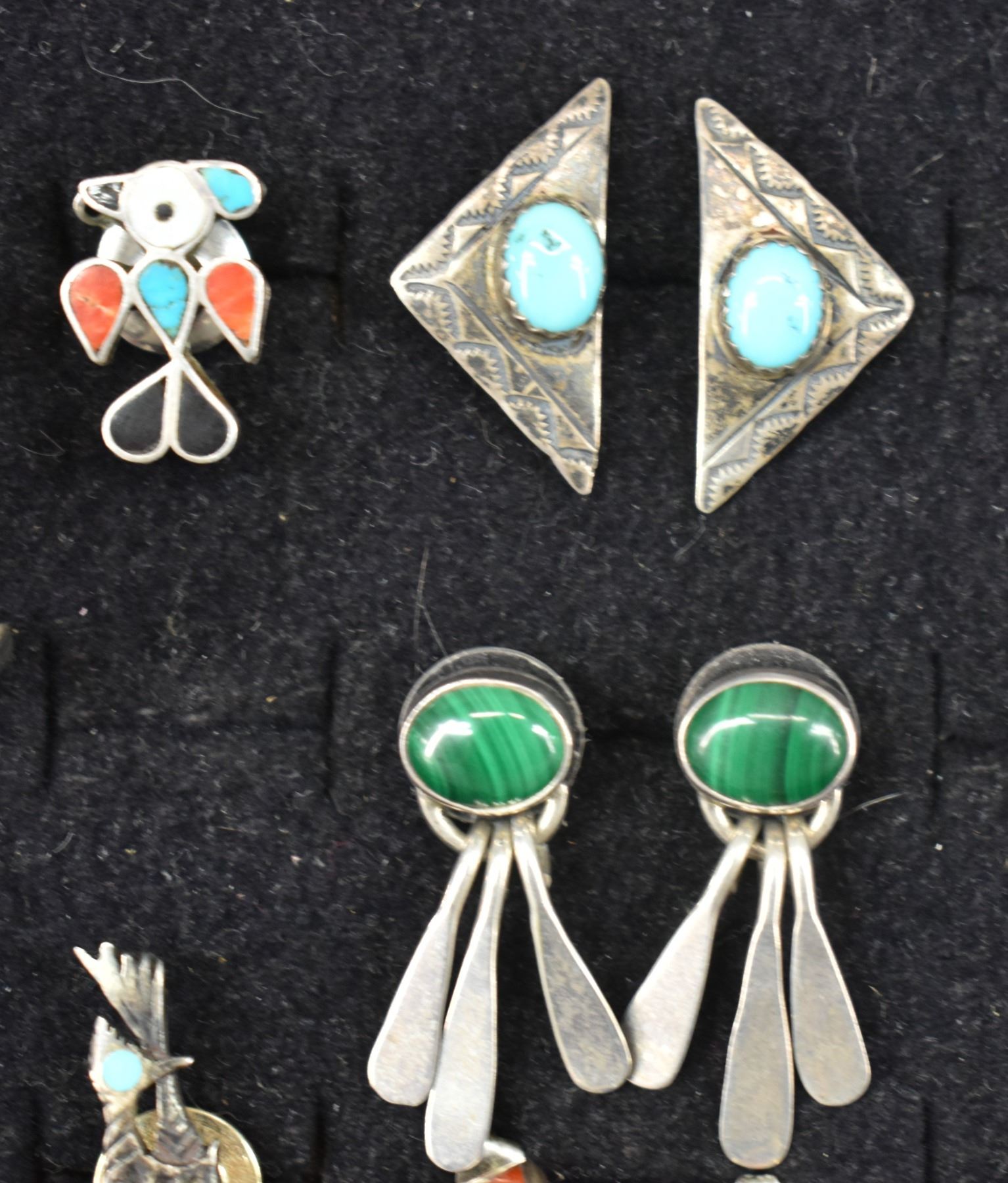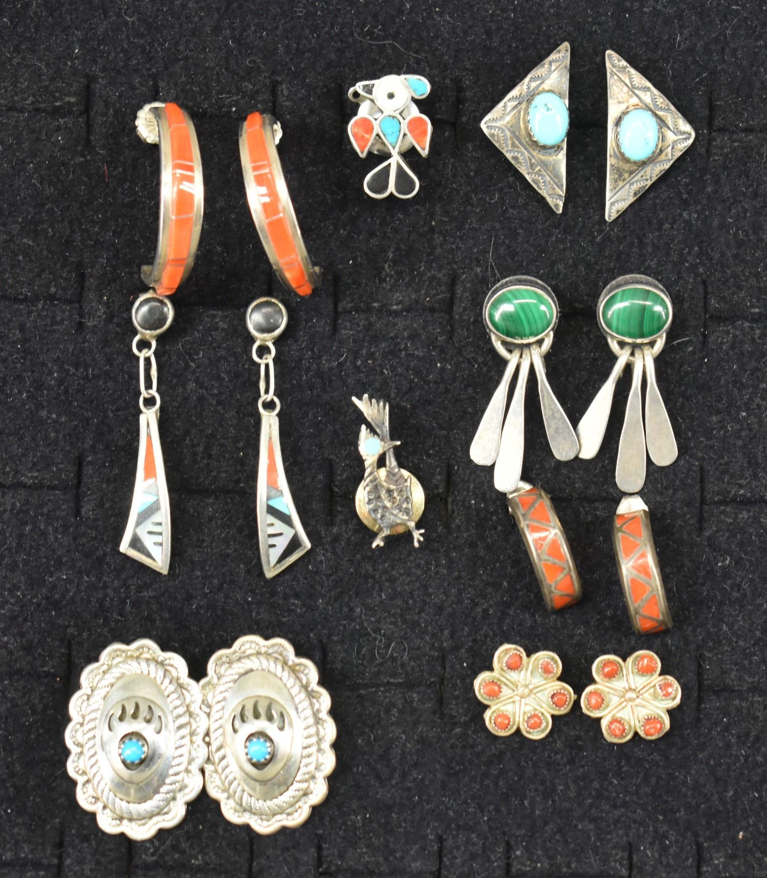 20th century native and Mexican made sterling silver earrings earrings an pins. largest 1" x .75" 35 grams