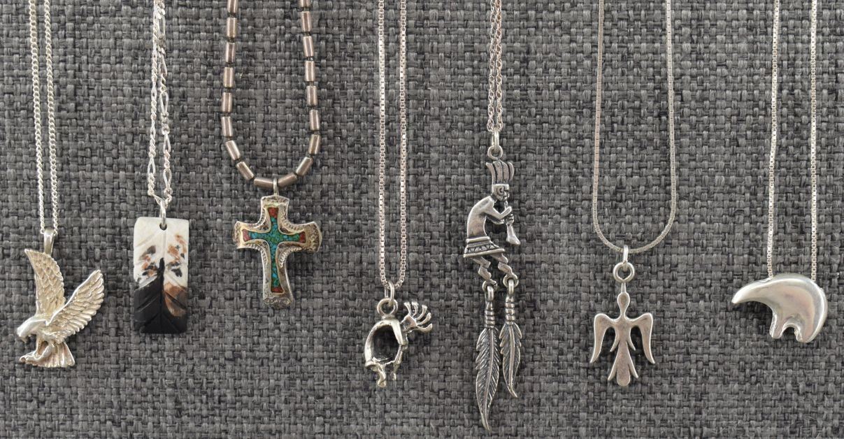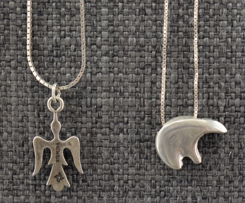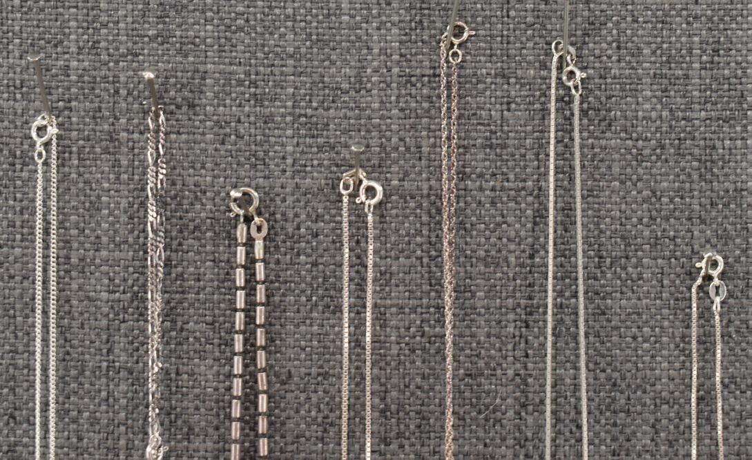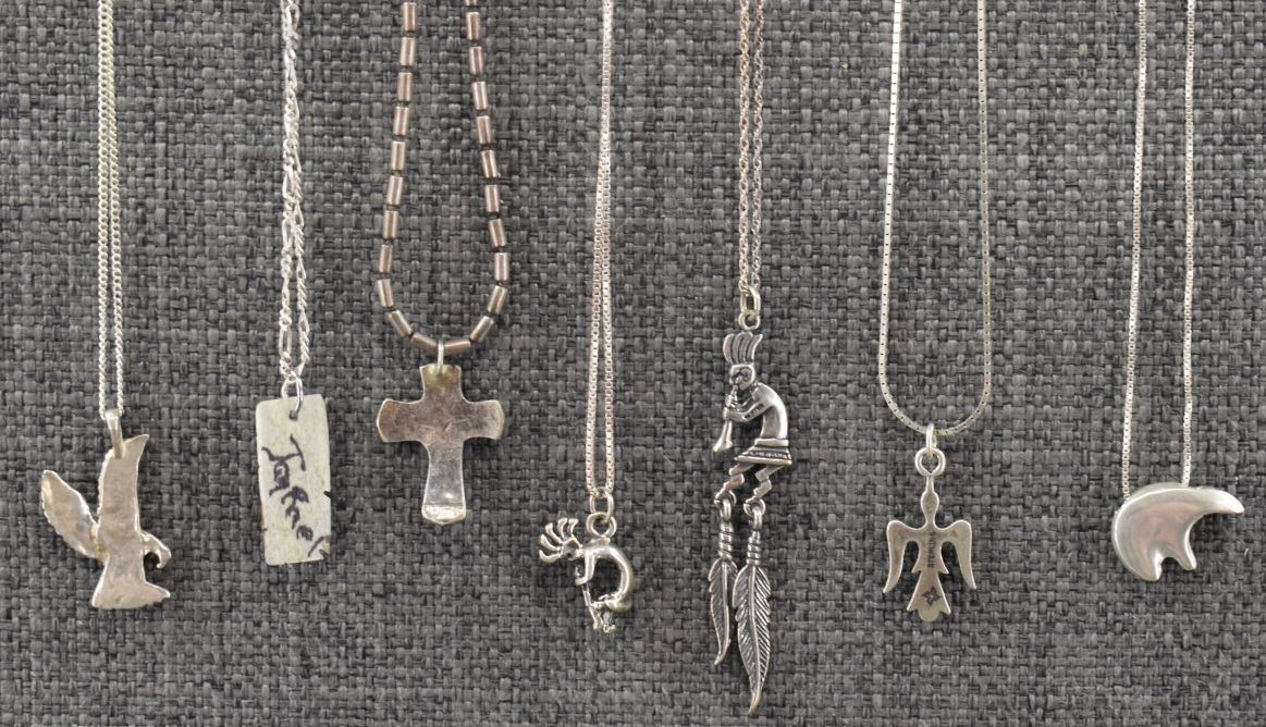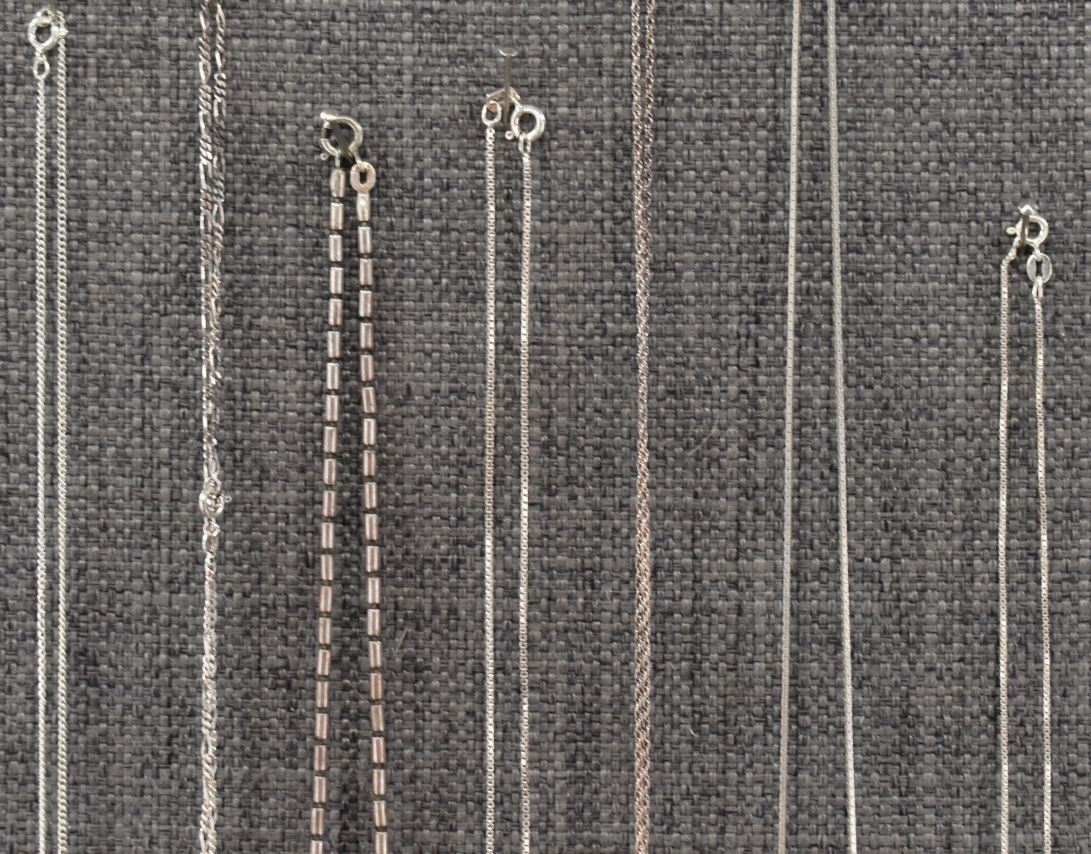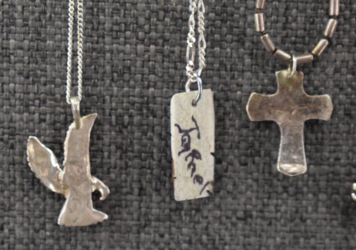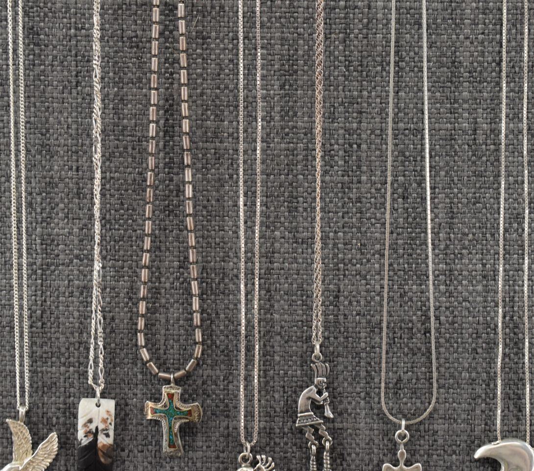 seven sterling silver necklaces with pendants. Six sterling silver pendants one wood pendant total weight 40 grams