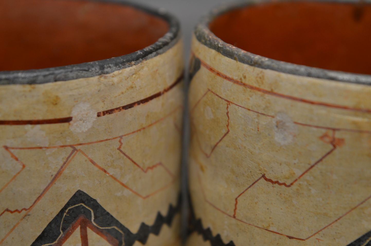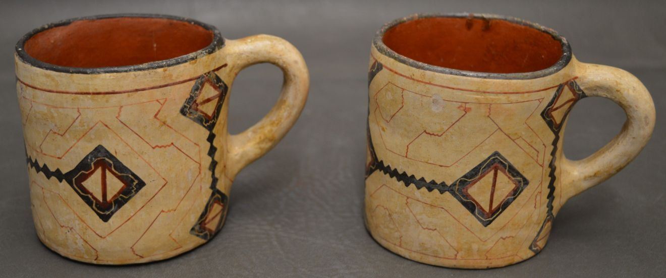 vintage Shipibo Indian, hand coiled and painted design pottery mugs . 3.5'' x 4.5''