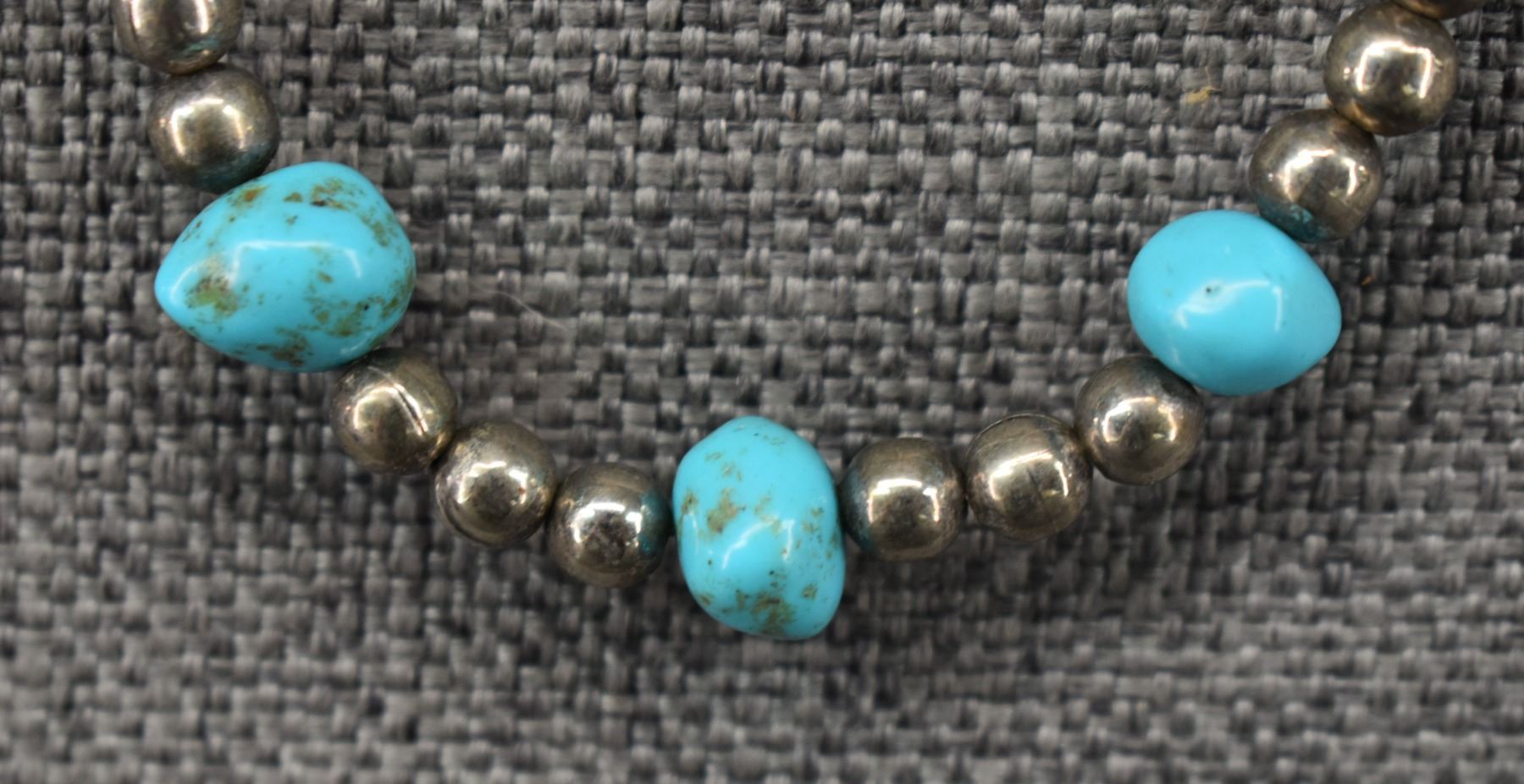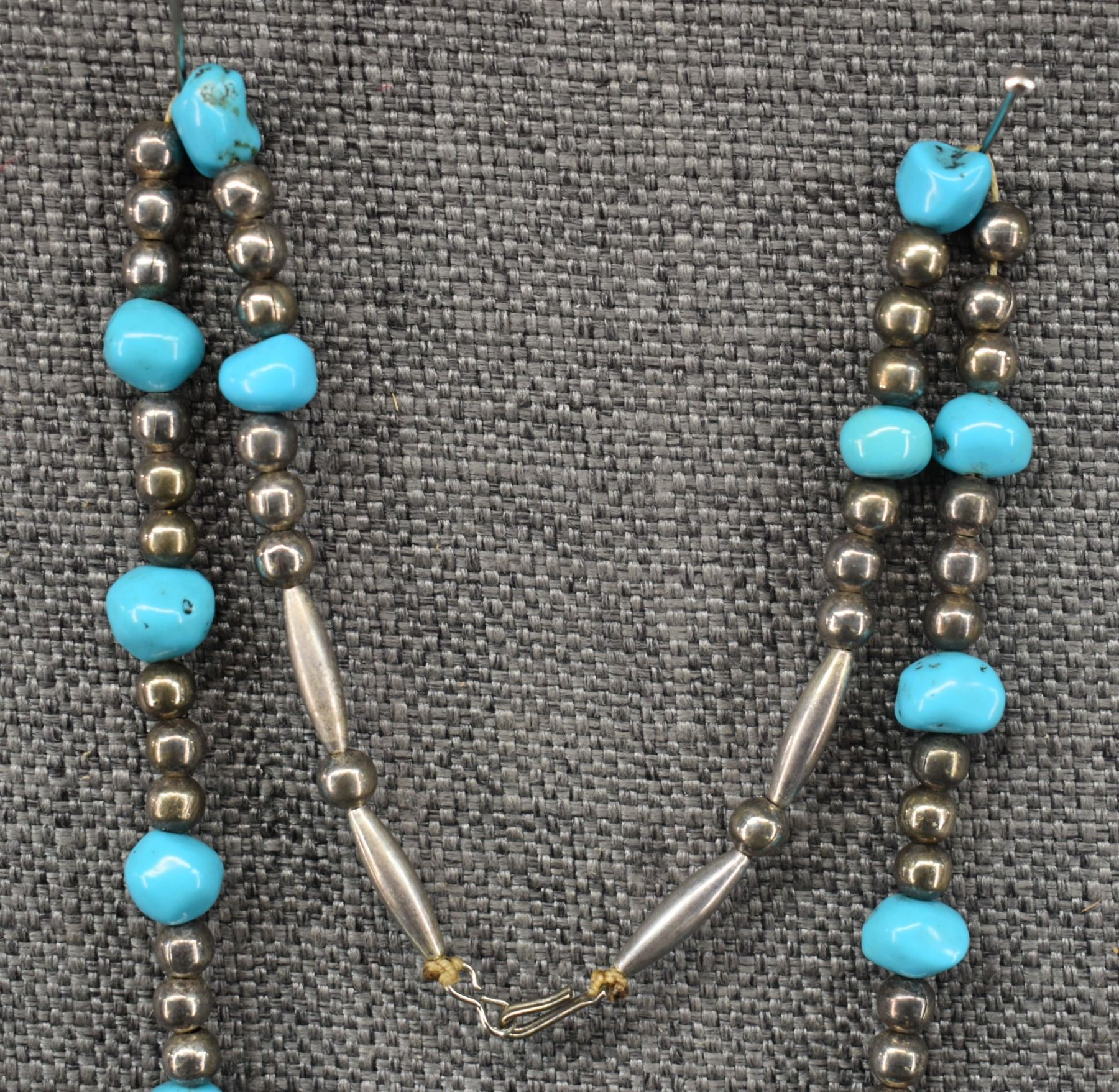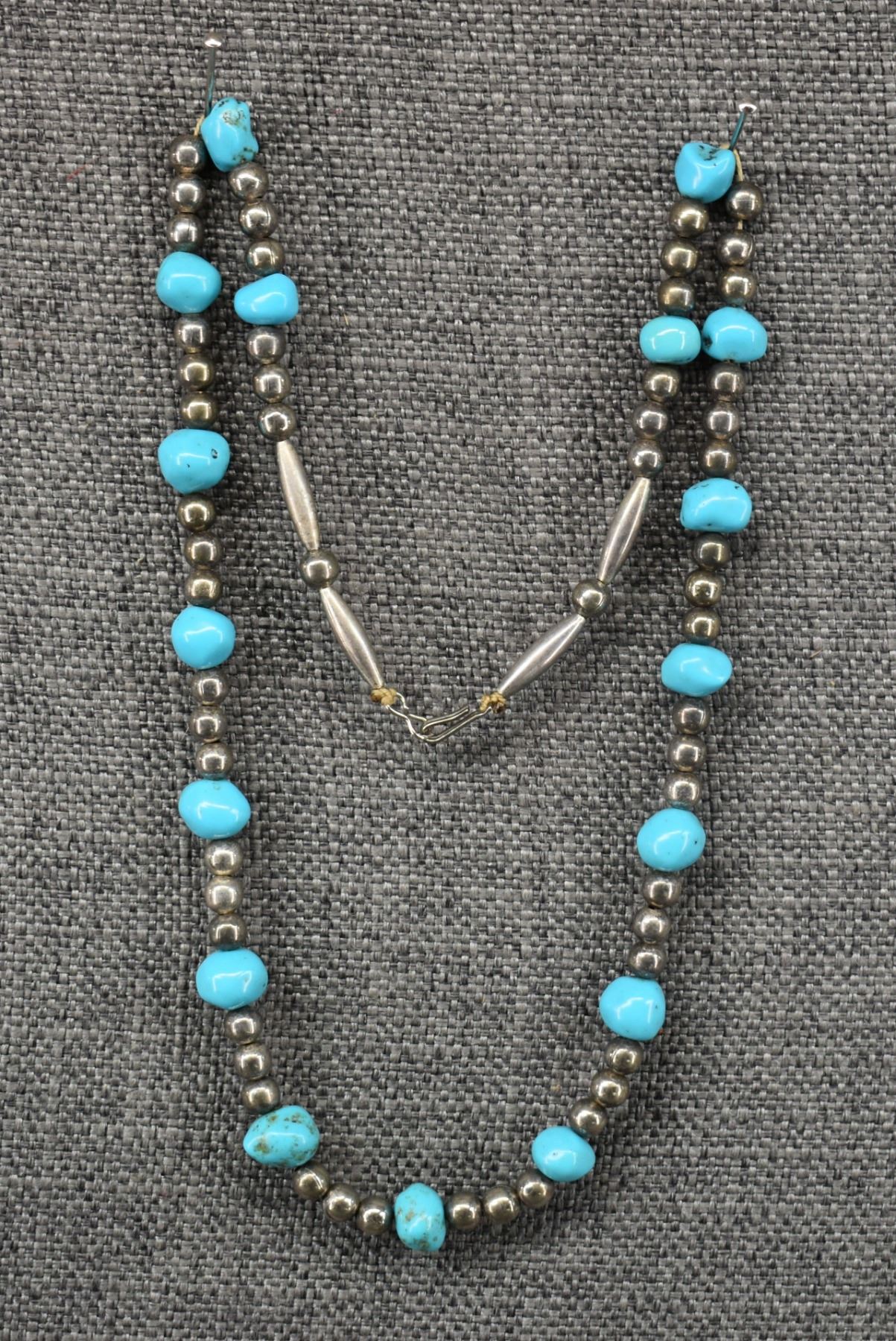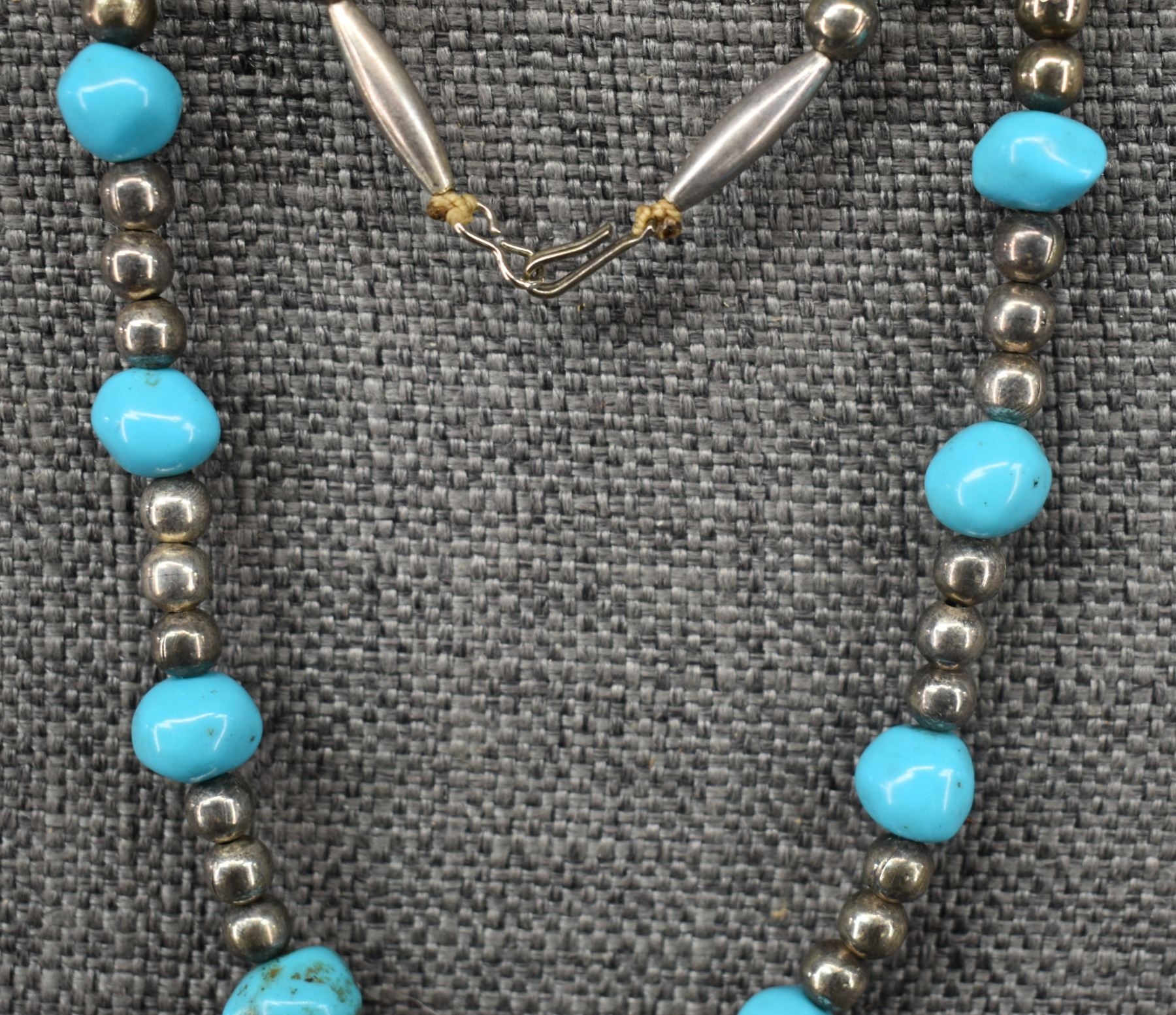 vintage single strand sterling silver and turquoise beads 23" long total weight 52 grams