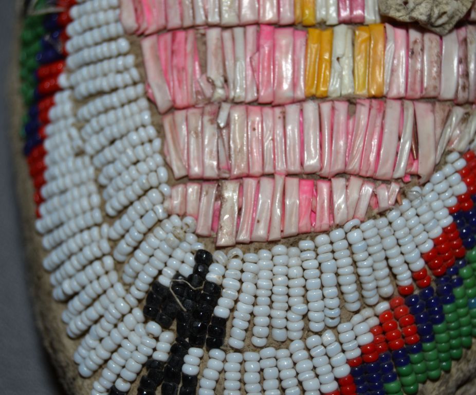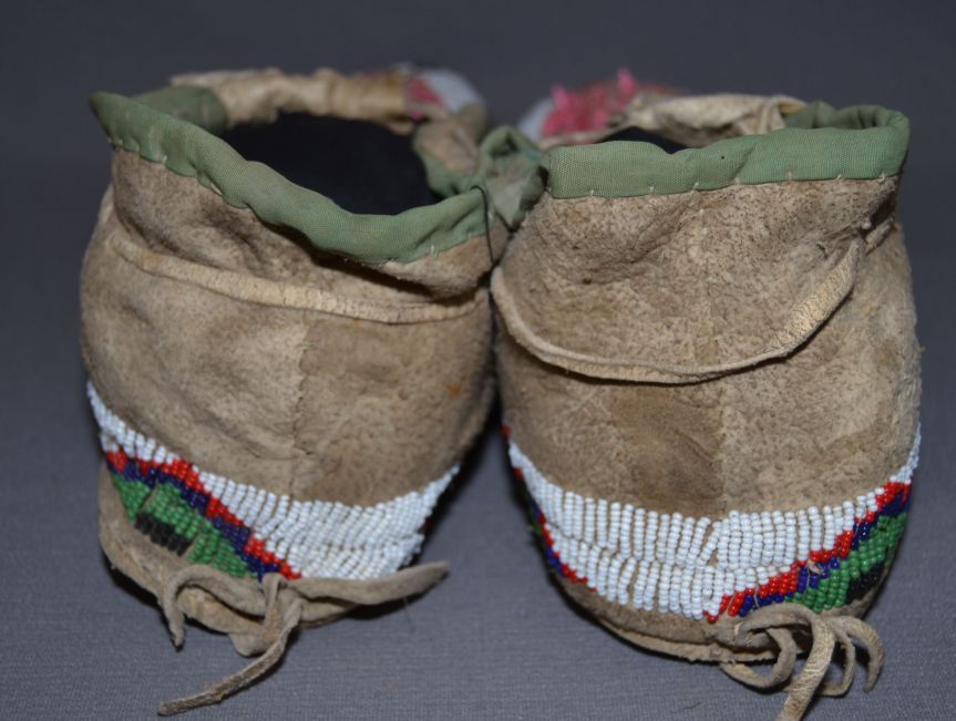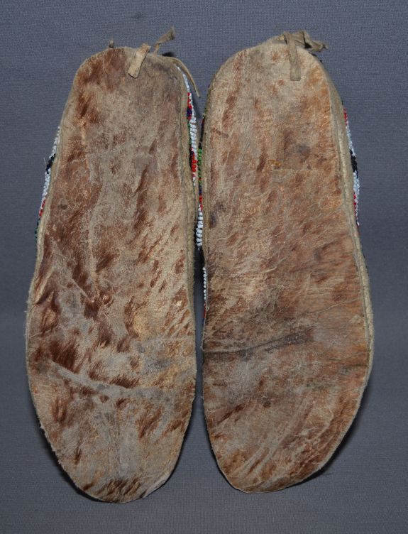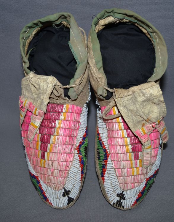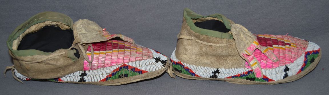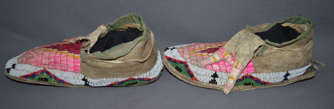 1930-40s par fleche soles, quilled and beaded, minor loss of quill and beads, 4" x 10"