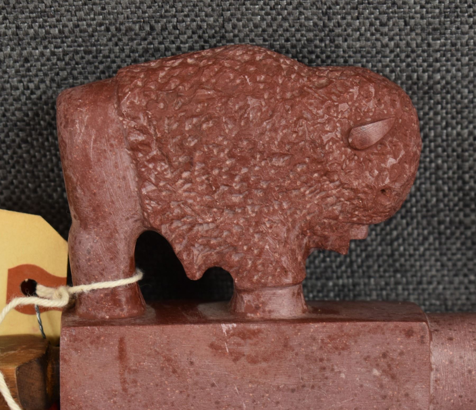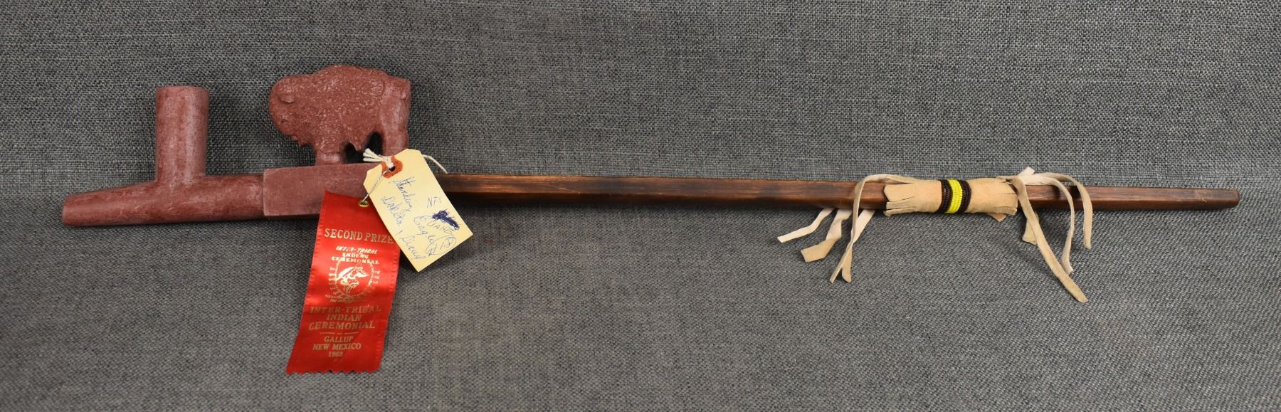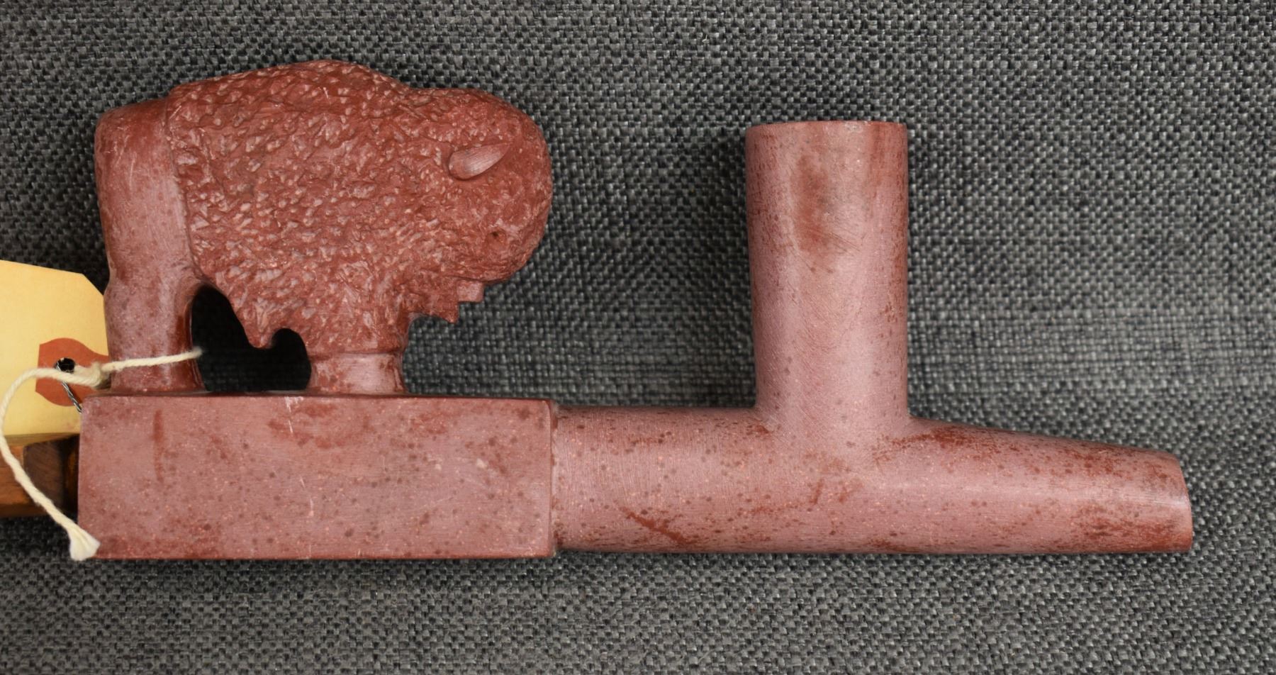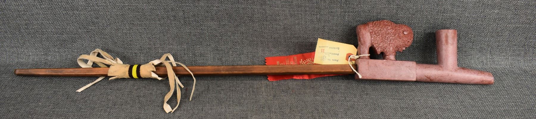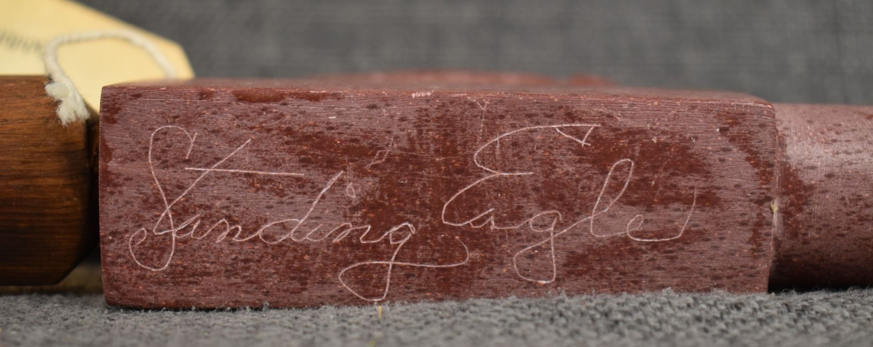 1960's Sioux. Pipe stone pipe bowl signed Standing Eagle. 4'' x 8.5'' x 1.25'' wooden stem 23'' long