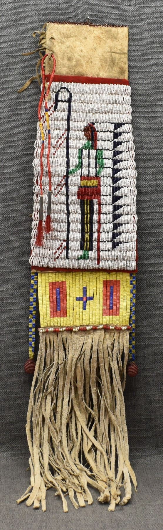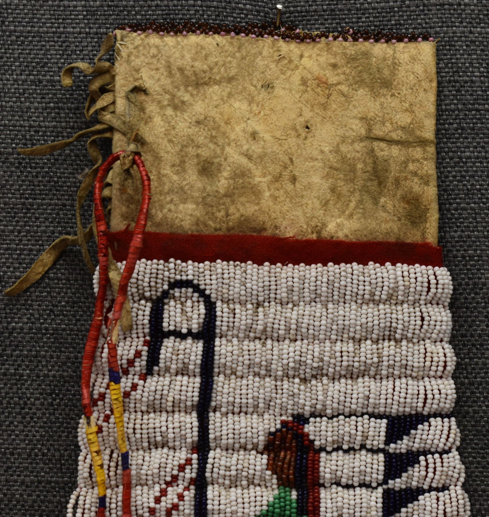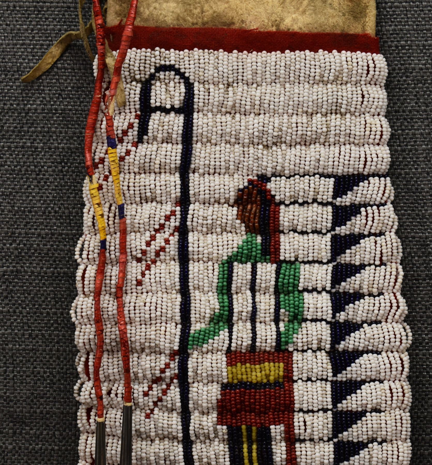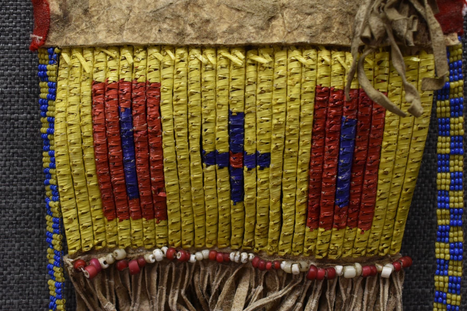 20th century Sioux. Thread sewn beaded and quilled pictorial design on native tanned leather. Tabacco bag. 28'' x 6''