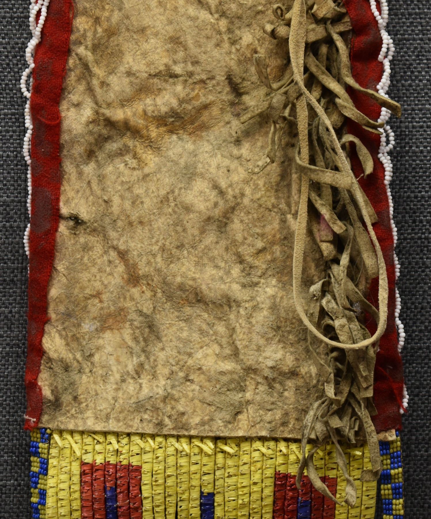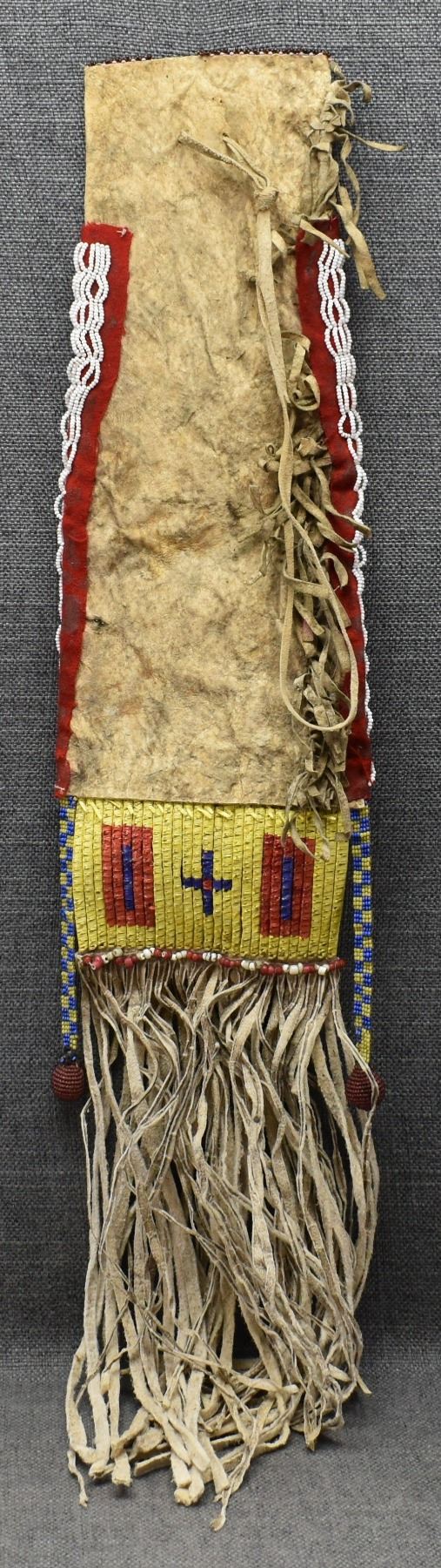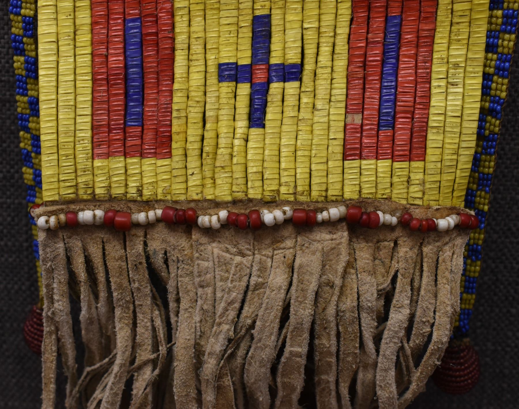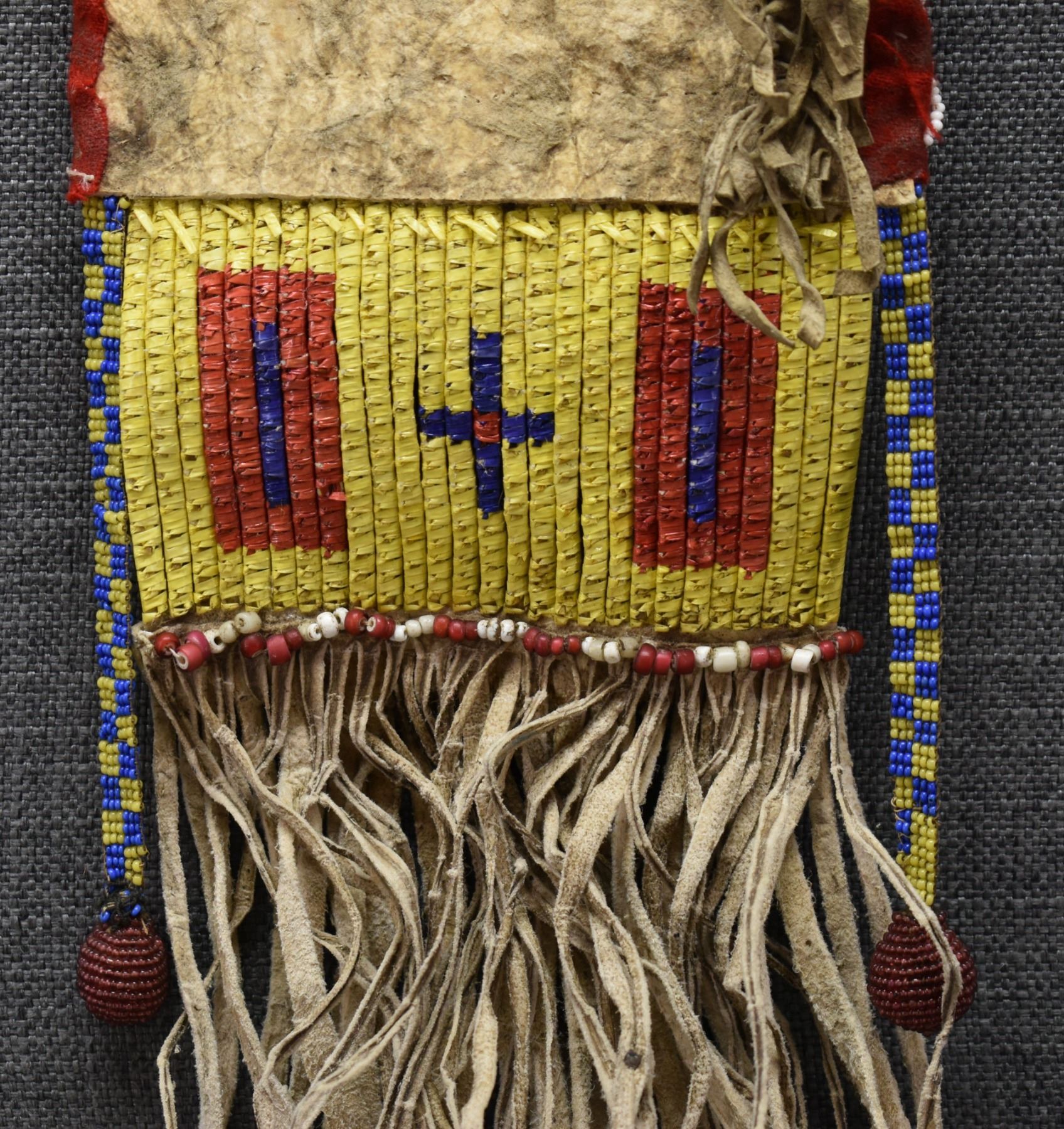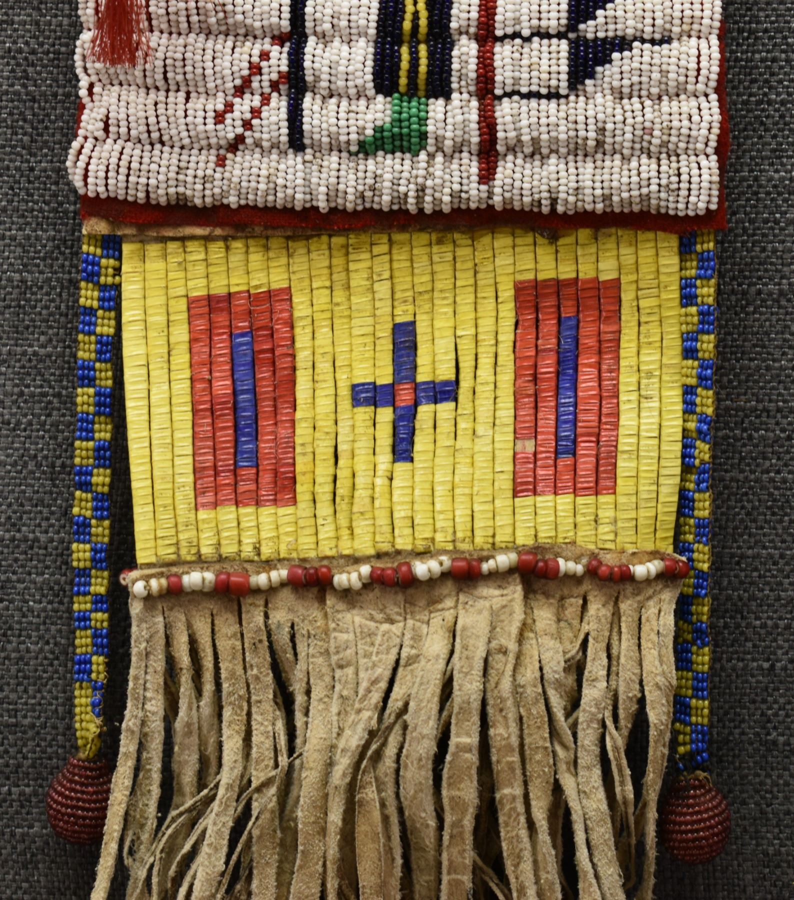 20th century Sioux. Thread sewn beaded and quilled pictorial design on native tanned leather. Tabacco bag. 28'' x 6''